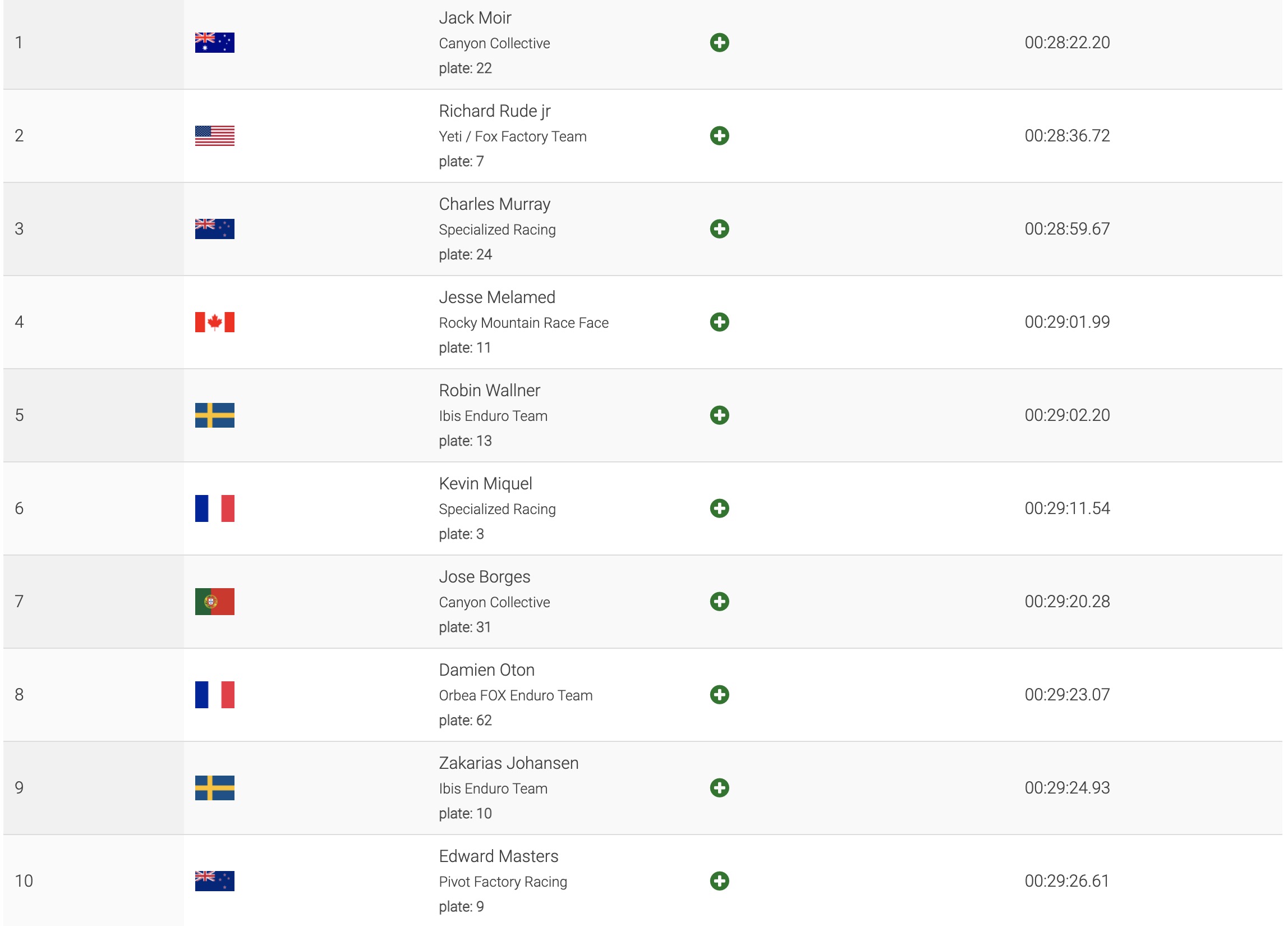 Les compteurs sont remis à zéro, balle au centre. Alors, Jack Moir ou Richie Rude ? Eh bien, Jack Moir ne va pas laisser passer sa chance de remporter une première victoire en Enduro World Series. Il va littéralement atomiser la concurrence dans cette Queen Stage : 7 secondes plus rapide que Jose Borges (2e), mais surtout… 14 secondes de mieux que Richie Rude (3e) ! Mercredi, la victoire s’était jouée à moins d’une seconde, mais aujourd’hui, Jack Moir était de loin le plus fort.