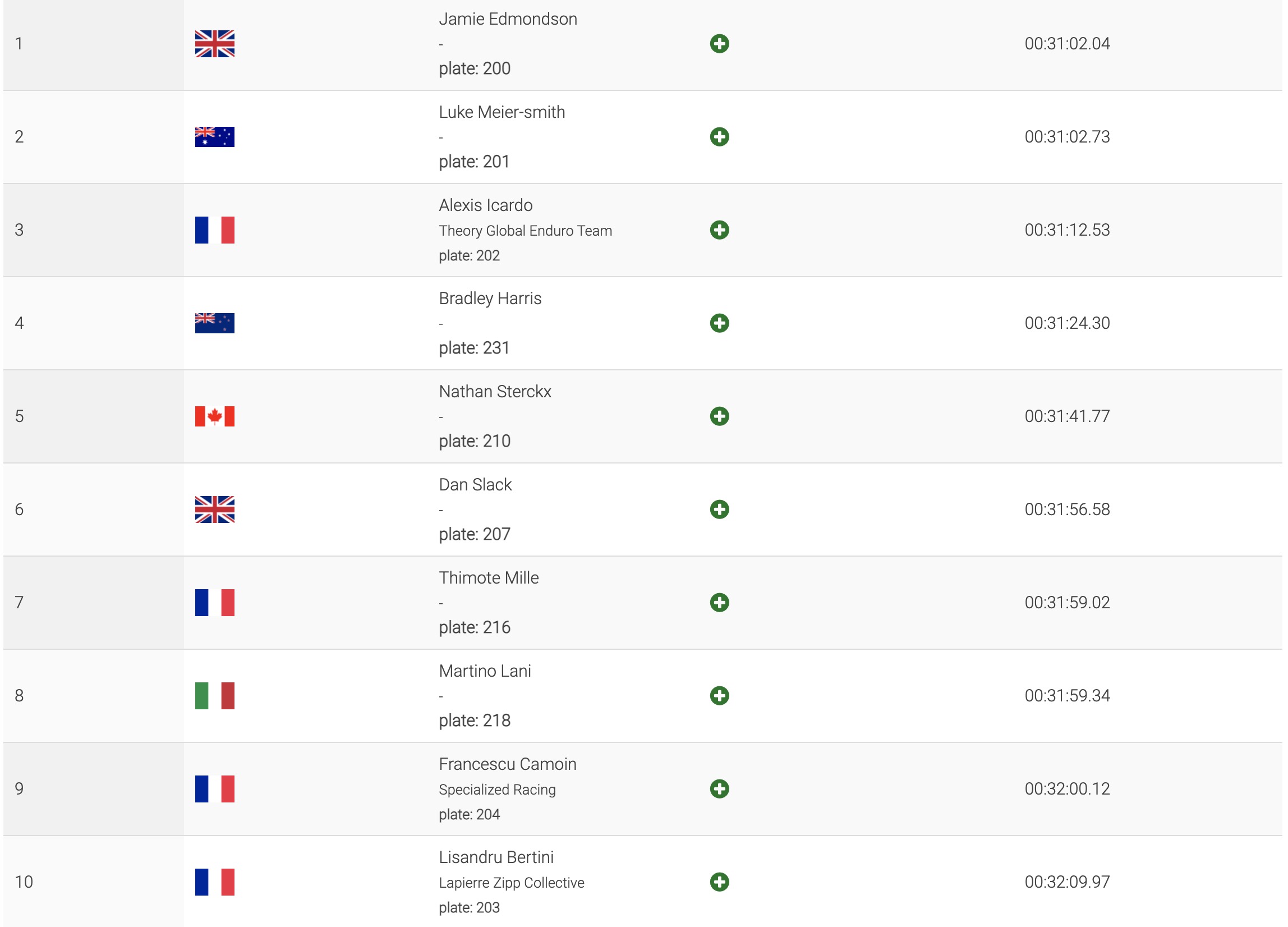 Du côté des U21, on prend les mêmes et on recommence, en tout cas pour les deux premières places. Comme lors de la 1ère manche, c’est en effet à nouveau le Britannique Jamie Edmondson qui s’impose ce samedi pour à peine 69 centièmes de seconde, devant l’Australien Luke Meier-Smith. Du changement sur la 3e marche du podium par contre, où un jeune Français en remplace un autre ! Francescu Camoin avait pris la 3e place mercredi mais termine seulement 9e aujourd’hui, cette fois c’est Alexis Icardo qui parvient à monter sur le podium. Il a terminé en beauté et signant le meilleur temps sur la dernière spéciale, la Queen Stage.