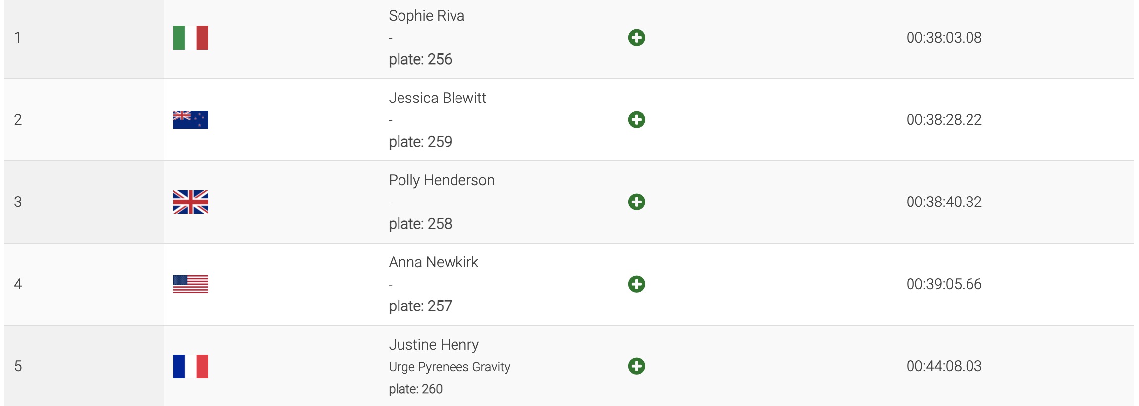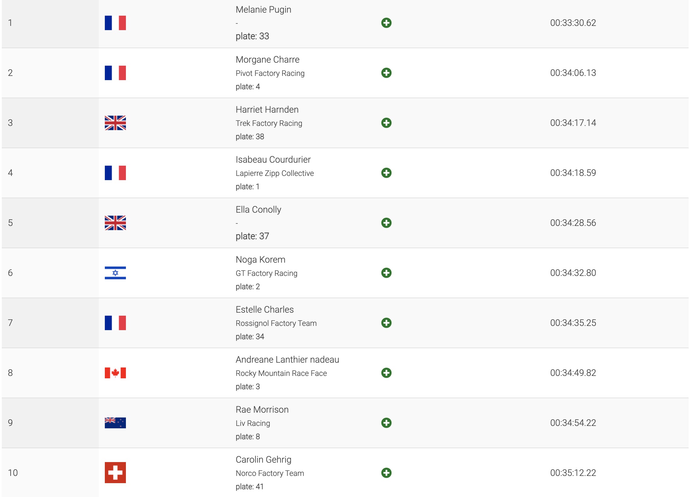 Mélanie Pugin va augmenter son avance au terme de la SP3 en profitant des contre-performances combinées d’Isabeau Courdurier (9e à +24s) et Estelle Charles (12e à +35s) et aborde l’ultime spéciale du jour avec un capital confortable de 22 secondes… Elle fait plus que gérer dans cette Queen Stage, qu’elle remporte largement, et termine la course avec 35 secondes d’avance. C’est donc une 2e victoire en Enduro World Series pour la Française après son succès à Pietra Ligure l’année dernière !
