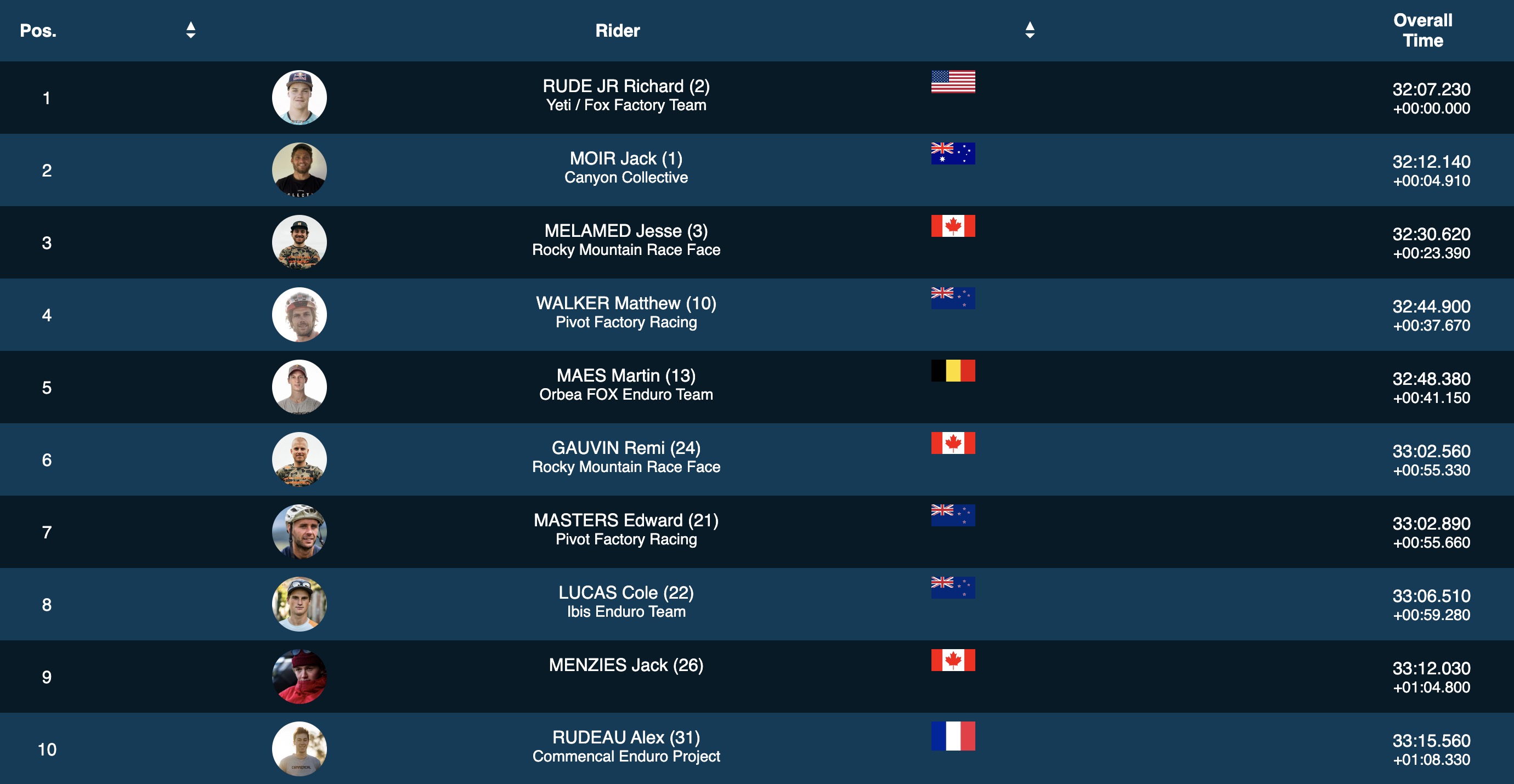 Chez les hommes, on attendait évidemment la grande explication entre Jack Moir, provisoirement en tête, Richie Rude qui évoluait à domicile, et Jesse Melamed, victorieux le week-end dernier, tout en gardant un oeil sur Matt Walker et Ed Masters, les deux Néo-zélandais étant en embuscade quelques secondes derrière le trio.