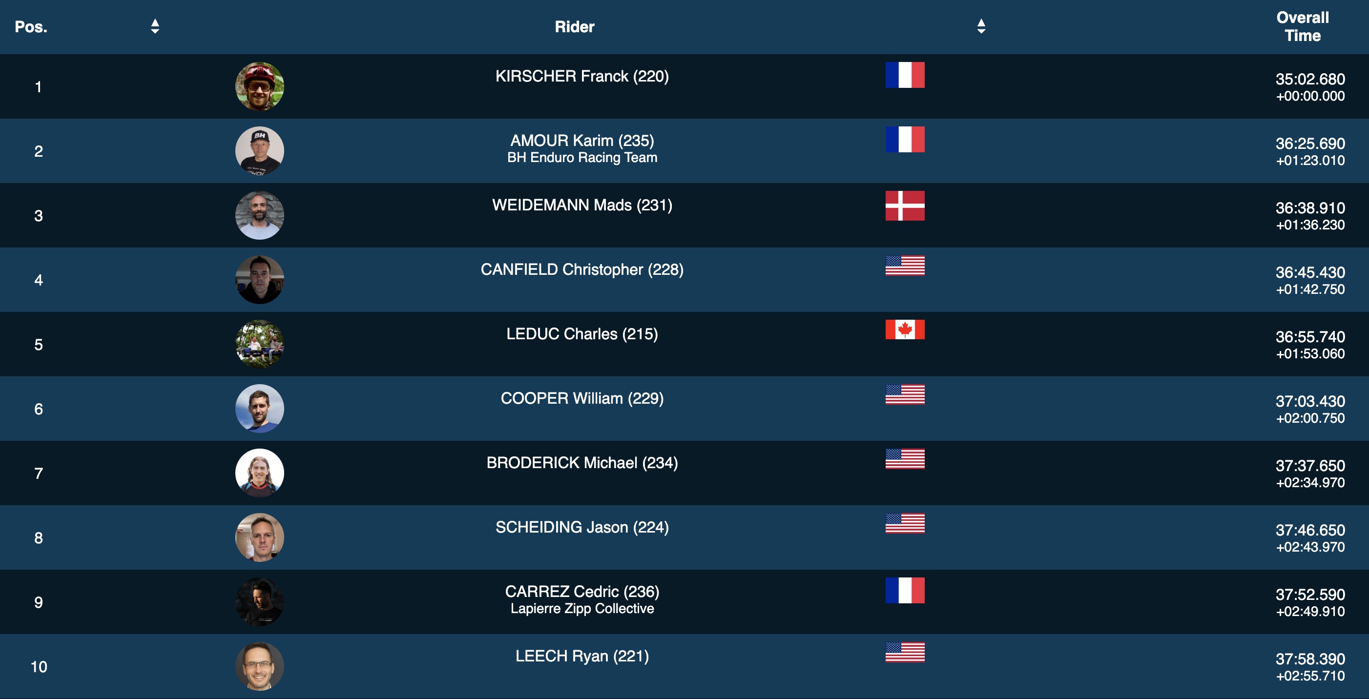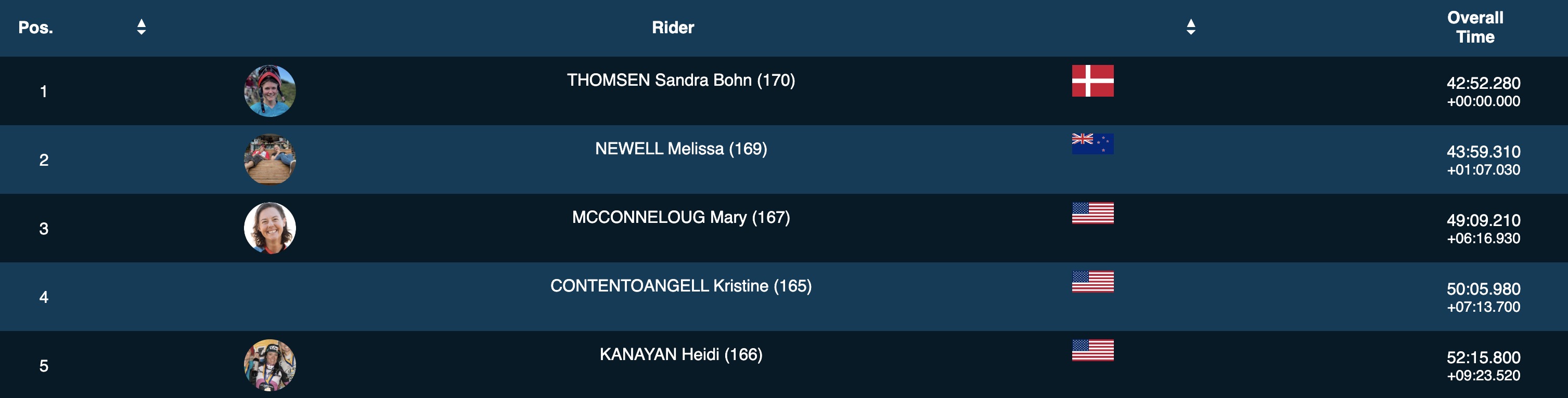 Chez les femmes Masters enfin, on a assisté à une belle passe d’armes entre Sandra Bohn Thomsen et Melissa Newell qui signent trois scratches chacune. Mais c’est finalement Thomsen qui s’impose d’une bonne trentaine de secondes après avoir réussi à grappiller beaucoup de temps à sa rivale sur les trois spéciales remportées alors qu’elle n’a quasi rien concédé sur les trois autres. Mary McConneloug a gagné une position en toute fin de course et décroche la 3e place sur le fil.