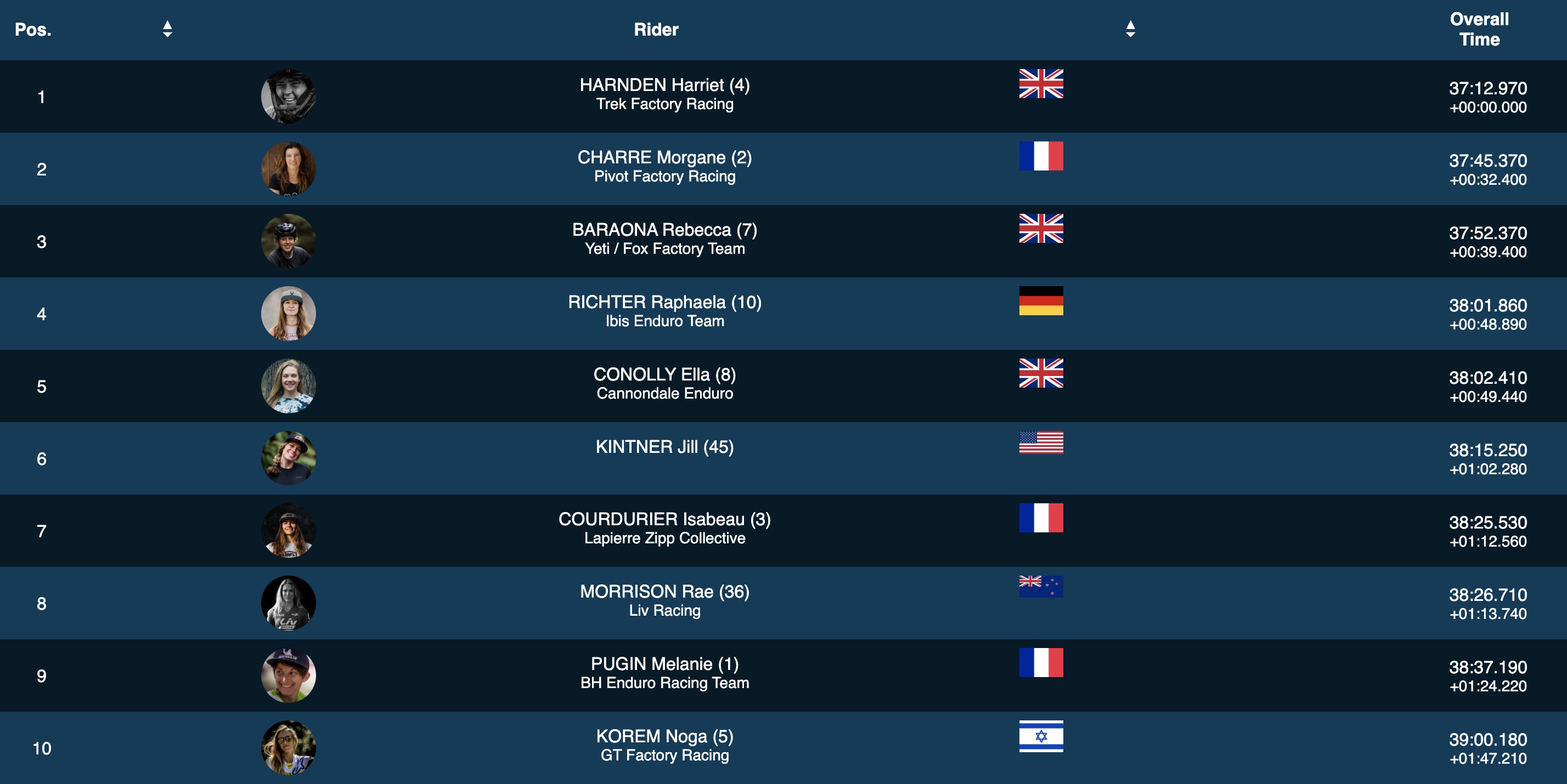 La Britannique, déjà victorieuse la semaine dernière, va encore signer deux scratches (SP4 et SP5, la Queen Stage) pour finalement s’imposer avec pas moins de 32 secondes d’avance ! Il s’agit de la 4e victoire en EWS de sa carrière.