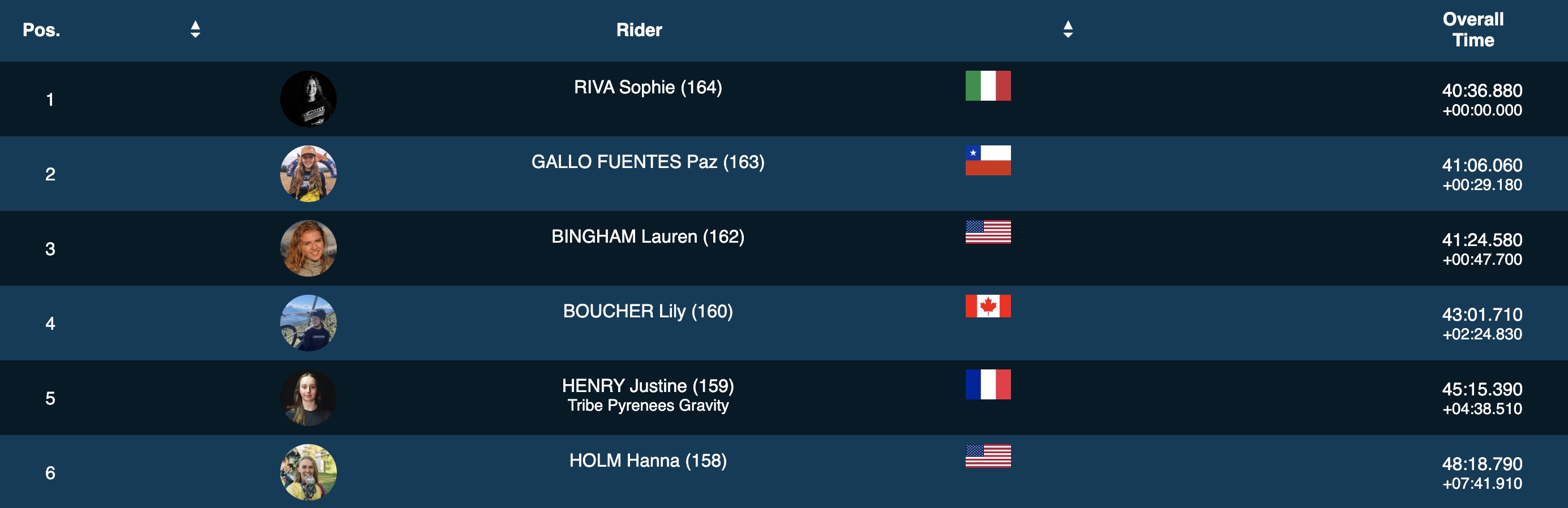Large victoire également pour Sophie Riva, qui avait pris la tête de la course dès la Pro Stage et ne l’a plus quittée. C’est même l’ensemble du classement qui n’a pas changé puisqu’on retrouve Paz Gallo Fuentes à la 2e place, à 29 secondes, et Lauren Bingham à la 3e position, à 47 secondes, sans oublier la Française Justine Henry à la 5e et avant-dernière place.