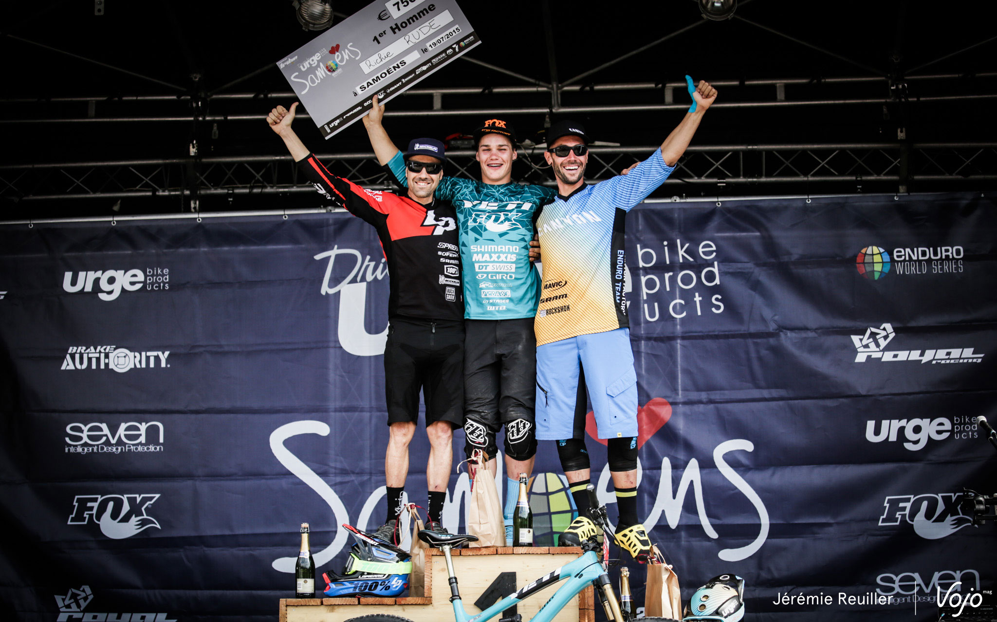 Le podium hommes : Nicolas Vouilloz (2e), Richie Rude (1er) et Fabien Barel (3e).