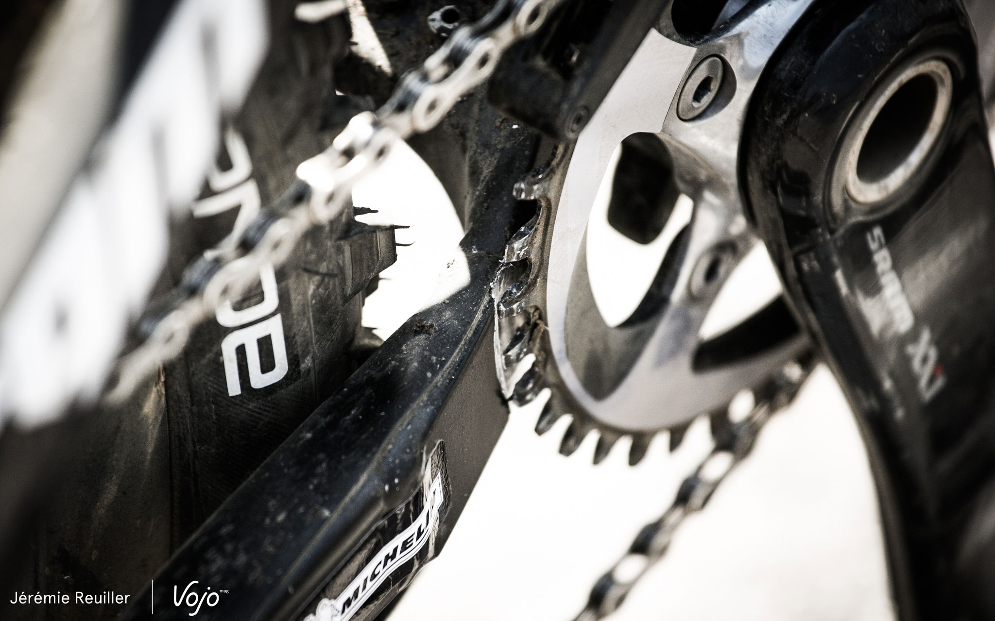 On voit ici l’ampleur des dégâts après l’impact : la manivelle touchait le cadre à chaque coup de pédale, et le plateau est venu largement entamer la base de son Lapierre ! Le bilan du week-end est bon malgré tout : Vouilloz termine à la deuxième place à seulement 6 secondes de Rude, et il a empoché une spéciale, la deuxième.