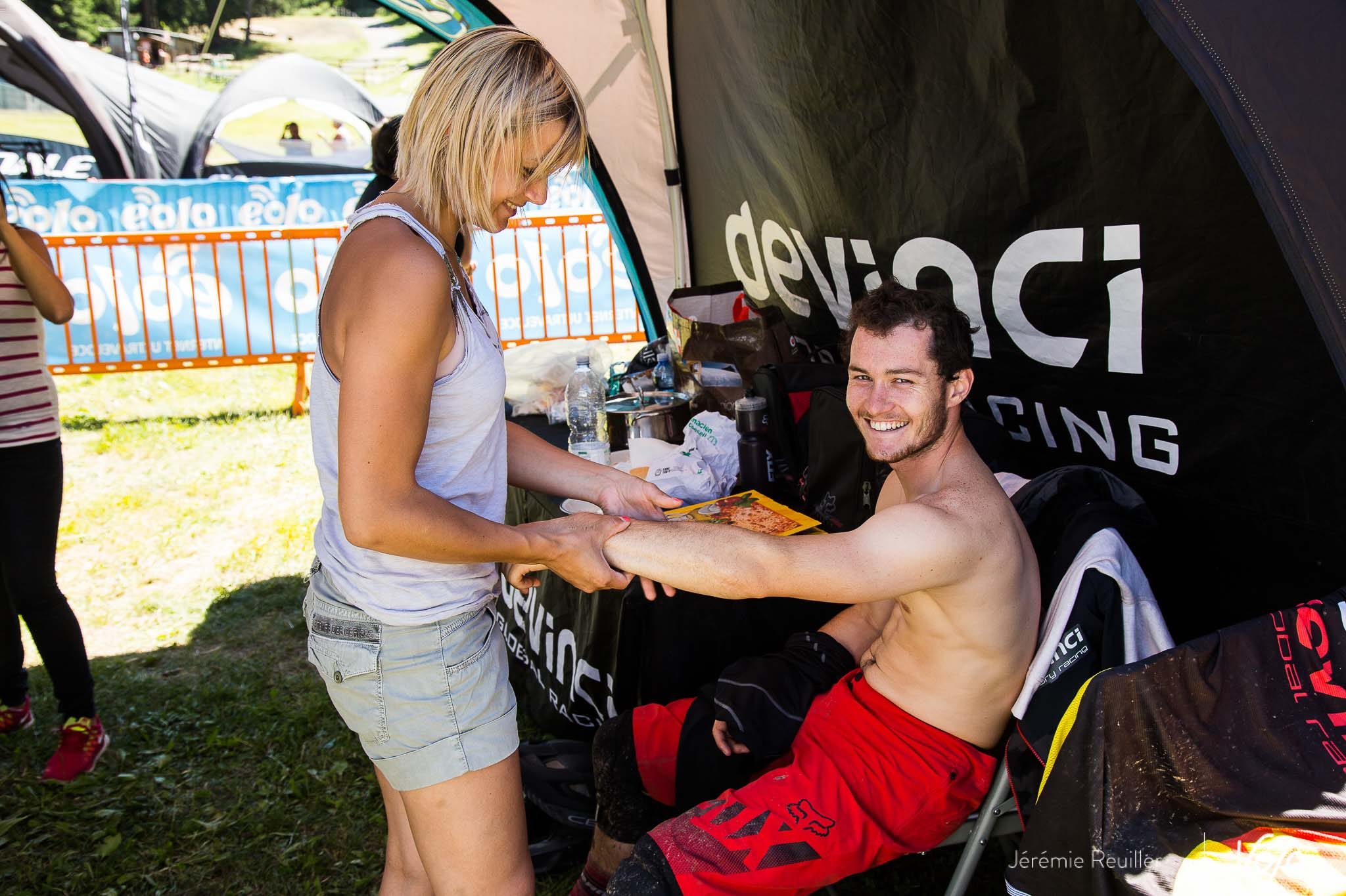 Dans les stands, on se prépare dur pour affronter cette deuxième journée de course. Chacun sa méthode : concentration et détente en mode « carpette » pour Adrien Dailly, alors que Théo Galy confie ses avant-bras à de charmantes mains expertes. Une précaution pas du tout superflue vu la longueur et la difficulté des spéciales !
