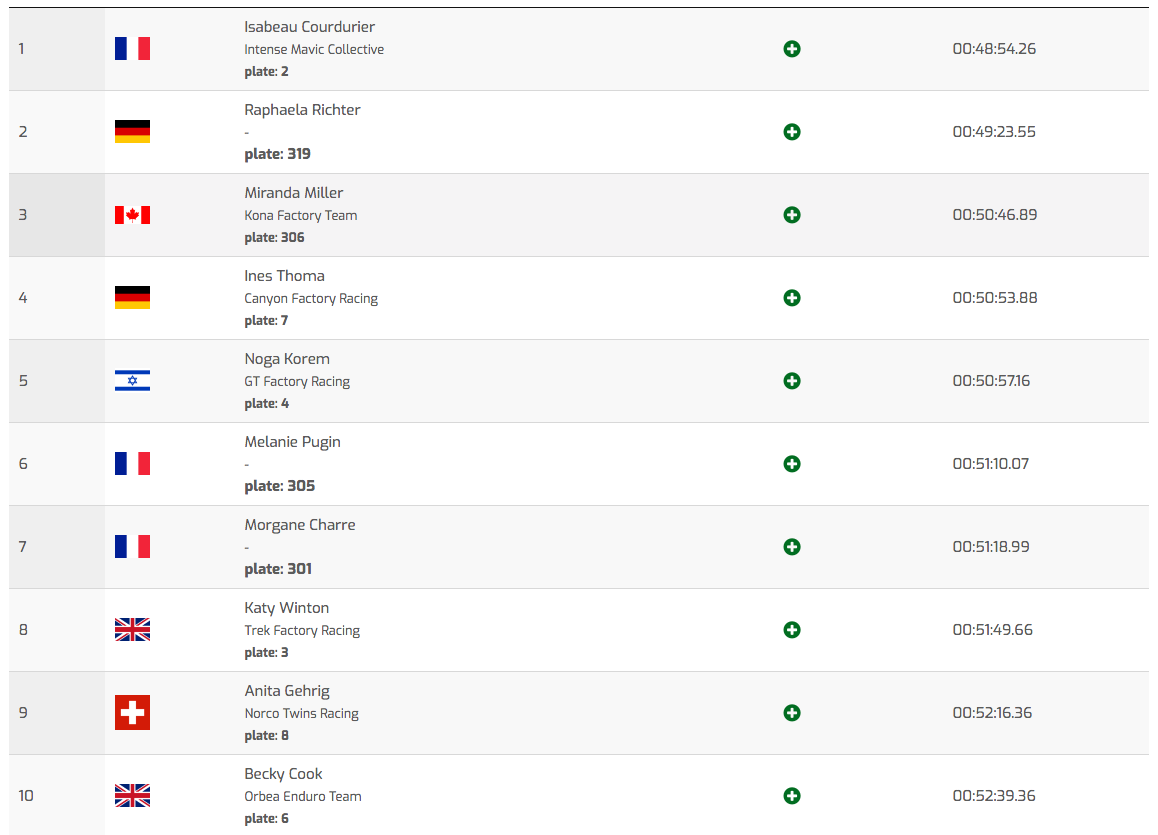 La course a été moins disputée chez les Dames, et Isabeau Courdurier a rentré une copie quasi parfaite ce dimanche en s’imposant sur deux des trois spéciales, remportant logiquement la course, sa 5e victoire en cinq manches cette saison !. Raphaela Richter a encore une fois raflé un scratch aujourd’hui, dans la SP7, pour moins d’une seconde. L’Allemande décroche finalement une impressionnante 2e place, à 30 secondes de Courdurier. Miranda Miller effectue une belle remontée et monte sur la 3e marche du podium alors qu’elle était 5e au terme de la première journée. Le top 5 est complété par Ines Thoma et Noga Korem.