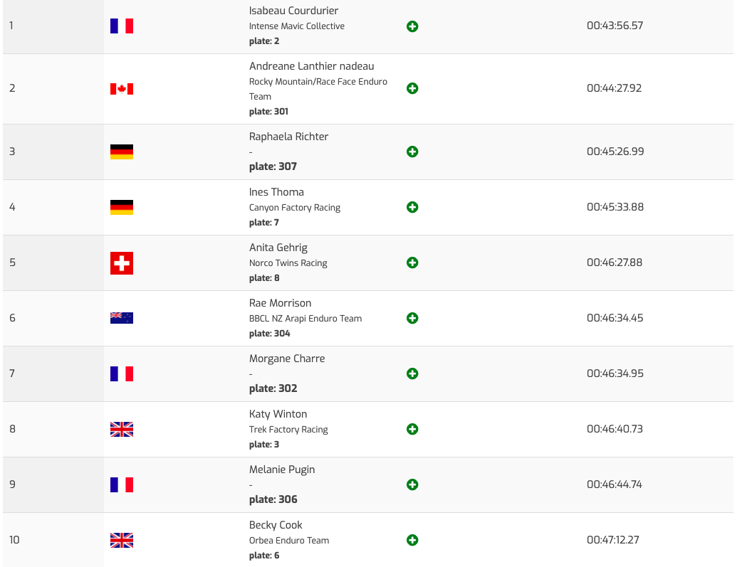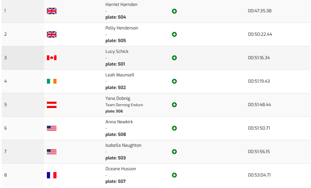 On termine avec les Dames U21 où Lucy Schick et Leah Maunsell, aux deux premières places du championnat avant d’aborder cette course, se sont fait surprendre par les Britanniques Harriett Harnden, victorieuse avec quasiment 3 minutes d’avance, et Polly Henderson, 2e. Schick, 3e, est malgré tout sacrée championne Junior 2019 pour sa première saison en EWS, devant Maunsell, qui termine 4e de cette manche.