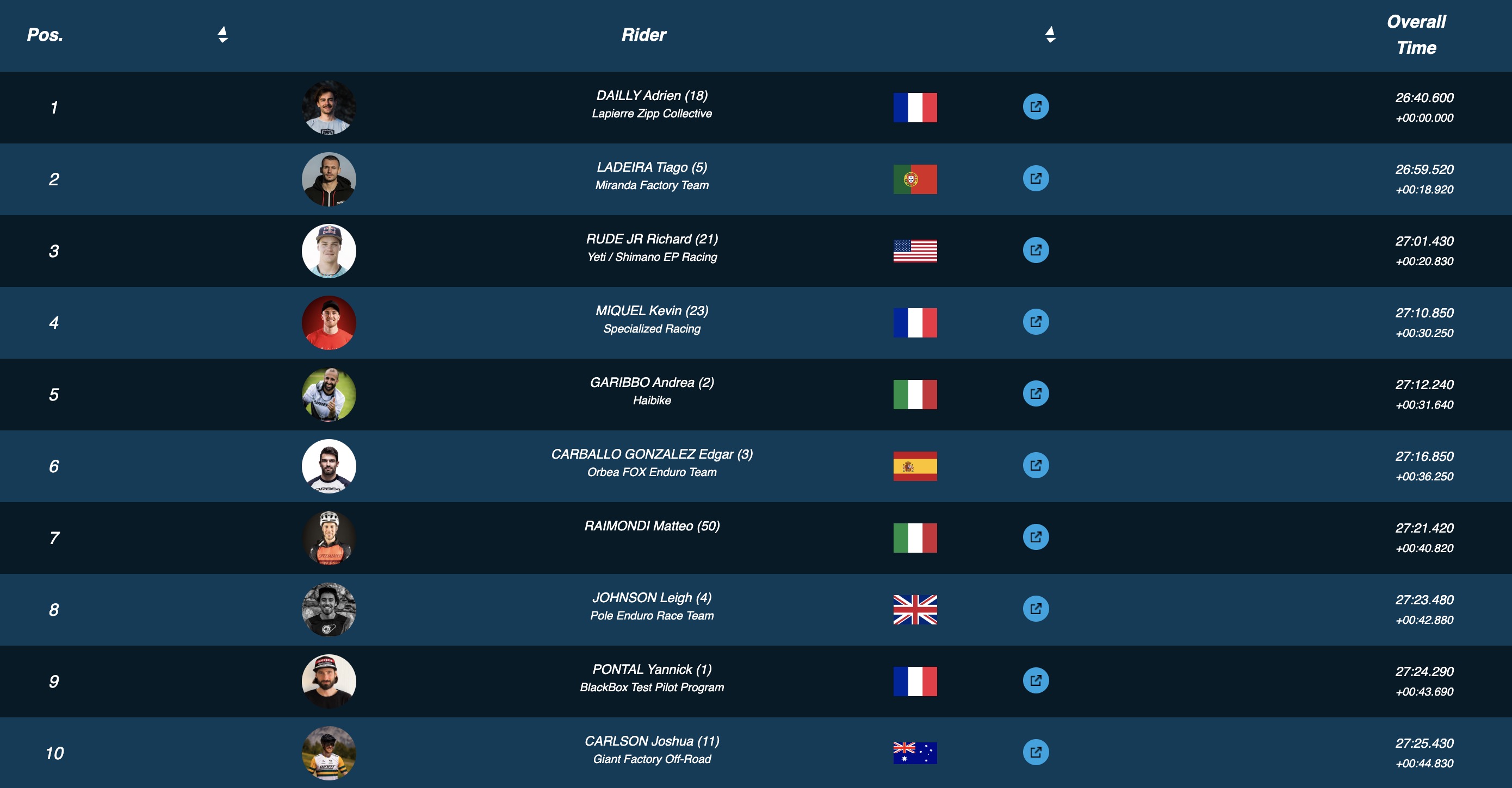 Très impressionnant dans les Power Stages avec un style bien à lui, l’Italien Andrea Garibbo termine à la 5e place (et est vice-champion des EWS-E 2022), juste devant l’Espagnol Edgar Carballo Gonzalez (6e de la course et 3e du classement général final) et un autre Italien, Matteo Raimondi, 7e.