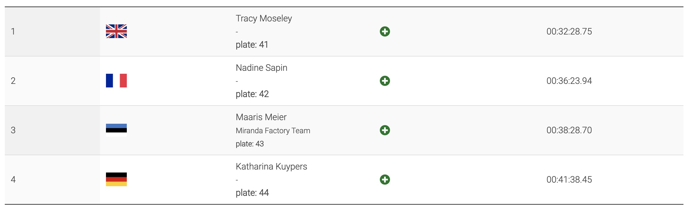 La française Nadine Sapin n’a pas démérité pour autant et prend une belle 2e place, à un peu moins de 4 minutes de la gagne. Elle signe au passage le scratch dans la 2e Power Stage et empêche Moseley de faire carton plein au niveau des spéciales.