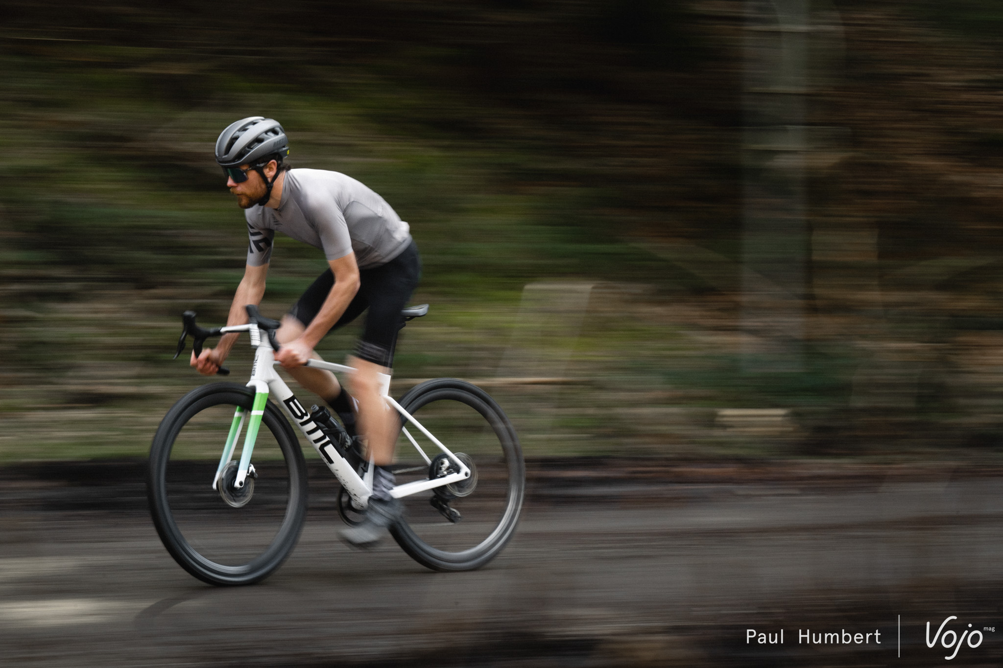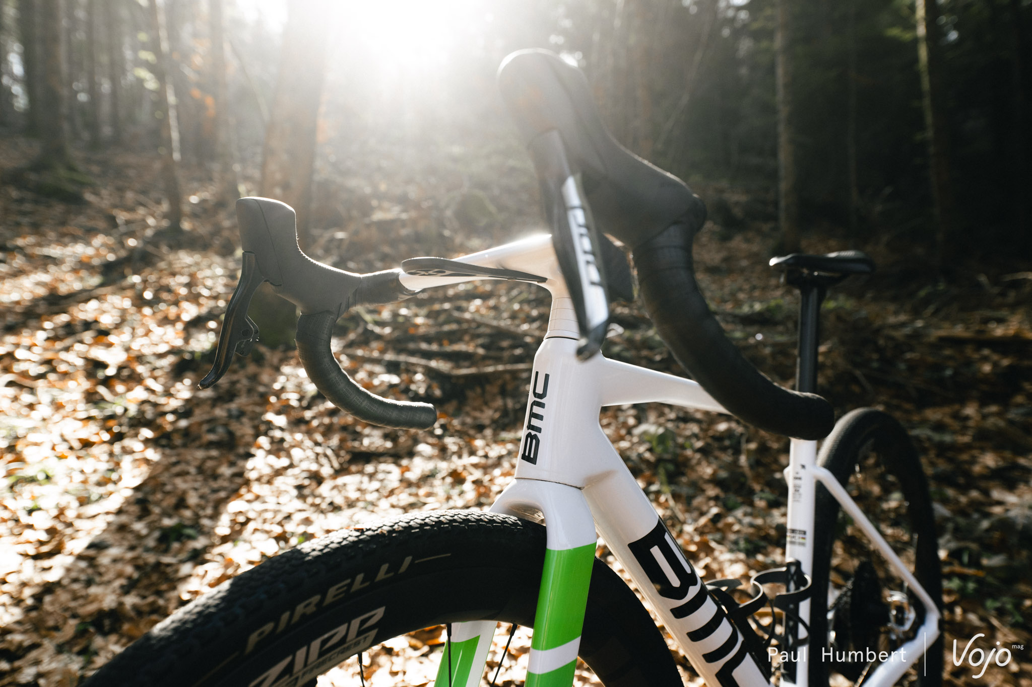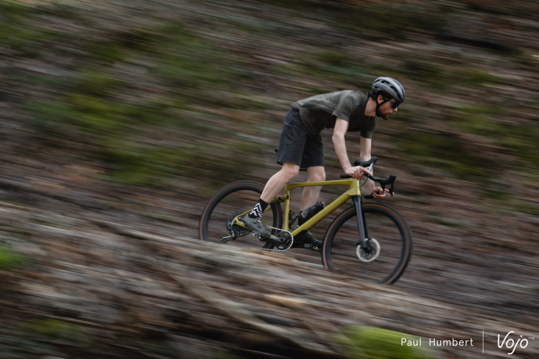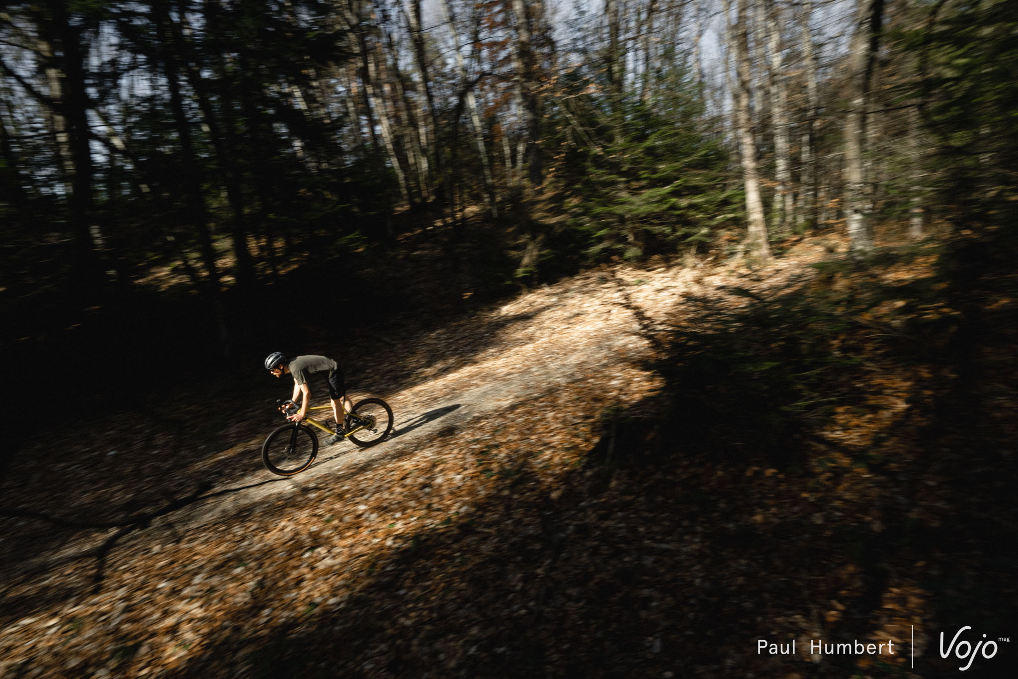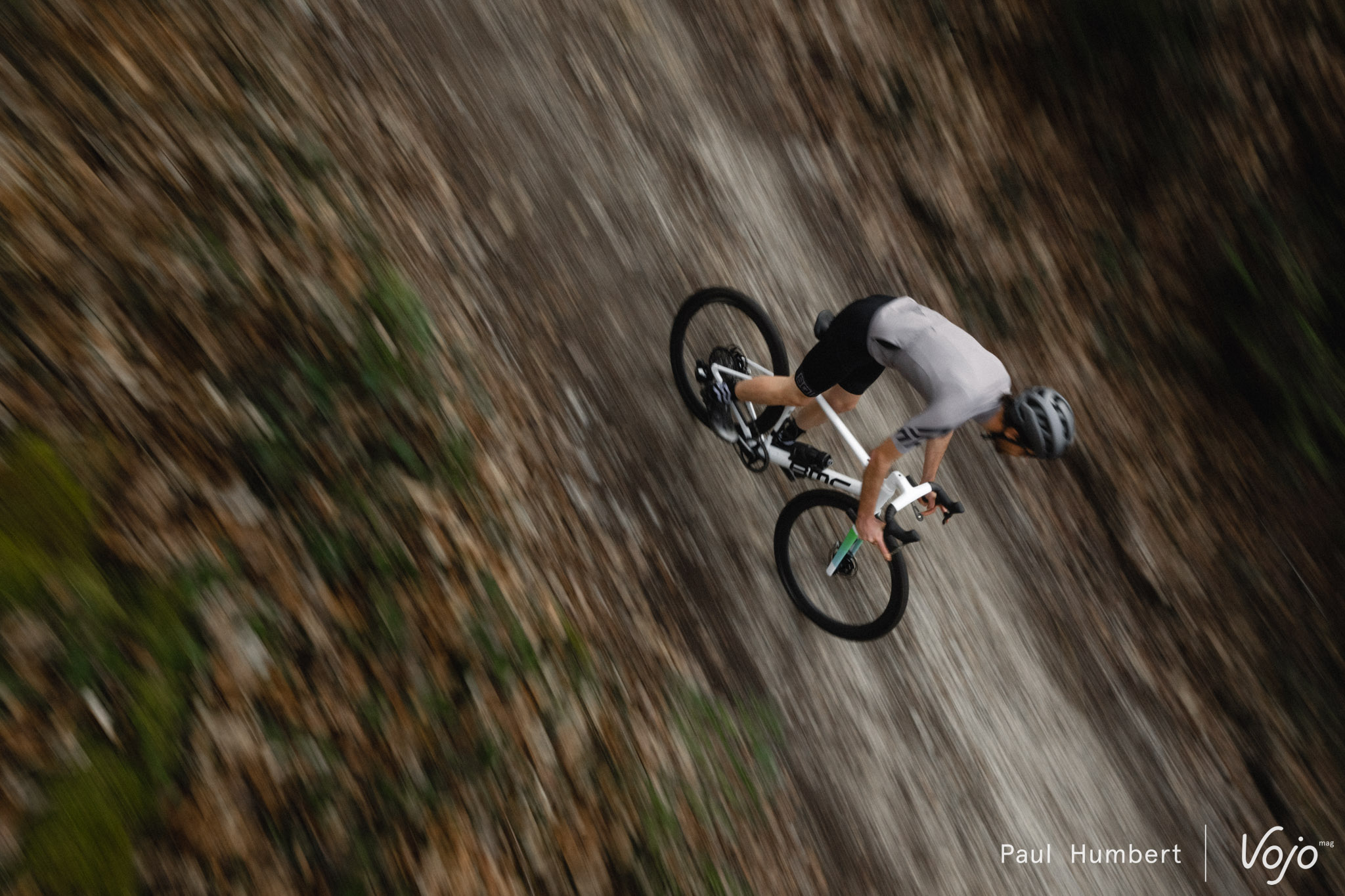 On trouve même du grip en montée, alors qu’on s’attendait à devoir pousser le vélo dans chaque section un peu raide ou humide vu le profil des pneus Pirelli. Attention, le vélo reste exigeant et il faut bien contrôler son poids ainsi que ses coups de pédales mais avec un peu de motivation, on passe sans trop de mal… tant que ce n’est pas trop raide. Avec un 40-44 pour plus petit rapport, on est encore loin du VTT et il faut une certaine condition physique lorsque le sentier s’incline vraiment. En revanche, sur les chemins blancs du retour, c’est un régal.