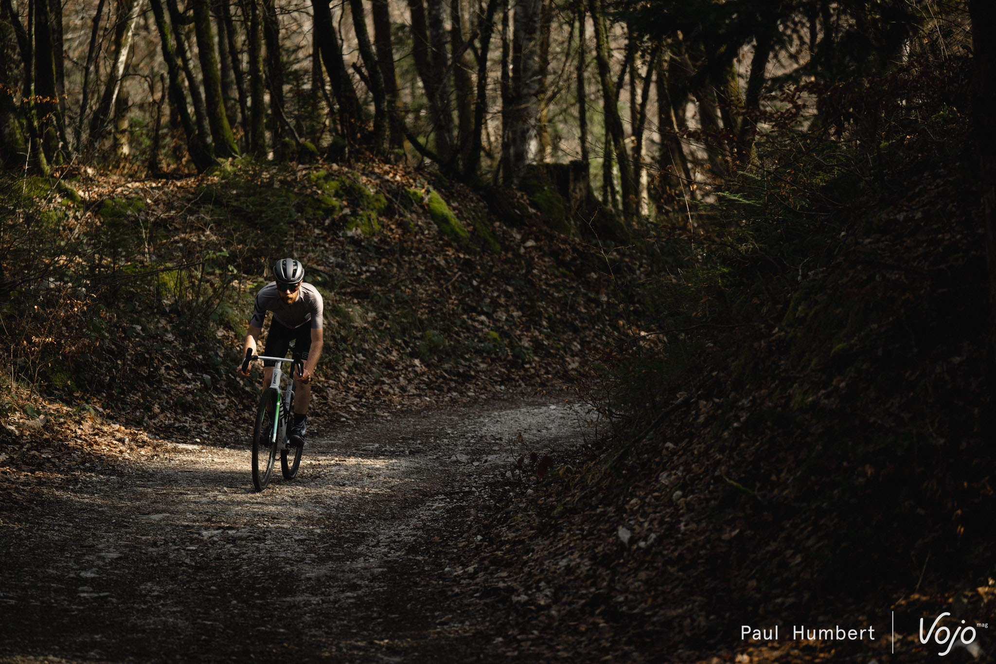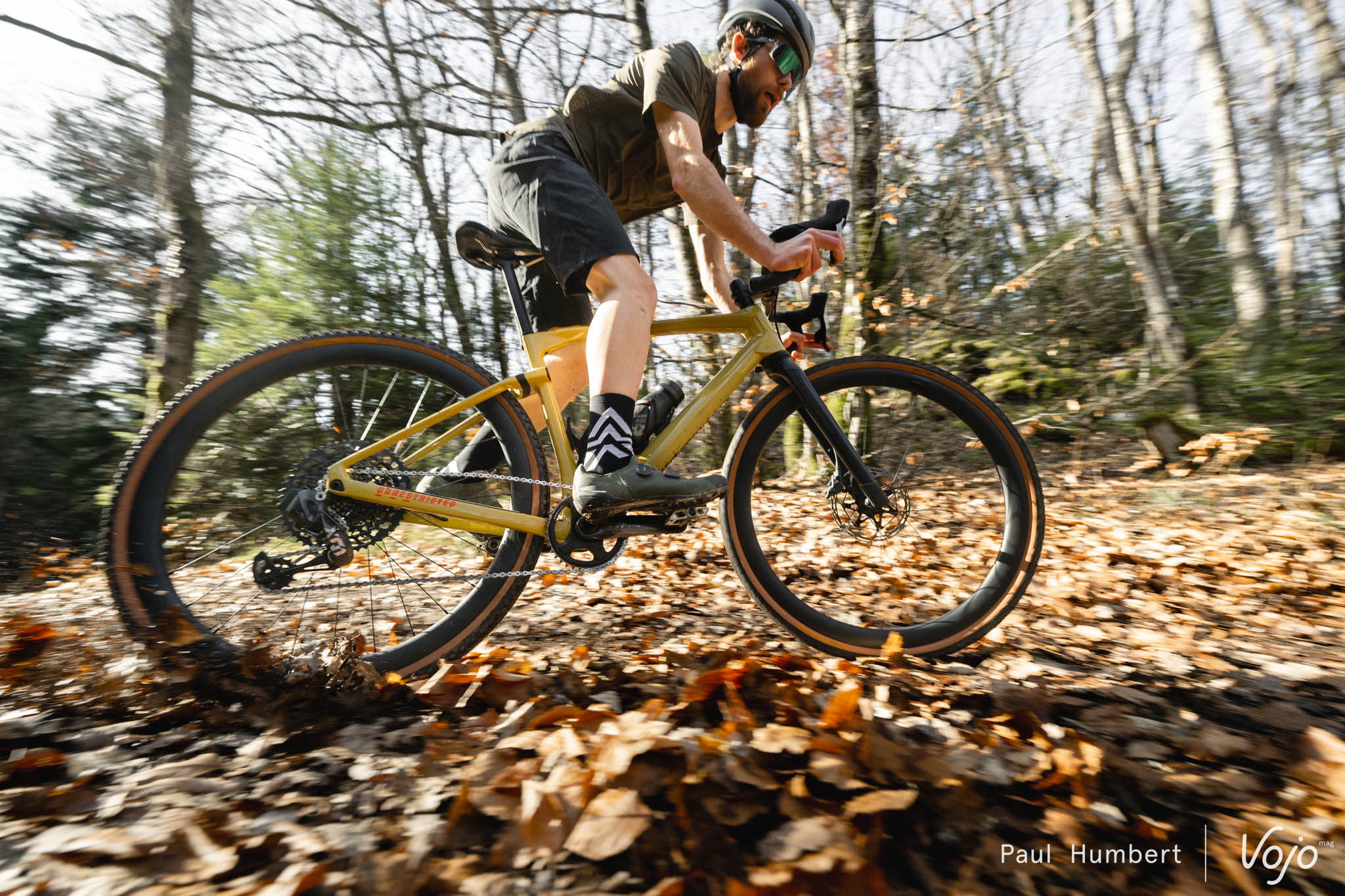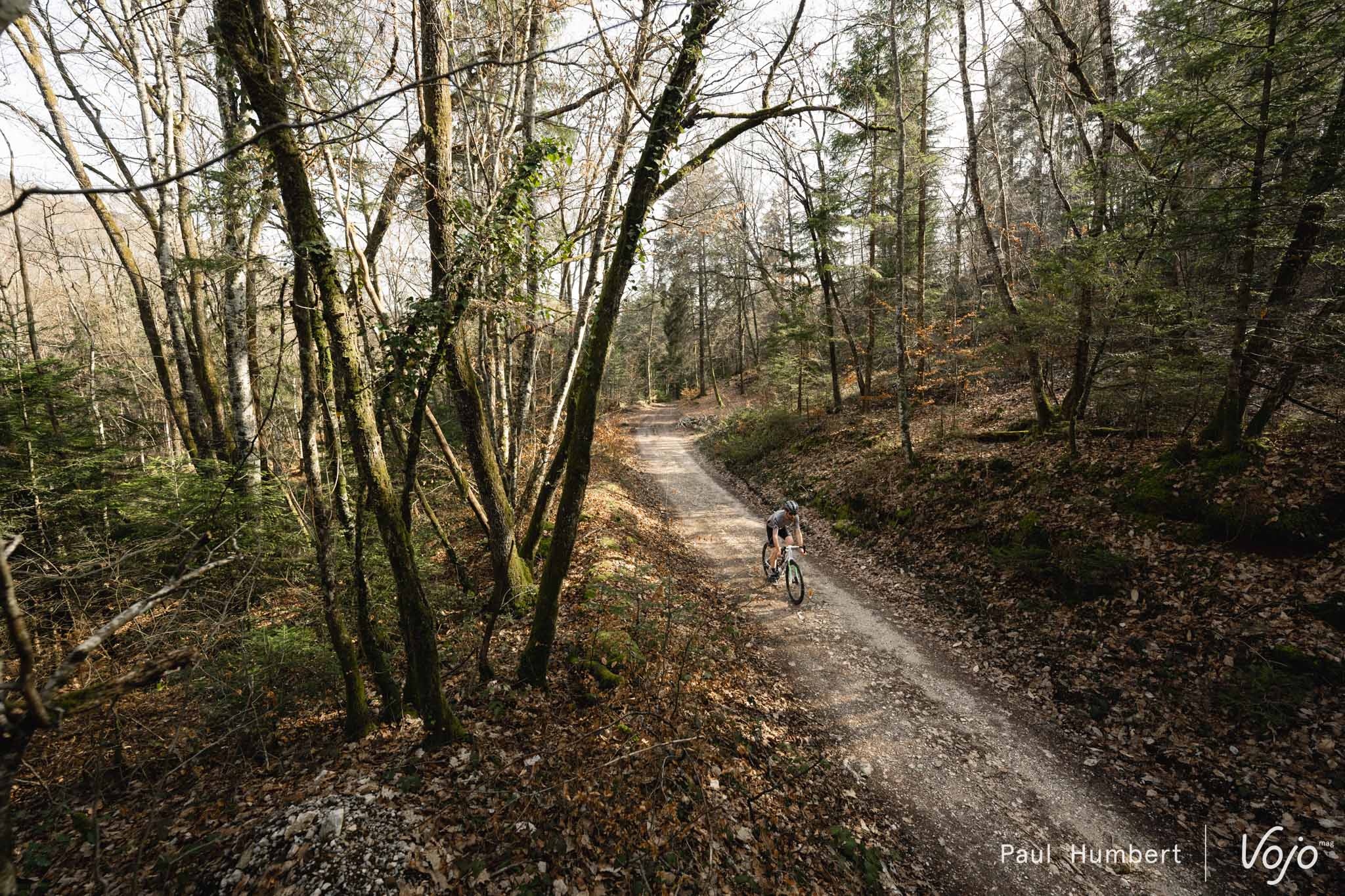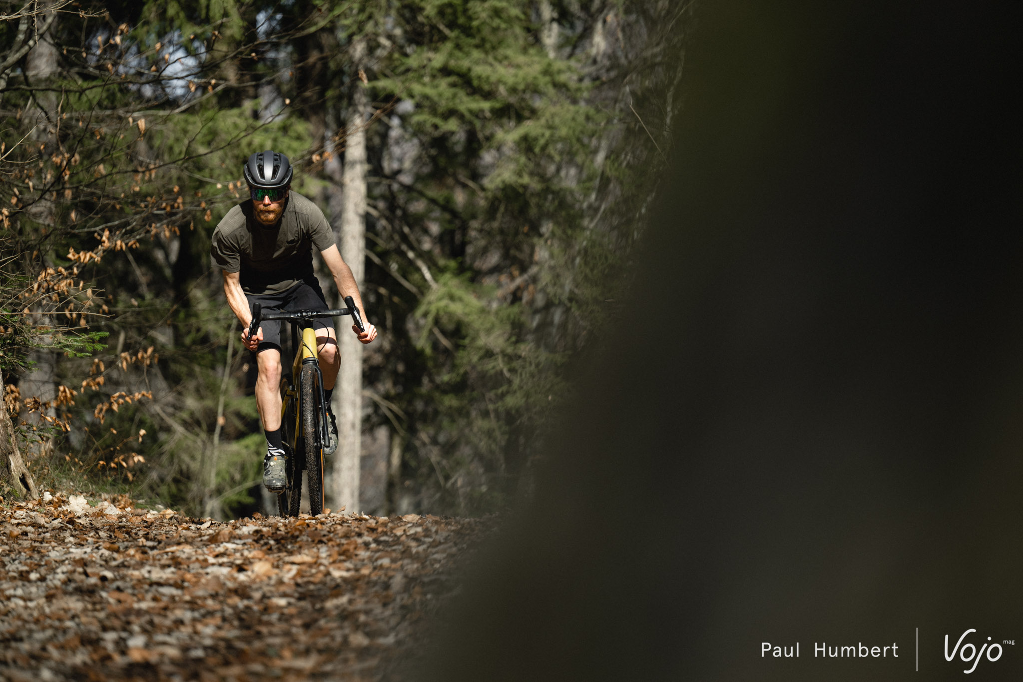 En fond de descente, on s’engage plein gaz sur le premier sentier sans savoir à quelle sauce on va être mangé et… tout se passe bien ! C’est la grosse surprise de ce tour en Kaius, le vélo est presque confortable lorsqu’on s’aventure dans la forêt et fait mieux qu’un Scott Addict Gravel par exemple. Pour les avoir longtemps roulées sur un Lauf True Grit (lire Test nouveauté | Sram XPLR : une certaine vision du gravel), on sait que les roues Zipp 303 Firecrest ne sont pas un modèle de tolérance ou de confort, mais le Kaius parvient réellement à épargner son pilote et on se fait pas tasser les poignets ou les vertèbres à chaque racine. L’effet de la carcasse des pneus ? De la légèreté du vélo ?