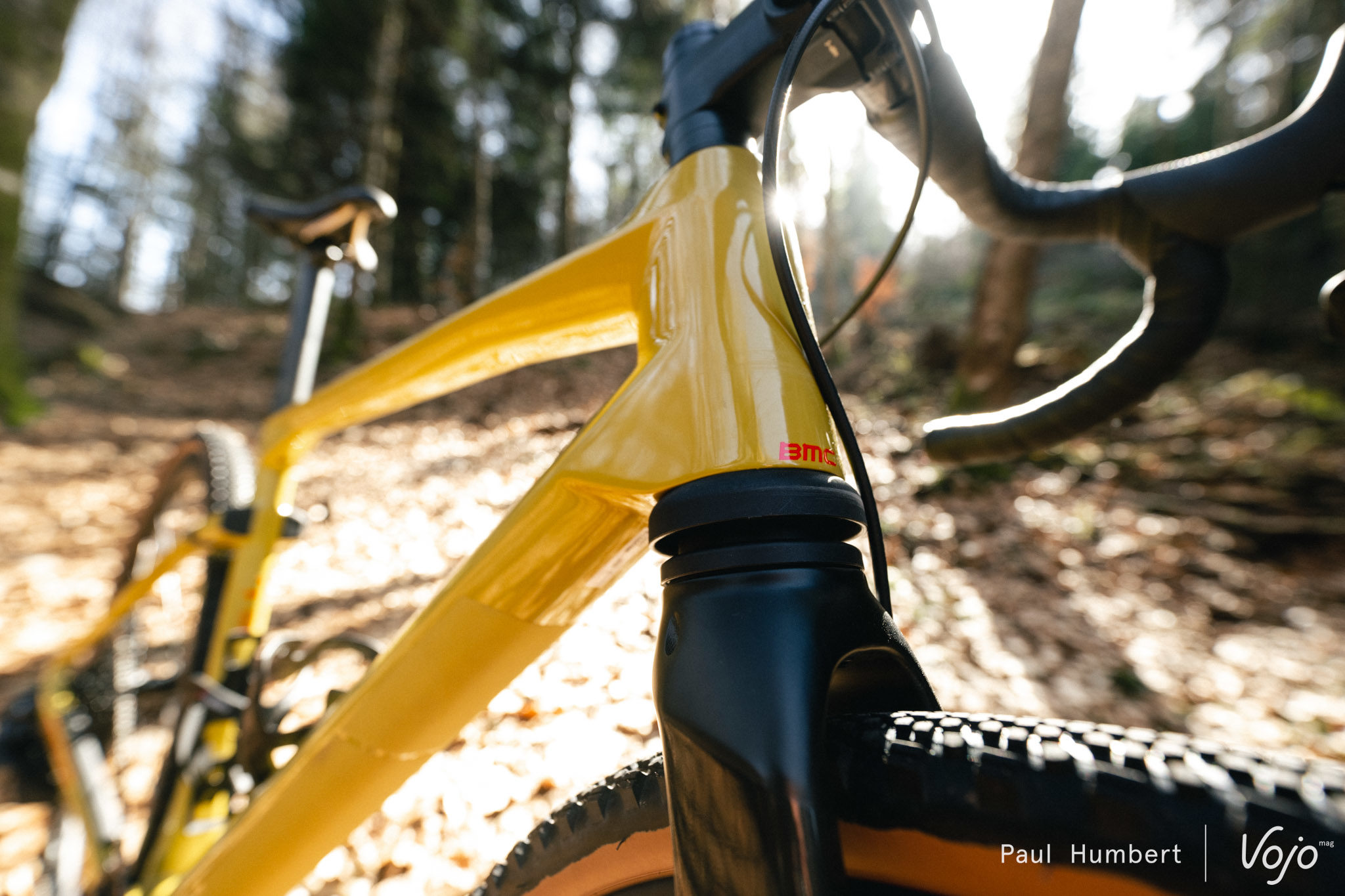 Dans les faits, qu’est-ce que ça donne ? A l’arrière, on a 10 mm de débattement contrôlés par un élastomère. Rien de très nouveau puisqu’on l’avait déjà sur l’Urs « classique » et qu’il s’agit d’une version simplifiée du MTT qui équipait le semi-rigide TeamElite de 2015 à 2020. A l’avant, c’est autre chose : on a 20 mm de débattement avec une vraie fourche à ressort hélicoïdal, dans l’esprit de la fameuse Headshock Fatty qui équipait certains Cannondale il y a une ou deux décennies. On vous passe tous les détails, vous pouvez les retrouver dans l’article que nous avions publié lors de la sortie du vélo (lire Test nouveauté | BMC Urs LT : à peine domestiqué) mais retenez qu’elle est réglable en changeant le ressort et qu’on peut la bloquer via une molette au sommet du pivot de fourche.