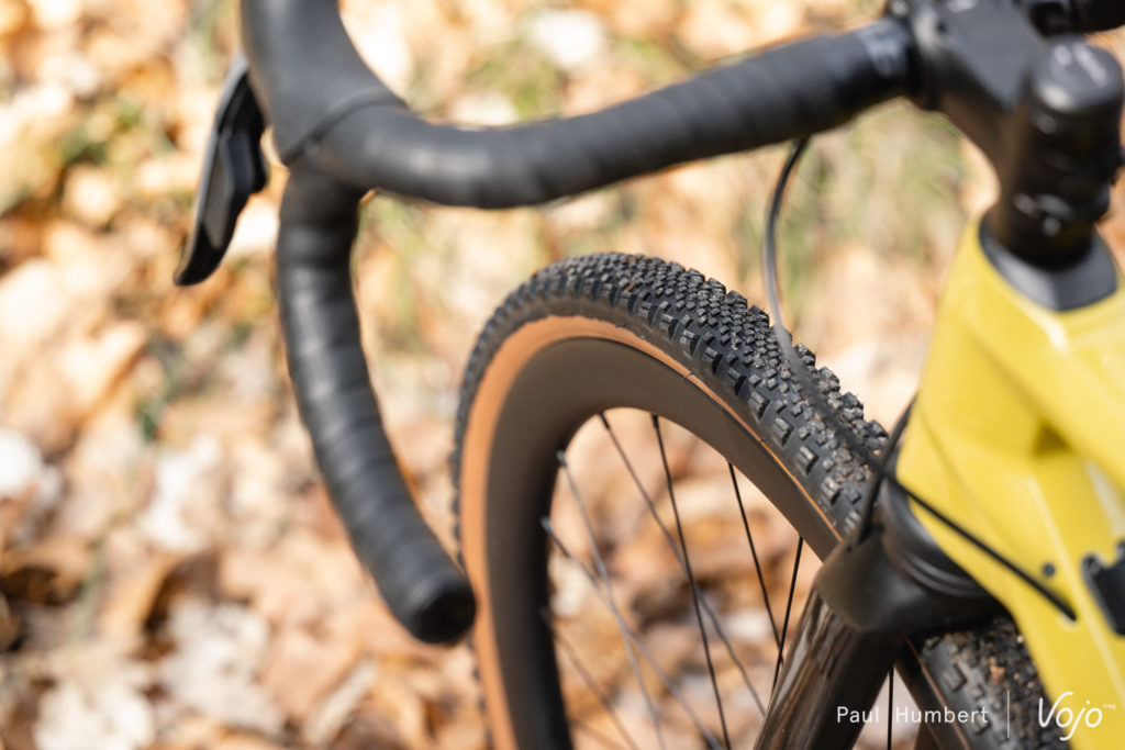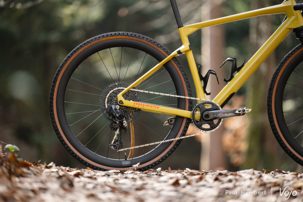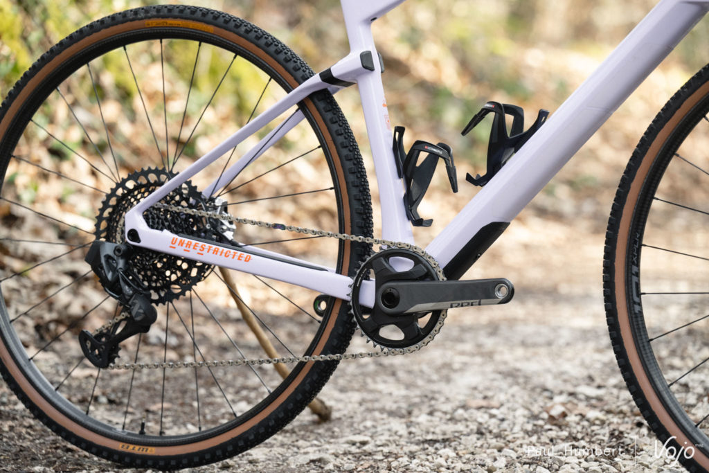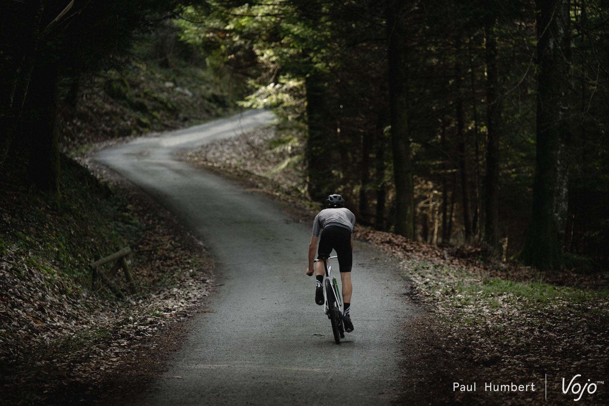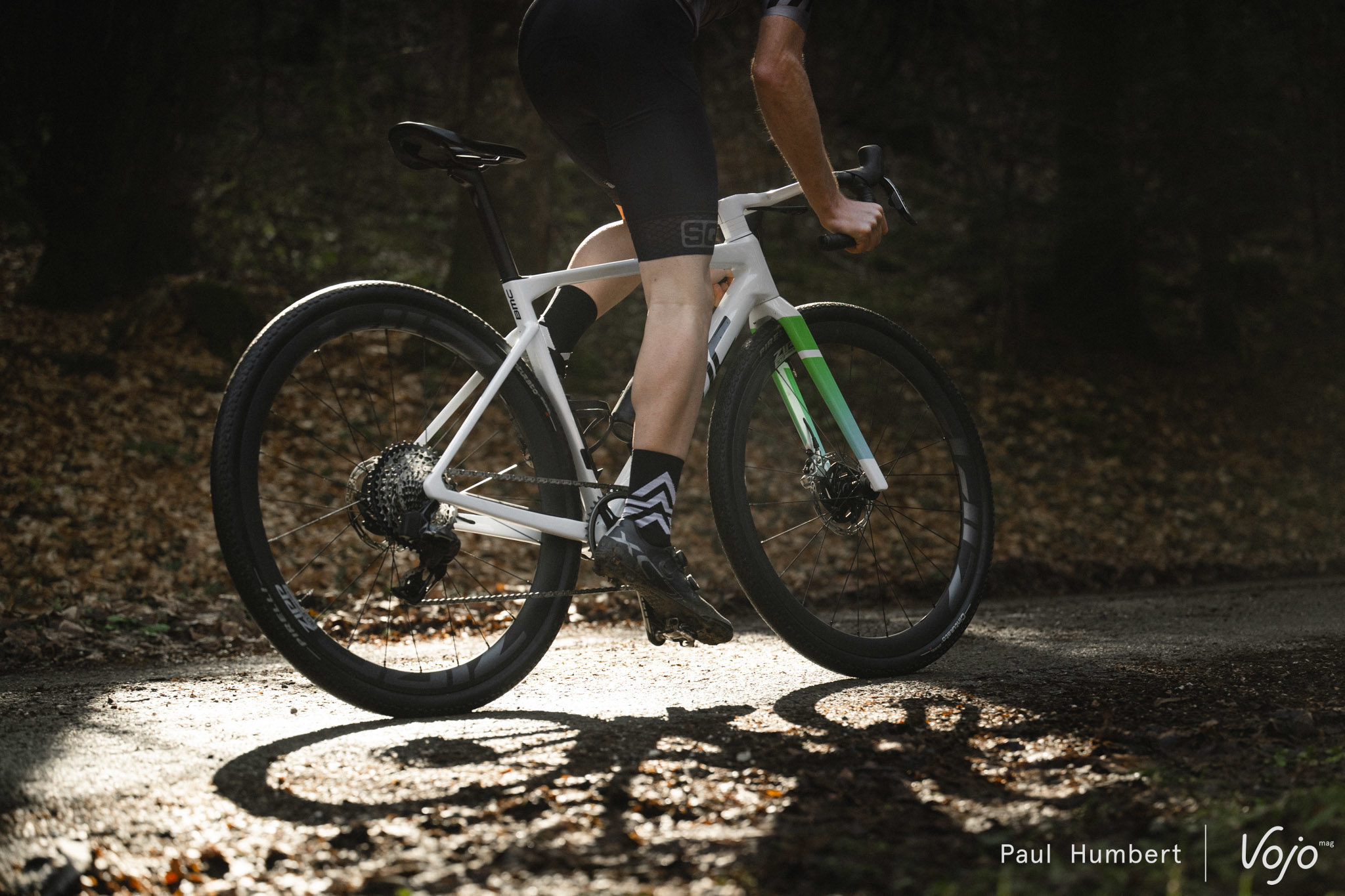 On trouve même du grip en montée, alors qu’on s’attendait à devoir pousser le vélo dans chaque section un peu raide ou humide vu le profil des pneus Pirelli. Attention, le vélo reste exigeant et il faut bien contrôler son poids ainsi que ses coups de pédales mais avec un peu de motivation, on passe sans trop de mal… tant que ce n’est pas trop raide. Avec un 40-44 pour plus petit rapport, on est encore loin du VTT et il faut une certaine condition physique lorsque le sentier s’incline vraiment. En revanche, sur les chemins blancs du retour, c’est un régal.