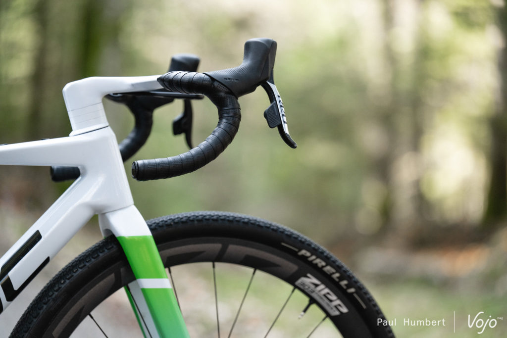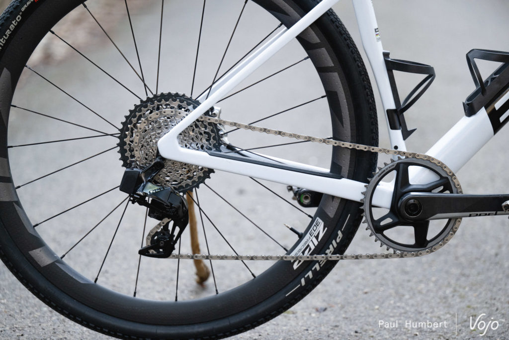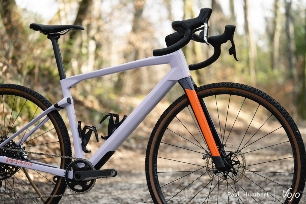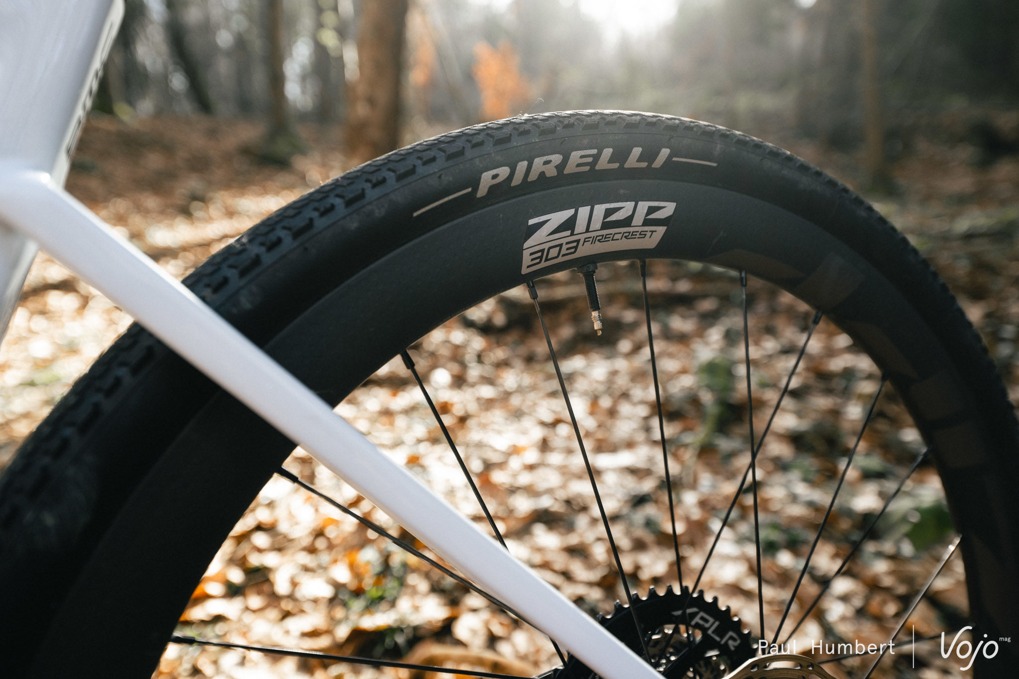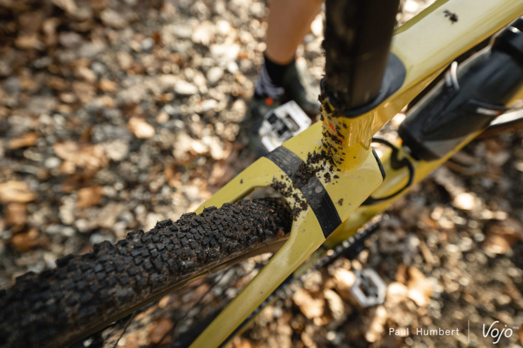 On trouve même du grip en montée, alors qu’on s’attendait à devoir pousser le vélo dans chaque section un peu raide ou humide vu le profil des pneus Pirelli. Attention, le vélo reste exigeant et il faut bien contrôler son poids ainsi que ses coups de pédales mais avec un peu de motivation, on passe sans trop de mal… tant que ce n’est pas trop raide. Avec un 40-44 pour plus petit rapport, on est encore loin du VTT et il faut une certaine condition physique lorsque le sentier s’incline vraiment. En revanche, sur les chemins blancs du retour, c’est un régal.