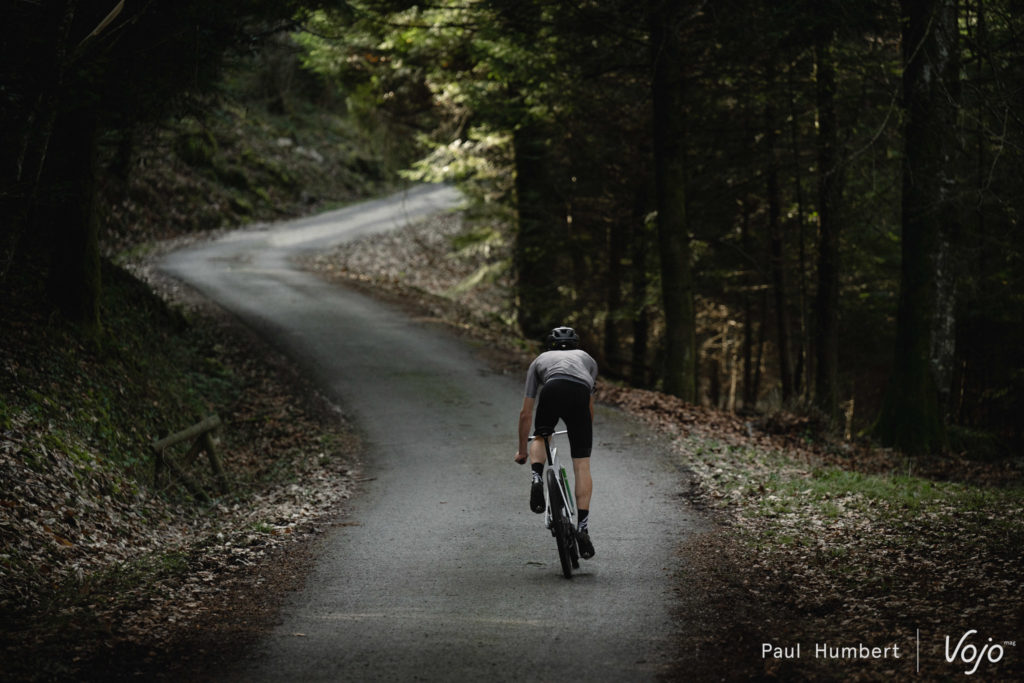 En fond de descente, on s’engage plein gaz sur le premier sentier sans savoir à quelle sauce on va être mangé et… tout se passe bien ! C’est la grosse surprise de ce tour en Kaius, le vélo est presque confortable lorsqu’on s’aventure dans la forêt et fait mieux qu’un Scott Addict Gravel par exemple. Pour les avoir longtemps roulées sur un Lauf True Grit (lire Test nouveauté | Sram XPLR : une certaine vision du gravel), on sait que les roues Zipp 303 Firecrest ne sont pas un modèle de tolérance ou de confort, mais le Kaius parvient réellement à épargner son pilote et on se fait pas tasser les poignets ou les vertèbres à chaque racine. L’effet de la carcasse des pneus ? De la légèreté du vélo ?