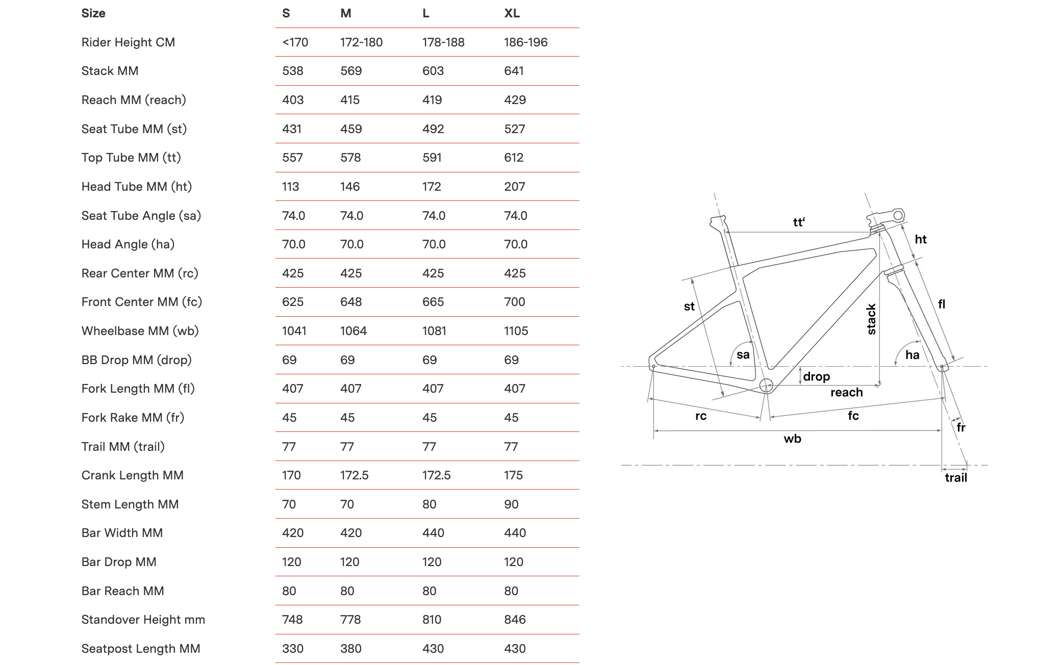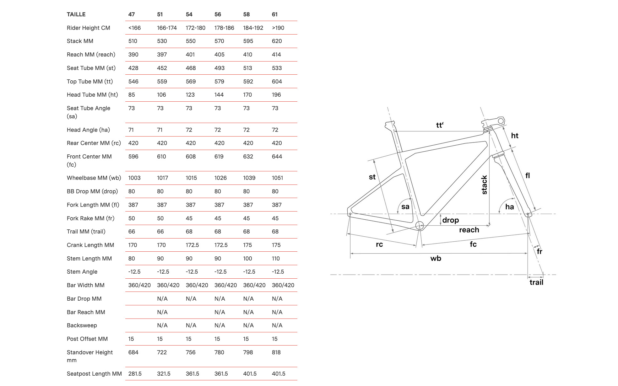 Prenez le Kaius : ses angles se situent dans la moyenne des vélos de sa catégorie (Orbea Terra, Cervélo Aspero, Specialized Crux, Scott Addict Gravel…) mais le cadre est bas et surtout long. Douille de direction et stack sont a minima 10 mm moins hauts qu’ailleurs tandis que le tube supérieur de 469 mm en taille M correspond à du L chez les concurrents précités. C’est encore plus flagrant pour le reach puisque les 401 mm en taille M du Kaius se retrouvent sur du… XL ailleurs !