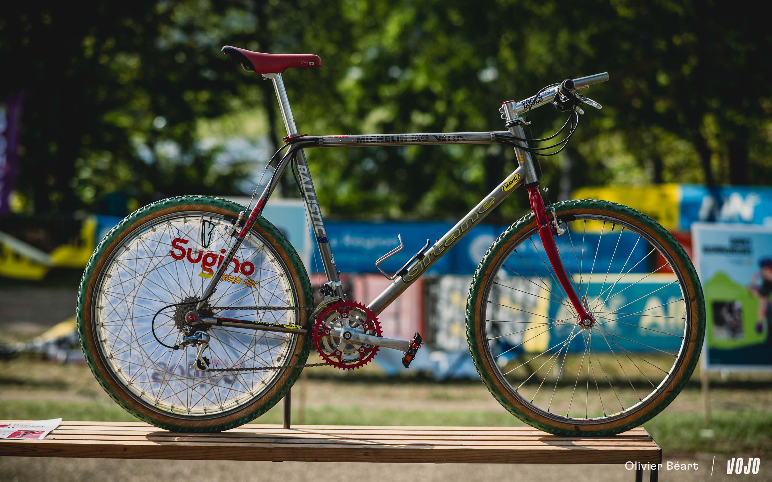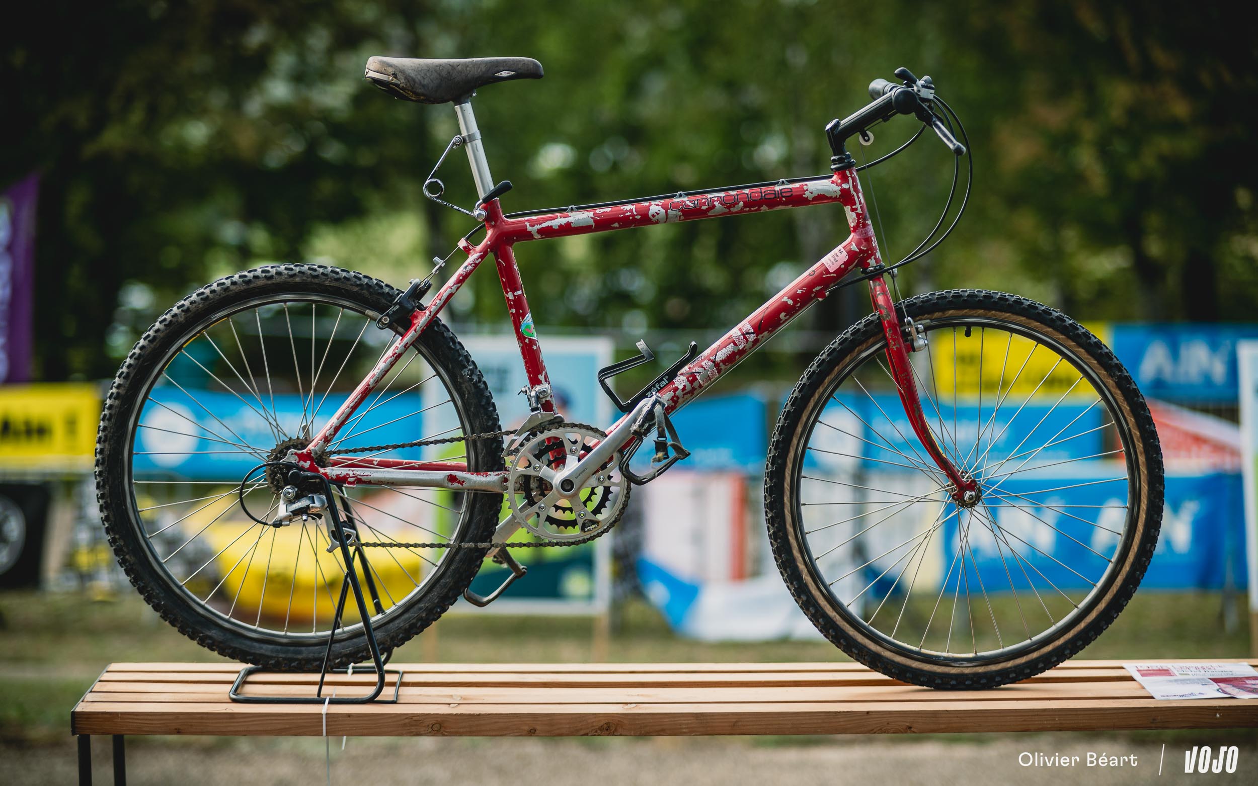 On poursuit avec un deuxième vélo tout à fait unique, puisqu’il s’agit de la machine de la toute première championne du monde de VTT, Mary-Lee Atkins, couronnée à Villard-de-Lans en 1987 ! Même si le championnat n’était pas encore totalement reconnu, cette année-là marque la première grande confrontation des vététistes européens et américains (qui ont pris l’ascendant, puisque c’est un certain Ned Overend qui s’est imposé chez les hommes). Ce vélo a été offert à Génération Mountainbike par la championne elle-même, à l’occasion du « revival » qui a été organisé par l’association à l’occasion de l’anniversaire des 25 ans de cette course devenue mythique.