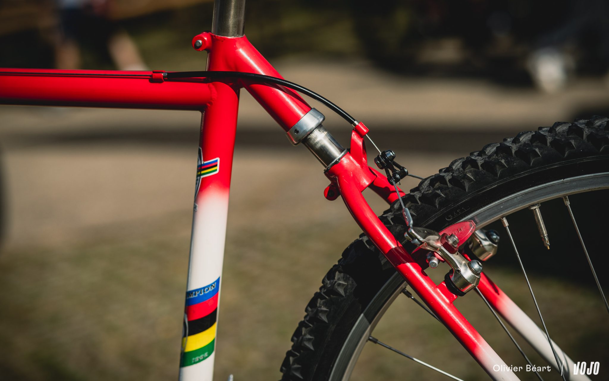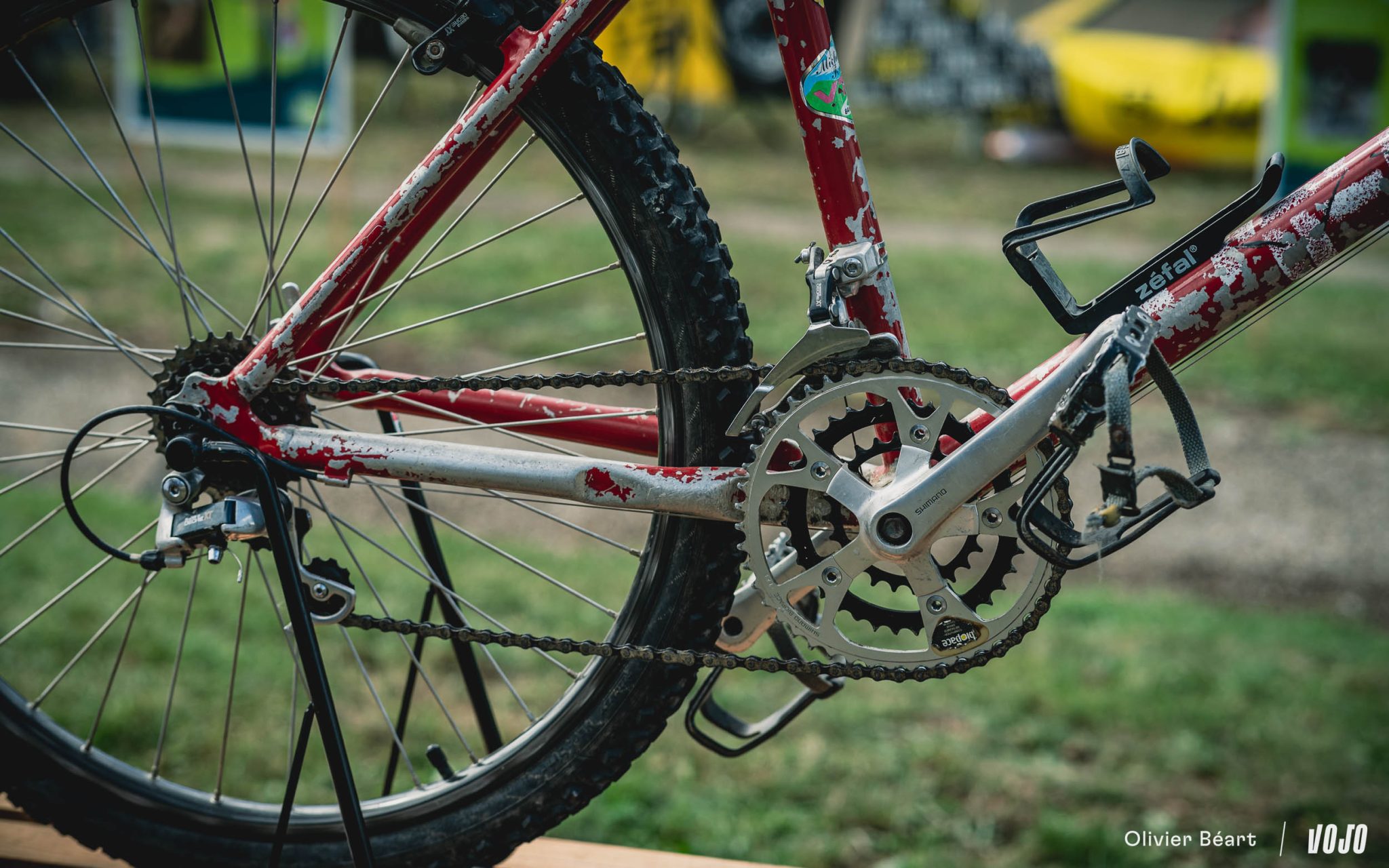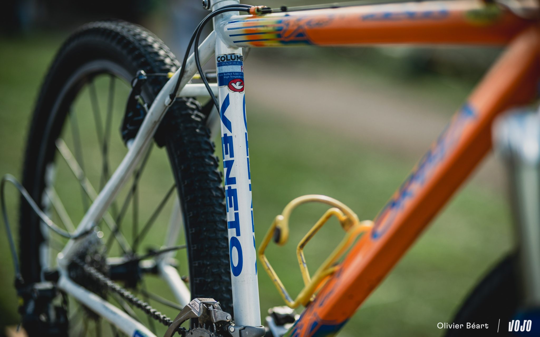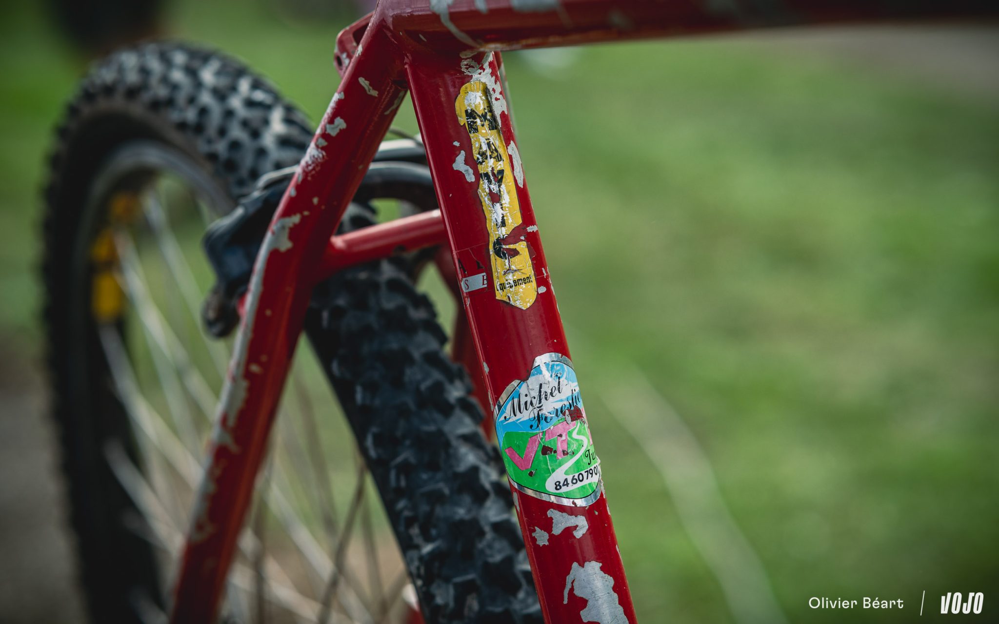 Le moins qu’on puisse dire, c’est que ce vélo a vécu ! Et il est également rempli d’une charge émotionnelle bien particulière, puisqu’il s’agit du vélo de Michel Forestier, disparu un peu plus tôt dans l’année. Pour rappel, c’est à lui qu’on doit le nom de « la Forestière » et il a été le premier champion du monde français (en catégorie Vétérans, en 1987 à Villard-de-Lans). S’il a gagné ce premier titre au guidon d’un Diamondback en acier, Michel Forestier se voit proposer en 1988 un Cannondale SM1000 en aluminium par Chamonix Mountainbike.