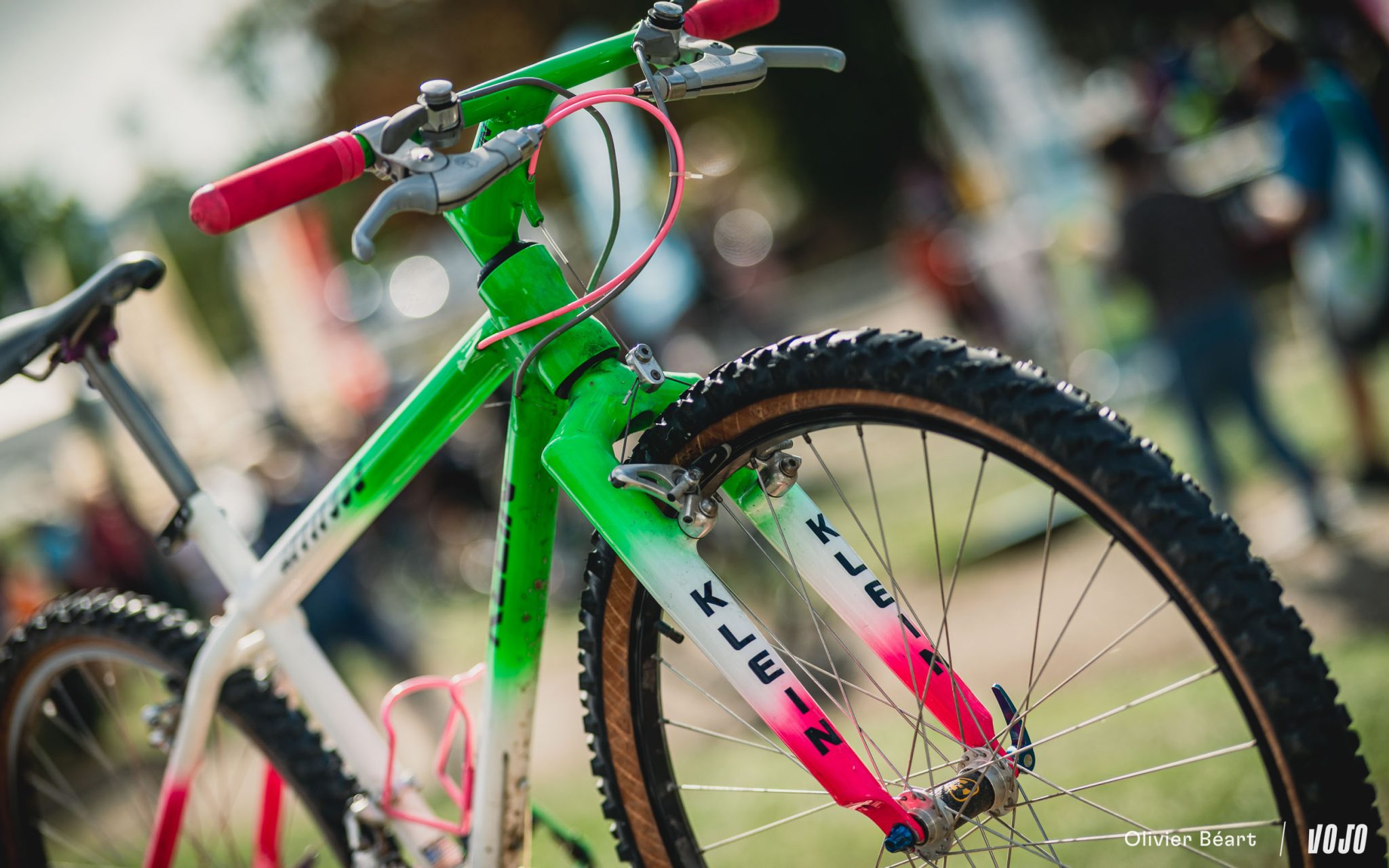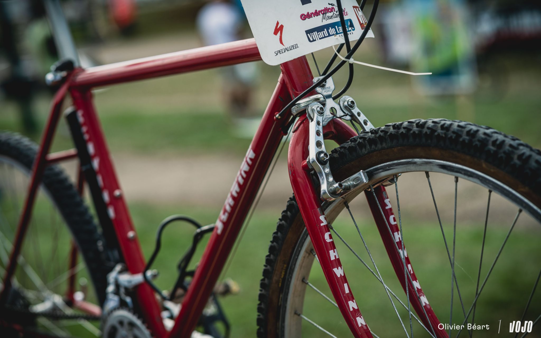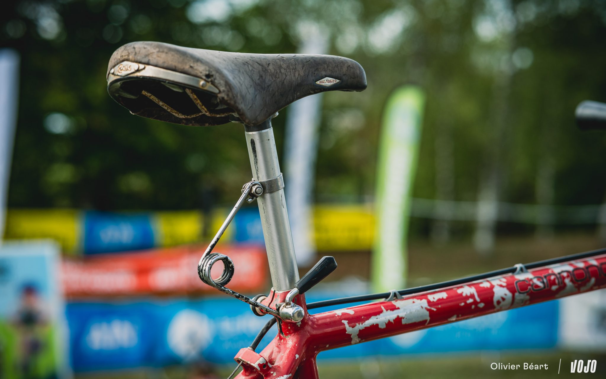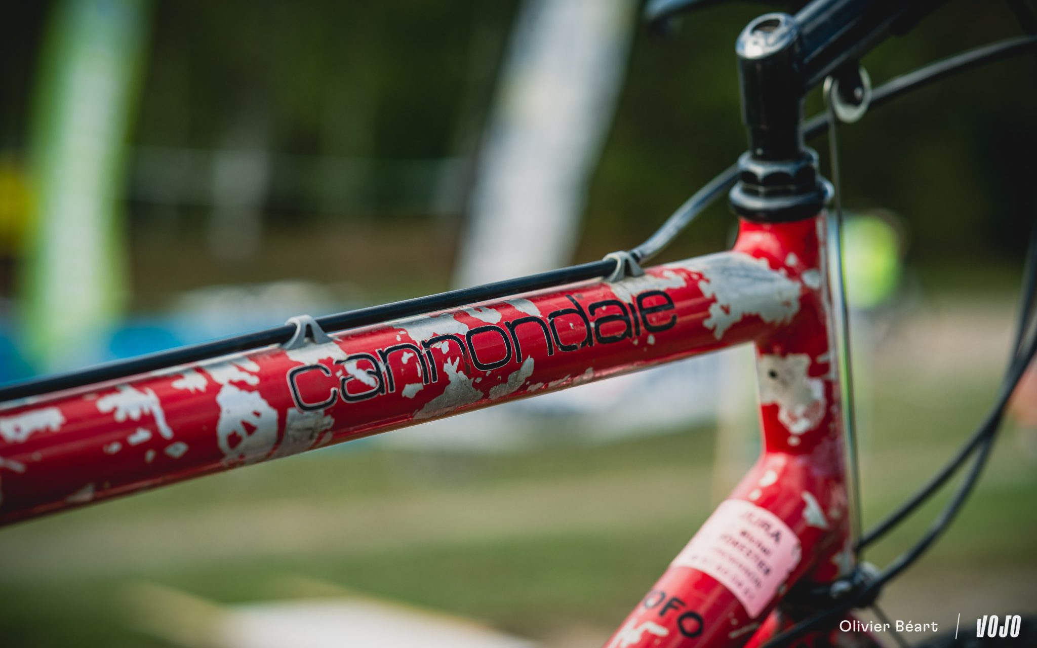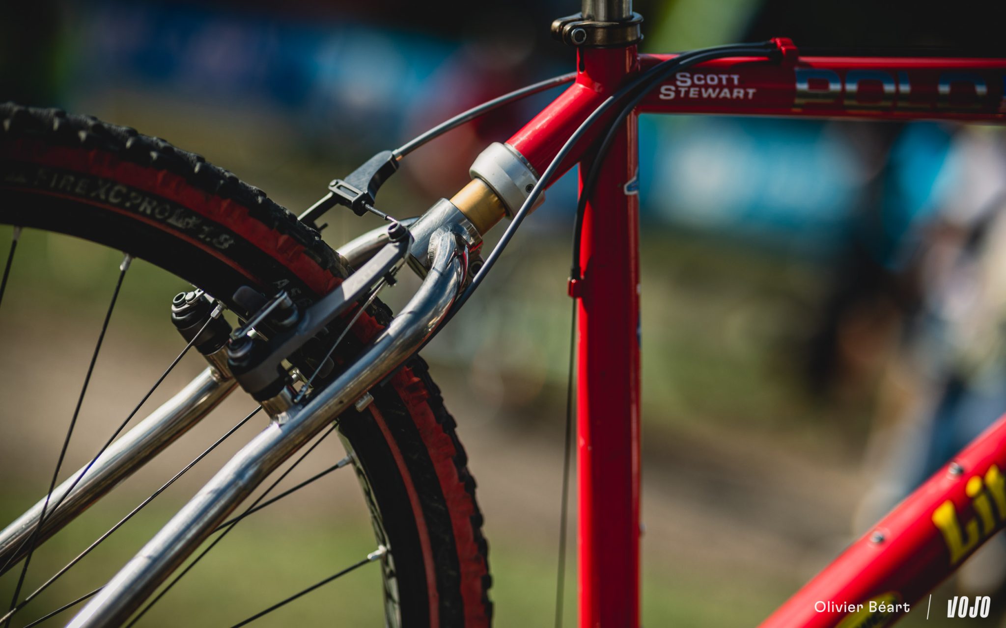 Le moins qu’on puisse dire, c’est que ce vélo a vécu ! Et il est également rempli d’une charge émotionnelle bien particulière, puisqu’il s’agit du vélo de Michel Forestier, disparu un peu plus tôt dans l’année. Pour rappel, c’est à lui qu’on doit le nom de « la Forestière » et il a été le premier champion du monde français (en catégorie Vétérans, en 1987 à Villard-de-Lans). S’il a gagné ce premier titre au guidon d’un Diamondback en acier, Michel Forestier se voit proposer en 1988 un Cannondale SM1000 en aluminium par Chamonix Mountainbike.
