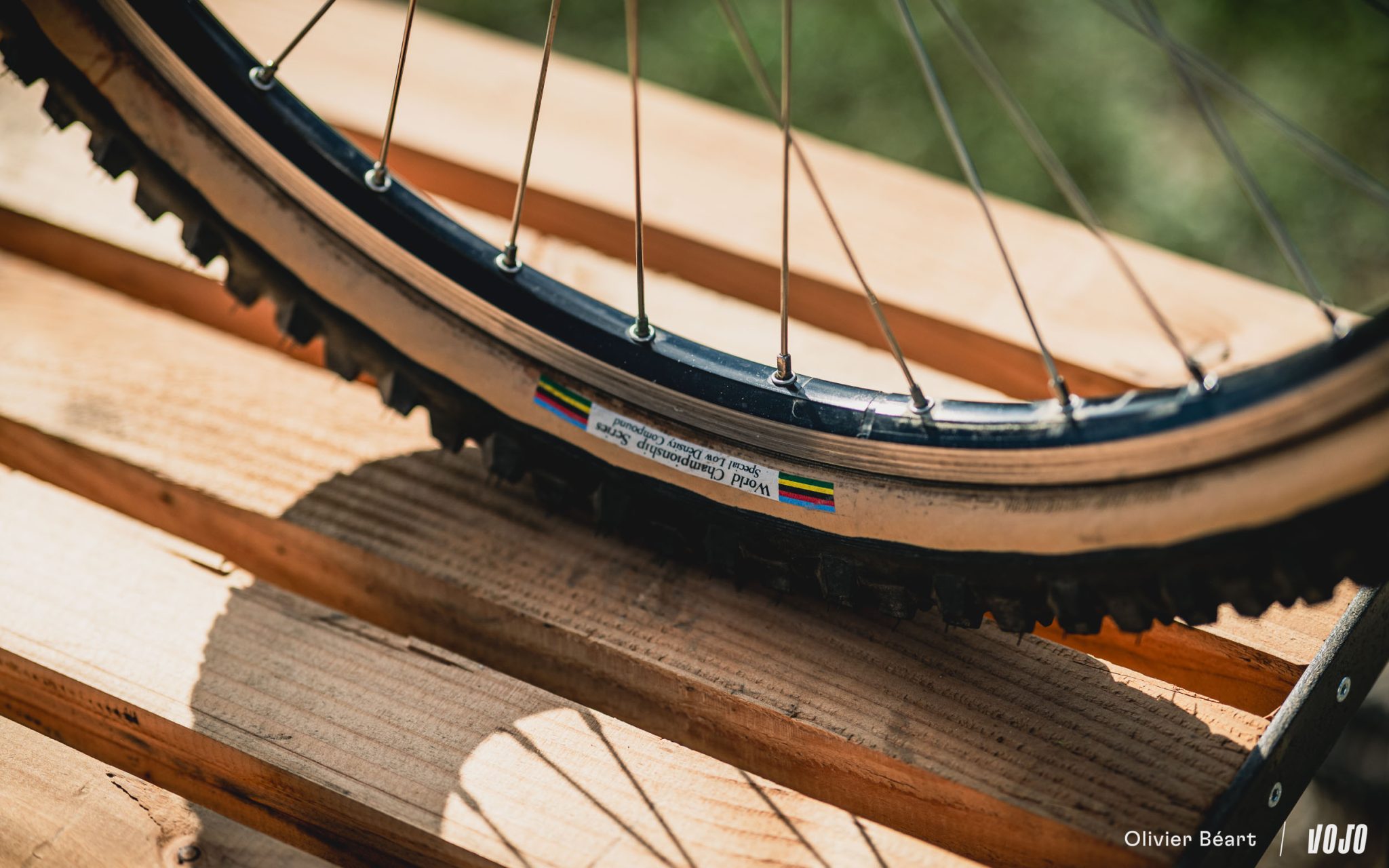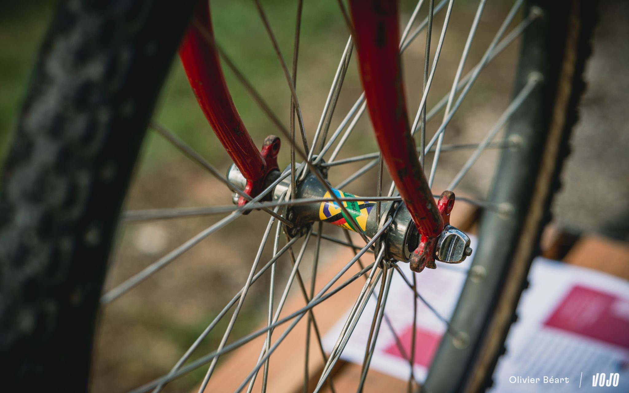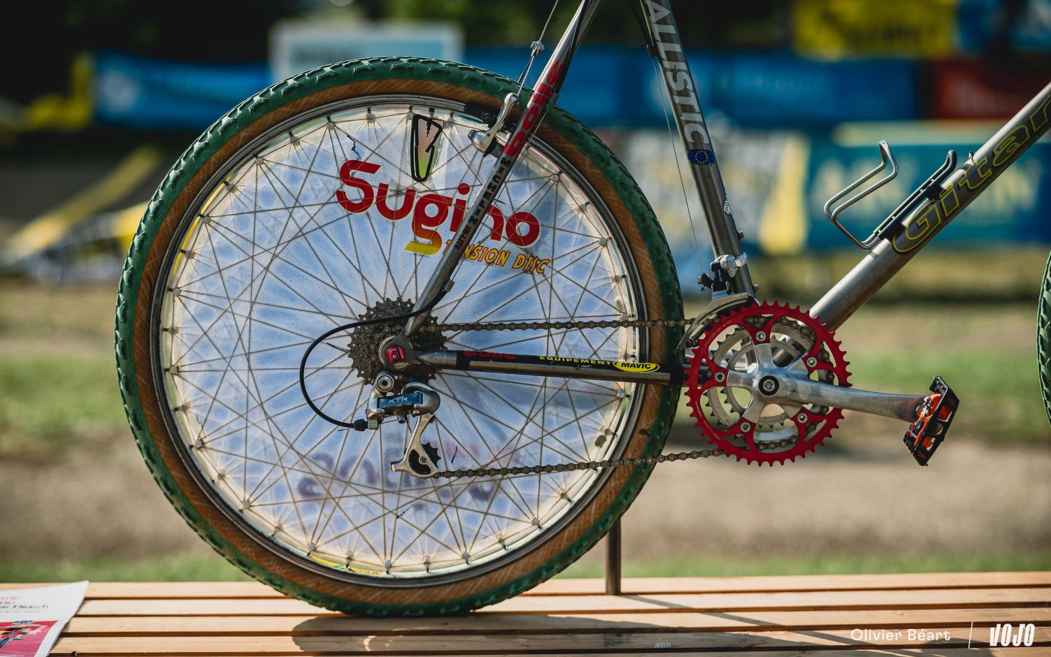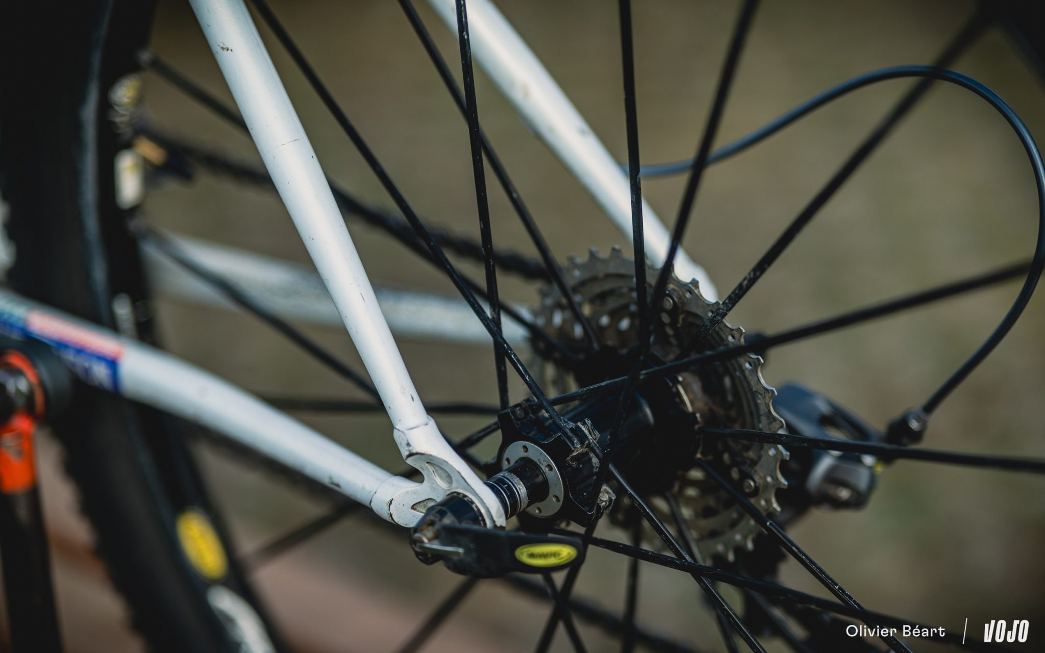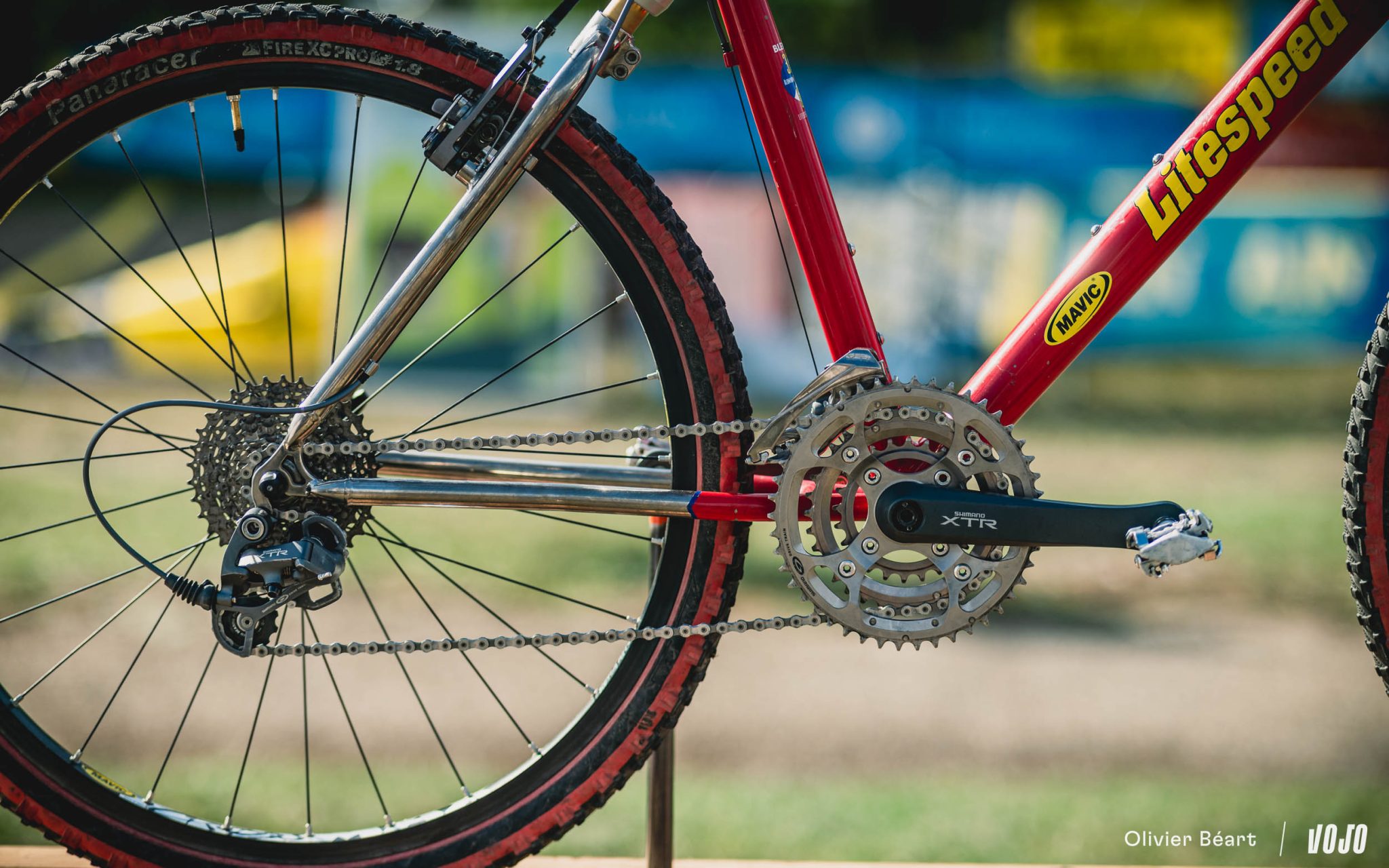 Son vélo est monté en Shimano XTR, sans fourche à suspension, que Thomas jugeait à l’époque trop peu rigide et manquant de maintien pour son gabarit. On remarque aussi les pneus Michelin Service course avec la première gomme verte (qui a bien séché aujourd’hui, mais on apprécie que Thomas ait gardé le vélo entièrement « dans son jus »), et la fameuse roue Sugino Tension Disc avec ses rayons kevlar qui faisait rêver tous les pilotes à l’époque. Elle était censée apporter plus de confort et de traction à la roue arrière, et on reconnaissait de loin le bruit caractéristique qu’elle faisait sur les chocs en descente avec ses larges flasques plastique qui protégeaient les rayons.