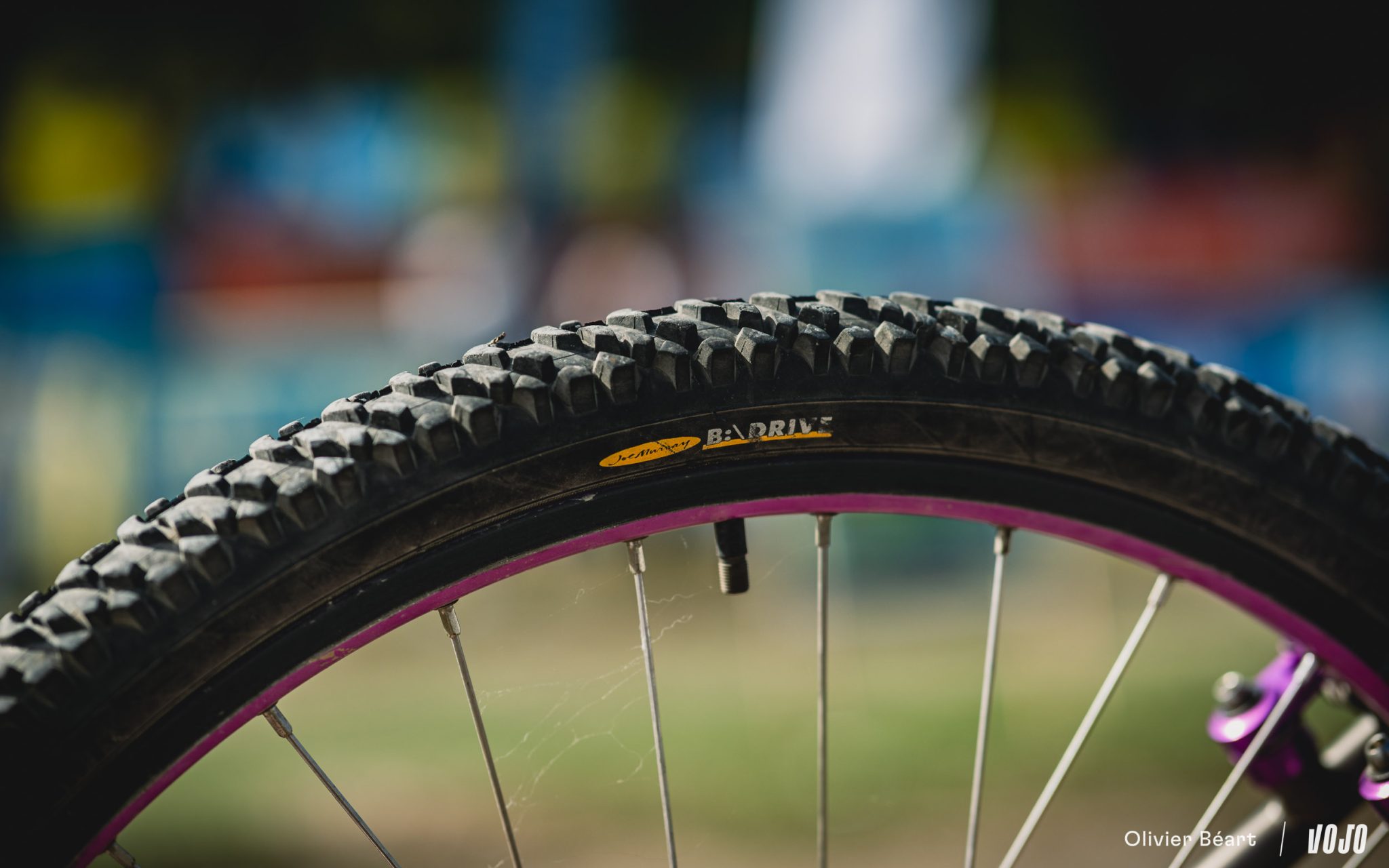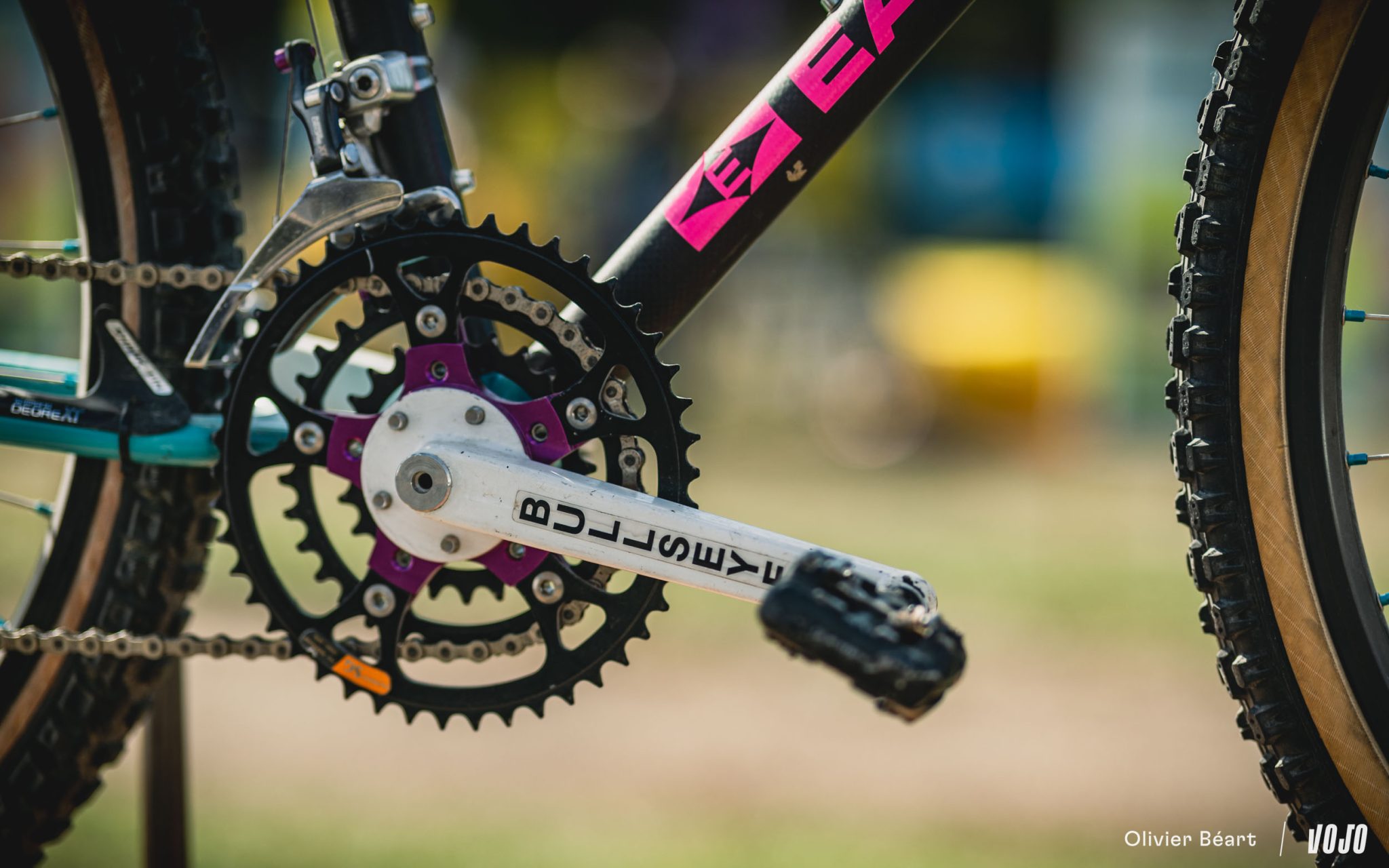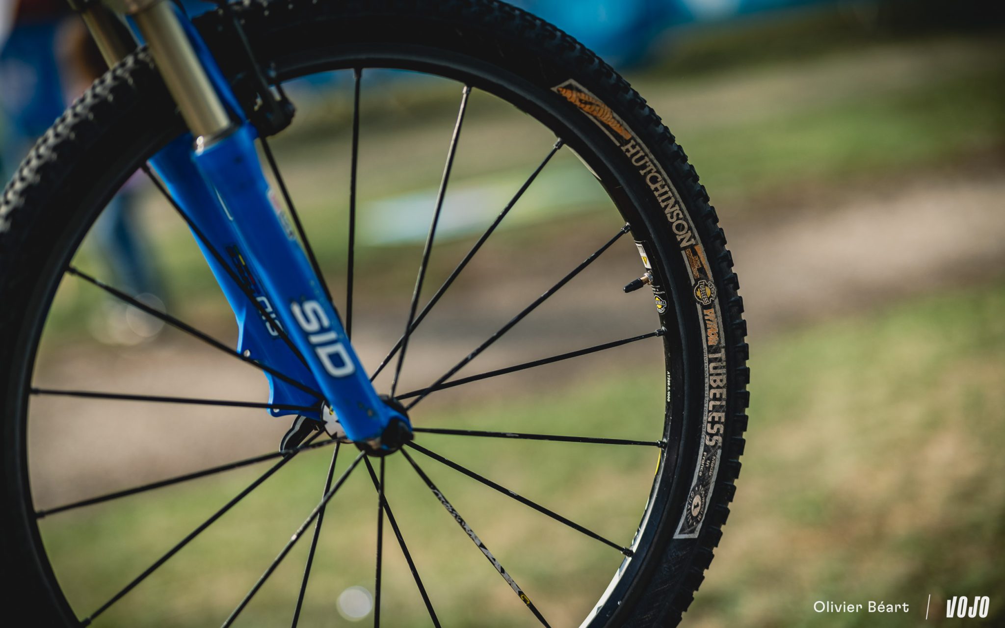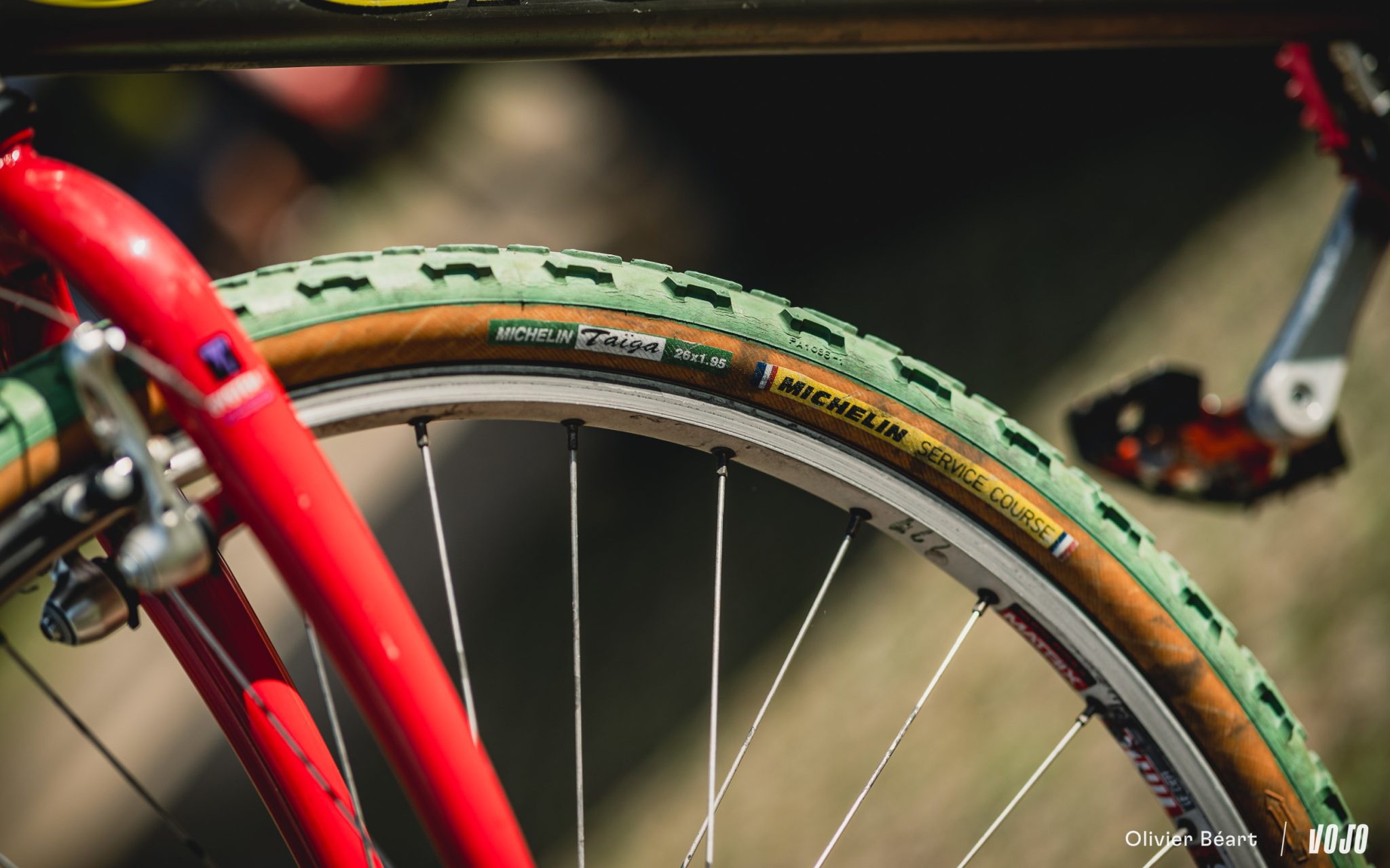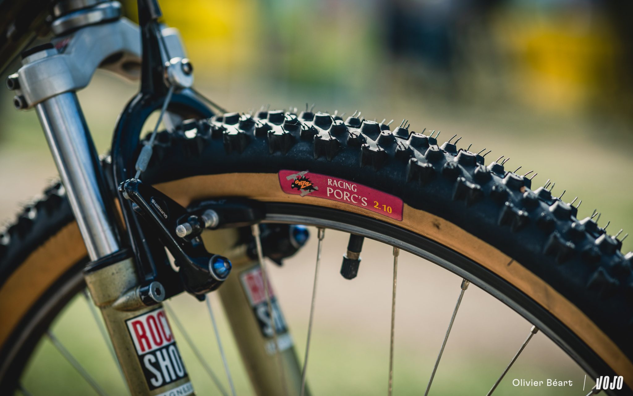 Son vélo est monté en Shimano XTR, sans fourche à suspension, que Thomas jugeait à l’époque trop peu rigide et manquant de maintien pour son gabarit. On remarque aussi les pneus Michelin Service course avec la première gomme verte (qui a bien séché aujourd’hui, mais on apprécie que Thomas ait gardé le vélo entièrement « dans son jus »), et la fameuse roue Sugino Tension Disc avec ses rayons kevlar qui faisait rêver tous les pilotes à l’époque. Elle était censée apporter plus de confort et de traction à la roue arrière, et on reconnaissait de loin le bruit caractéristique qu’elle faisait sur les chocs en descente avec ses larges flasques plastique qui protégeaient les rayons.
