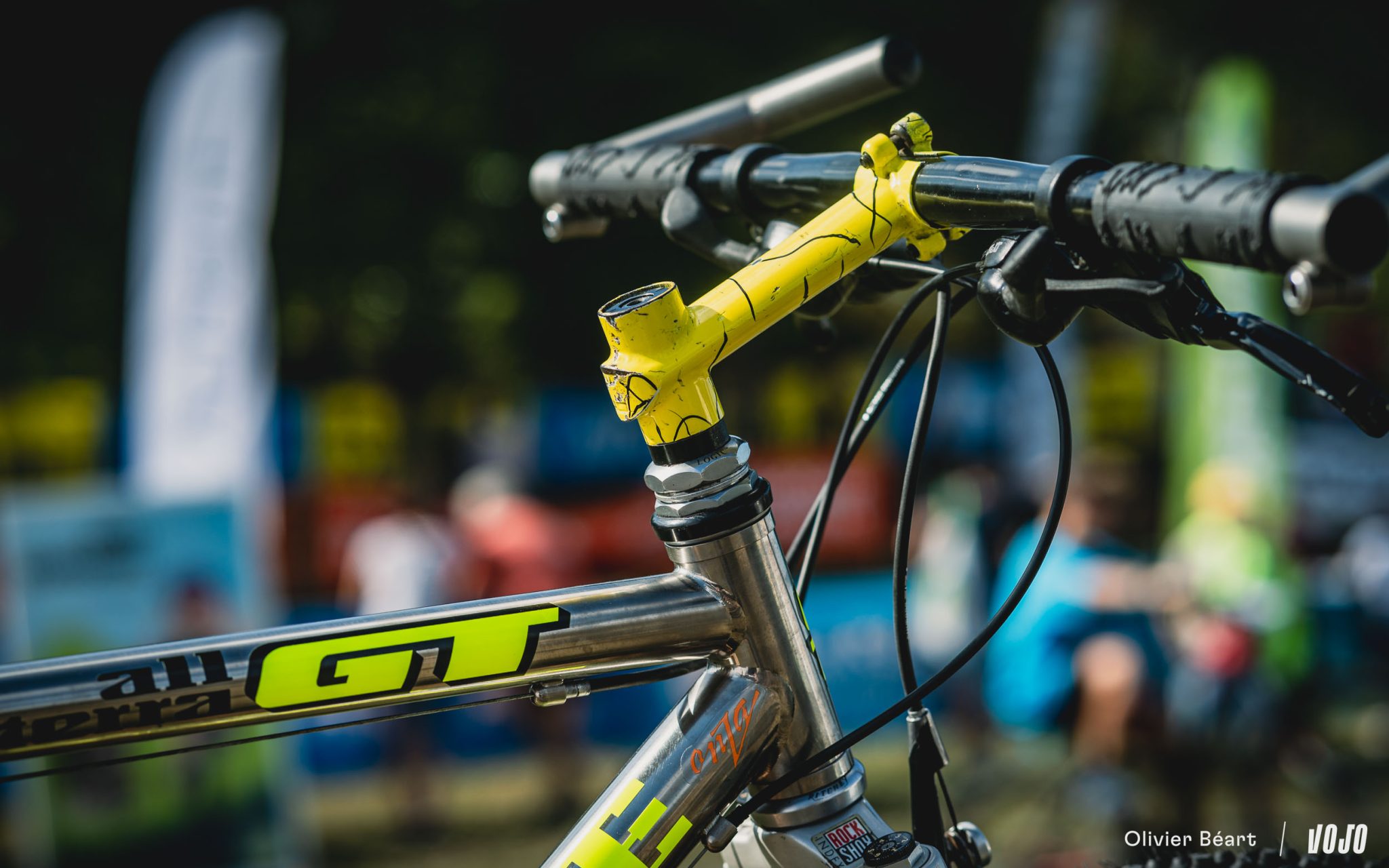 Faisant partie de la collection de Romuald (logique, c’est un titane), il a été monté de manière quasi identique au vélo roulé par la championne américaine à son arrivée chez GT. Le groupe XTR n’étant pas encore sorti, c’est du XT qui équipe le vélo au niveau de la transmission, avec une RockShox Mag20 à l’avant, des cornes Onza titane et les mythiques pneus Onza Porcupine (très recherchés par les collectionneurs). Notez aussi la magnifique potence GT réversible.