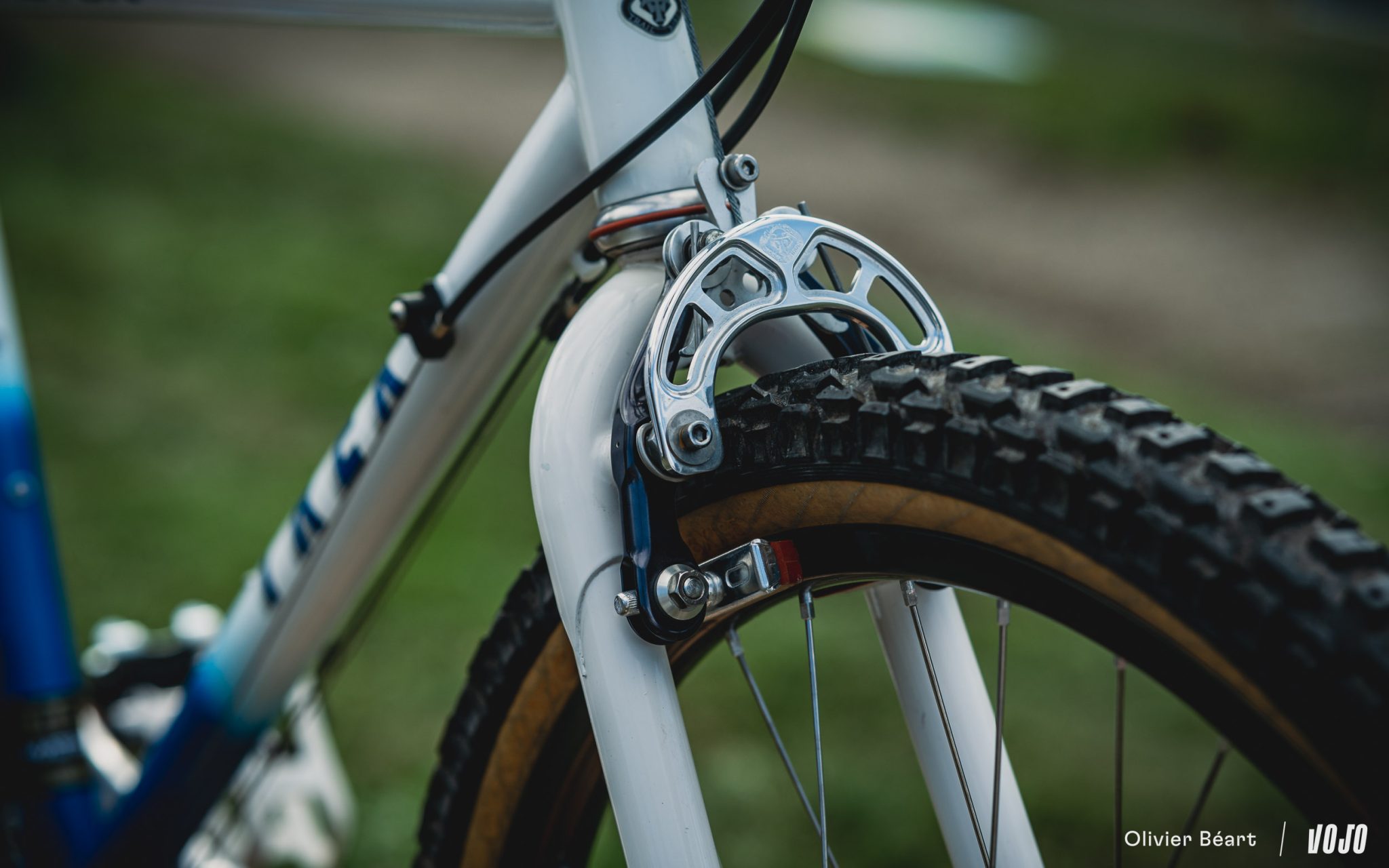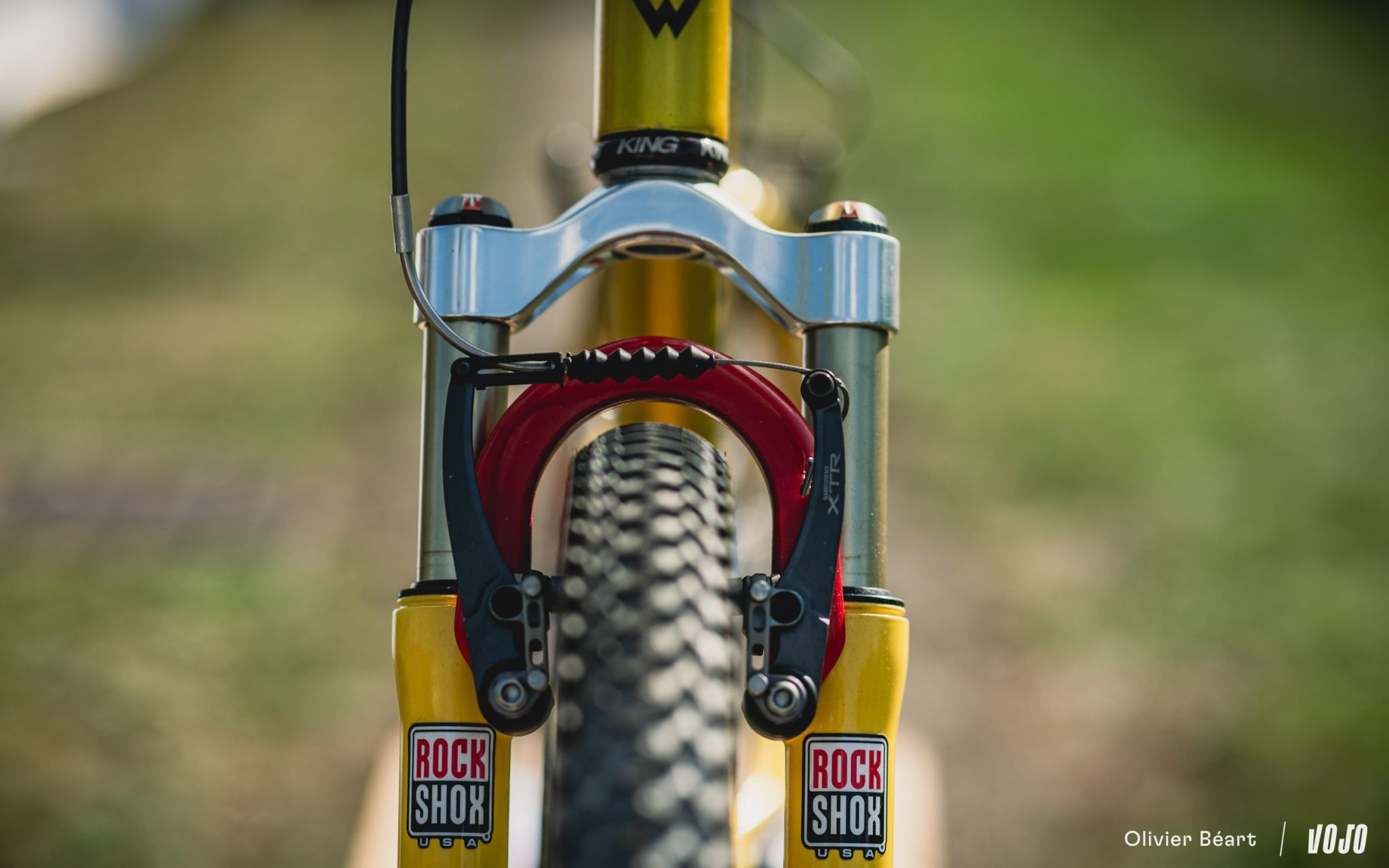 La fourche et la potence sont faites par Steve Potts, et l’équipement provient largement de chez WTB, partenaire du team, avec notamment les moyeux à graisseurs et les freins, qui sont les mythiques WTB Roller Cam, connus pour leur puissance. Vous noterez aussi la présence d’un pédalier et de jantes/pneus Specialized. Cela peut surprendre aujourd’hui, mais à l’époque c’était courant car Specialized était un des premiers à développer des composants spécifiques VTT et fournissait aussi Cannondale en monte d’origine !