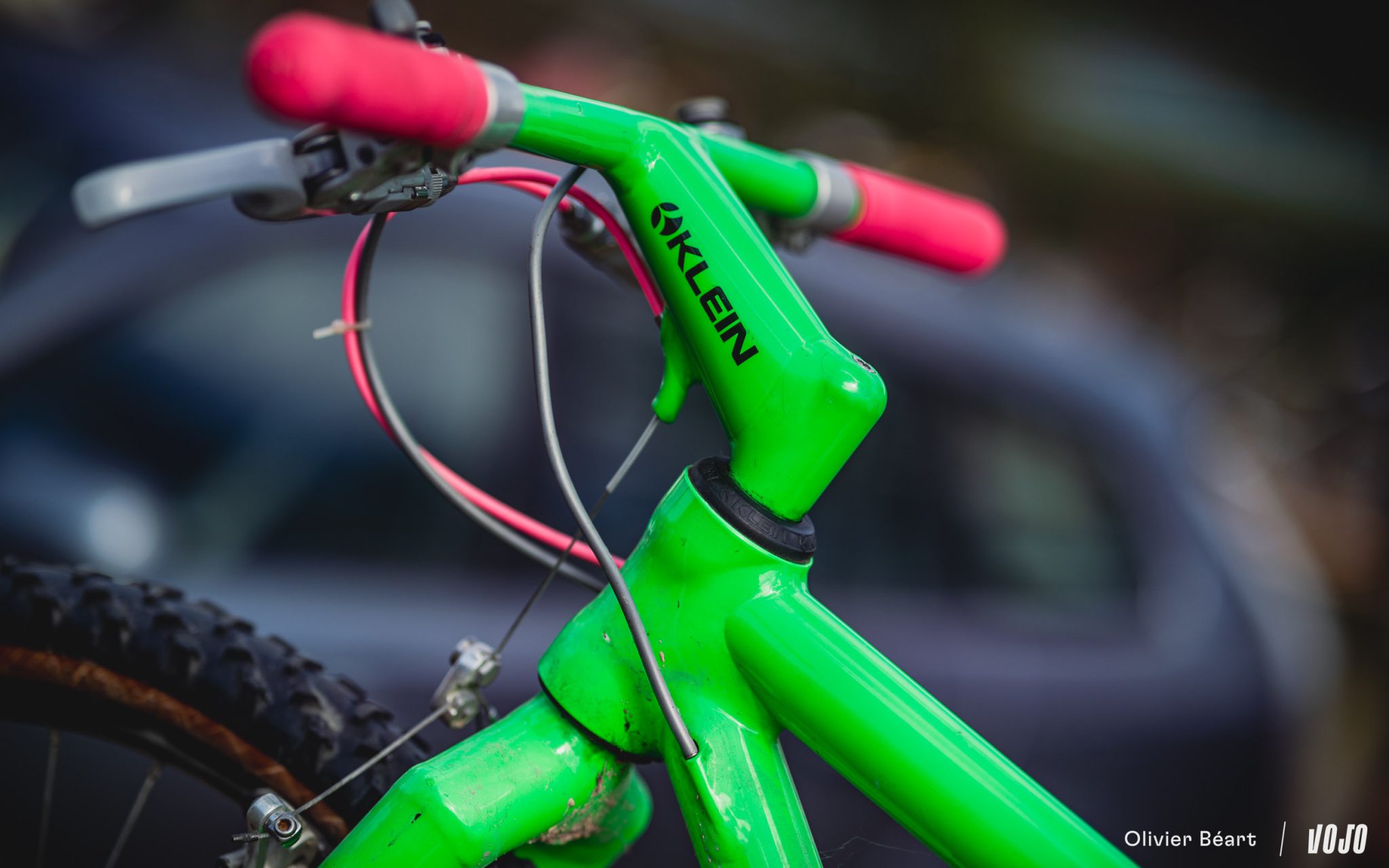 Le montage présenté ici est équipé du groupe Campagnolo. Eh oui, on l’a oublié, mais la marque italienne a bien proposé des groupes VTT. La finesse et le raffinement du dérailleur et du pédalier tranchent avec le design très particulier des leviers de freins, pensés pour l’ergonomie et la puissance de freinage. En 1995, Klein a été racheté par le groupe Trek, qui a malheureusement aujourd’hui arrêté de produire des vélos sous ce nom. Quant à Gary Klein, il se passionne aujourd’hui pour les… télescopes ! En attendant, la cote de ses vélos des années 90 explose et c’est un « must have » pour tout collectionneur.