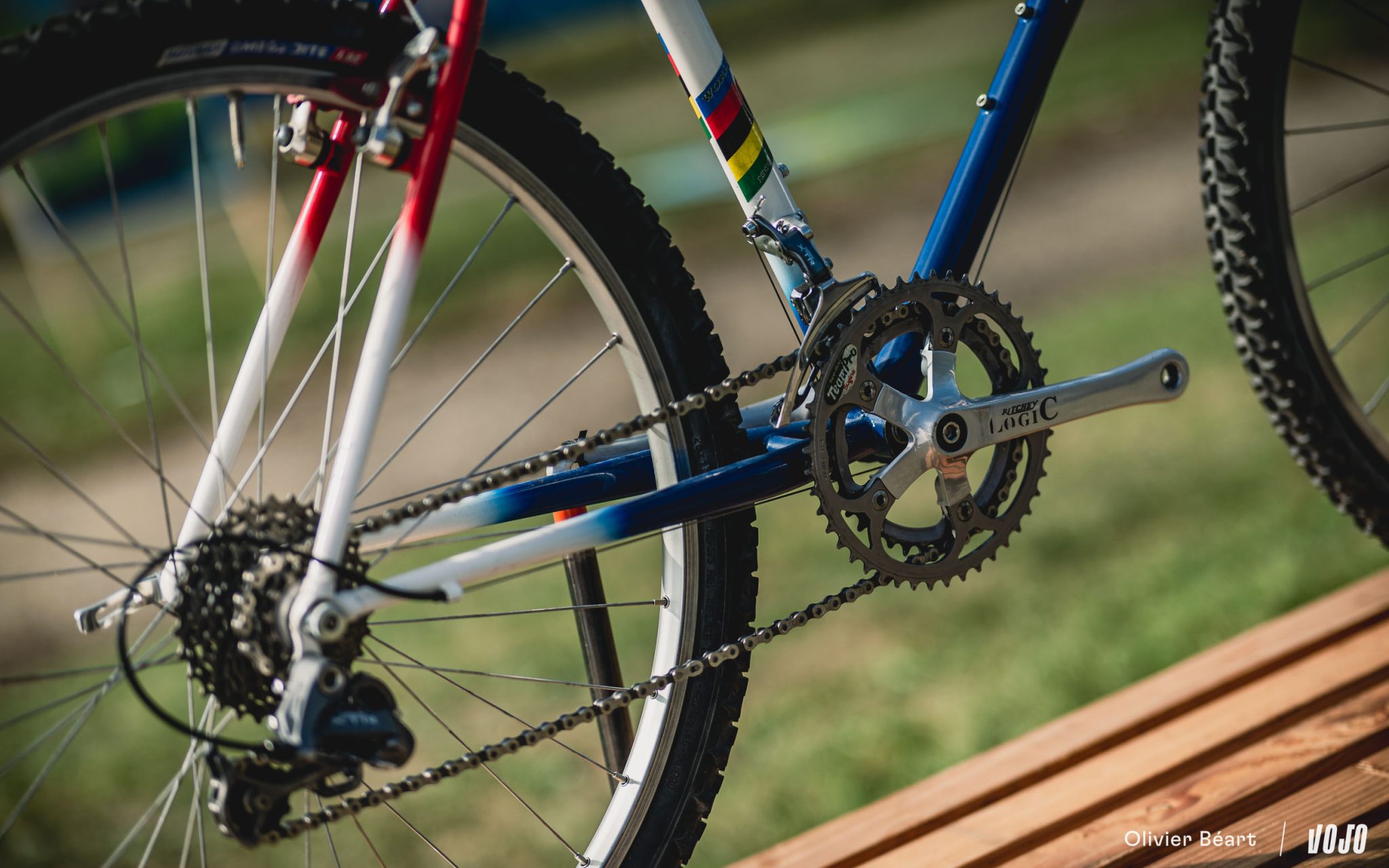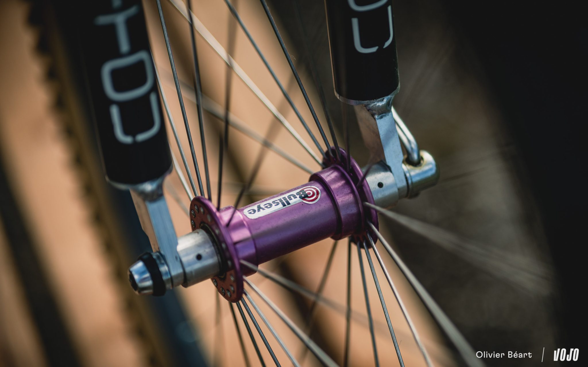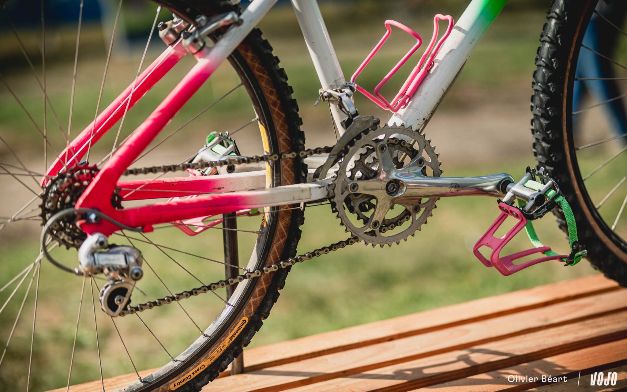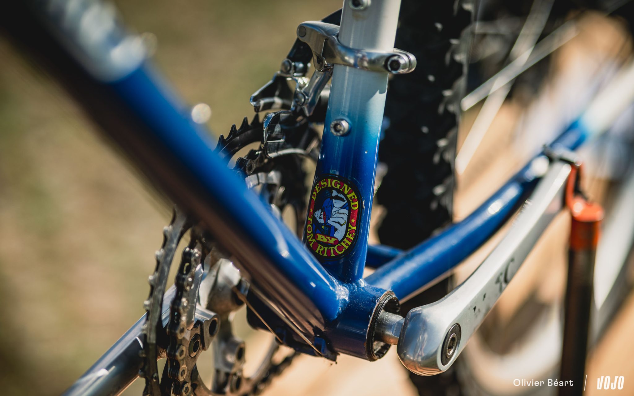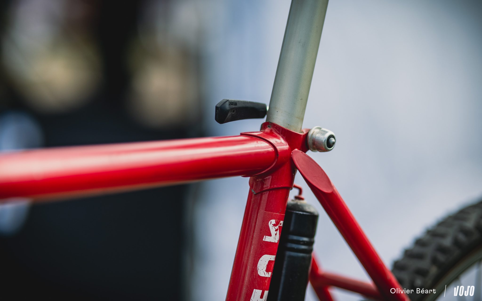 Le montage est aux petits oignons, avec le groupe Shimano XT M730 qui venait de sortir et des roues custom, montées par Michel Forestier lui-même sur base de moyeux Mavic Paris-Gao-Dakar et équipées de pneus Ritchey. Remarquez aussi le « Hite Rite » au niveau de la tige de selle. Inventé par Joe Breeze, ce petit accessoire permettait de monter et descendre sa tige de selle facilement dans les zones techniques. L’ancêtre de la tige de selle télescopique !