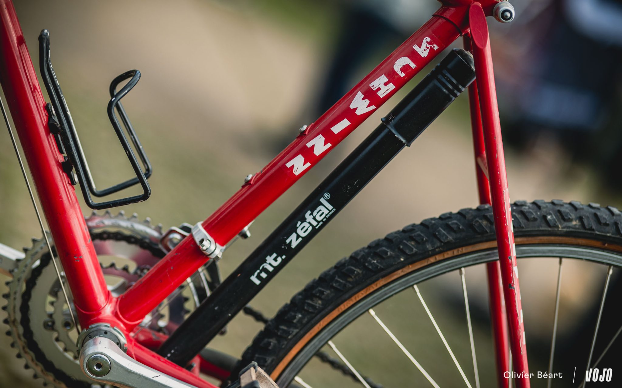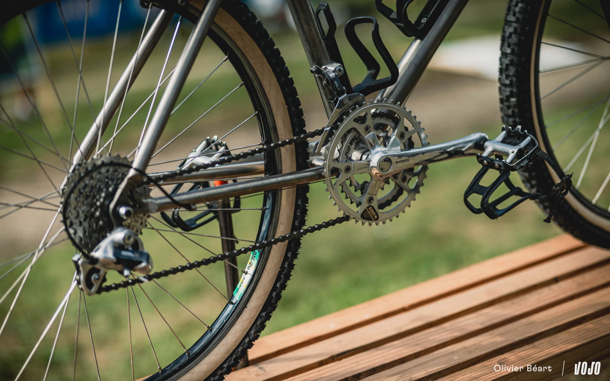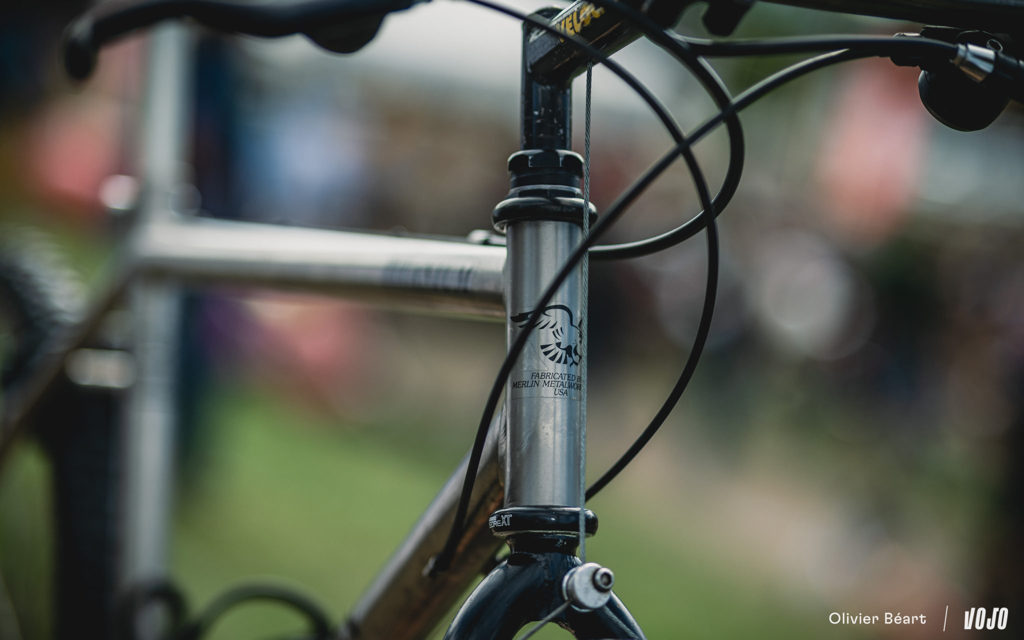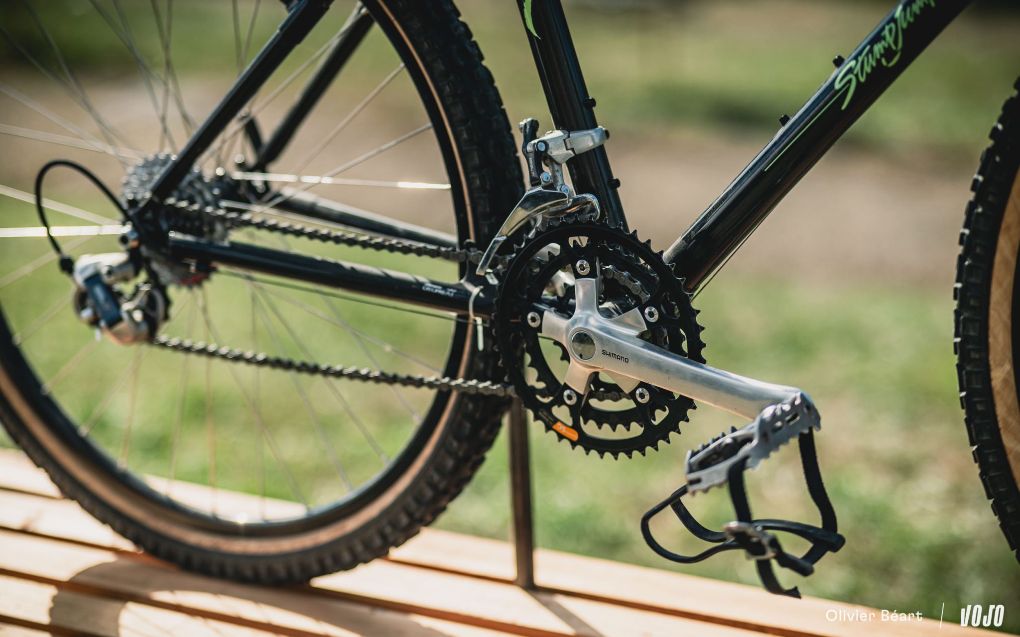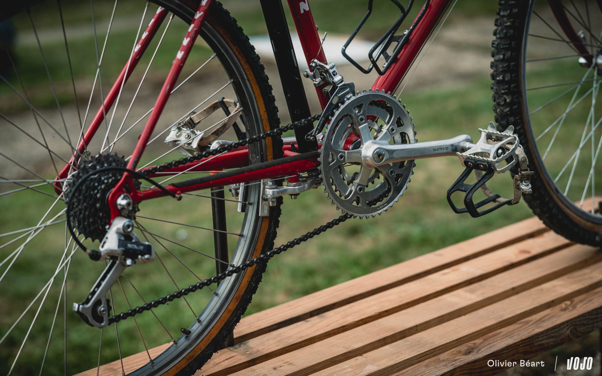 Le montage est aux petits oignons, avec le groupe Shimano XT M730 qui venait de sortir et des roues custom, montées par Michel Forestier lui-même sur base de moyeux Mavic Paris-Gao-Dakar et équipées de pneus Ritchey. Remarquez aussi le « Hite Rite » au niveau de la tige de selle. Inventé par Joe Breeze, ce petit accessoire permettait de monter et descendre sa tige de selle facilement dans les zones techniques. L’ancêtre de la tige de selle télescopique !