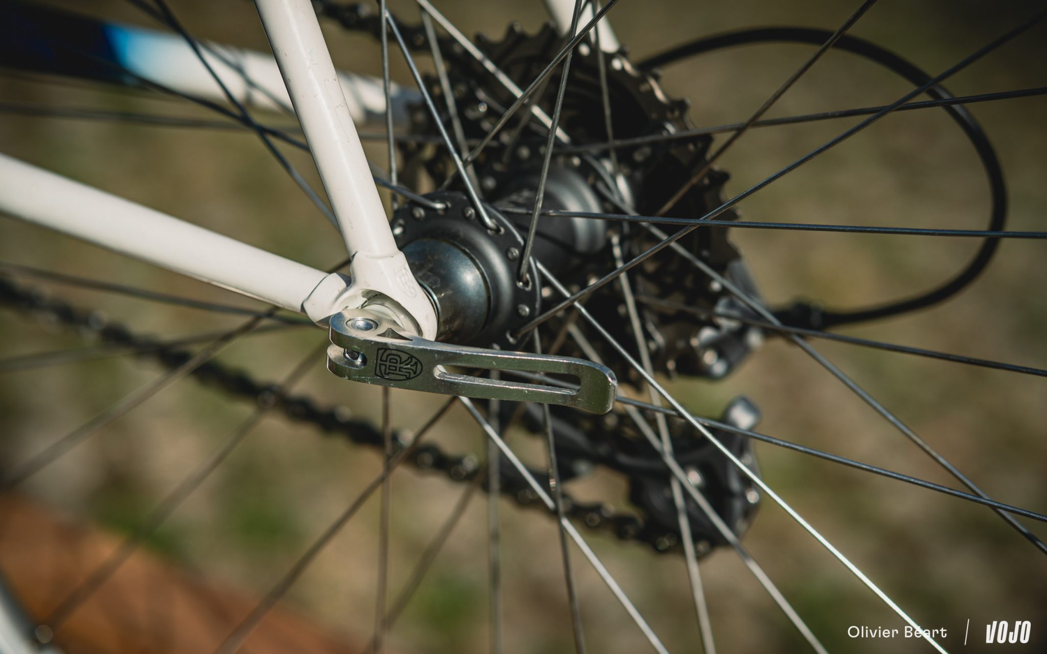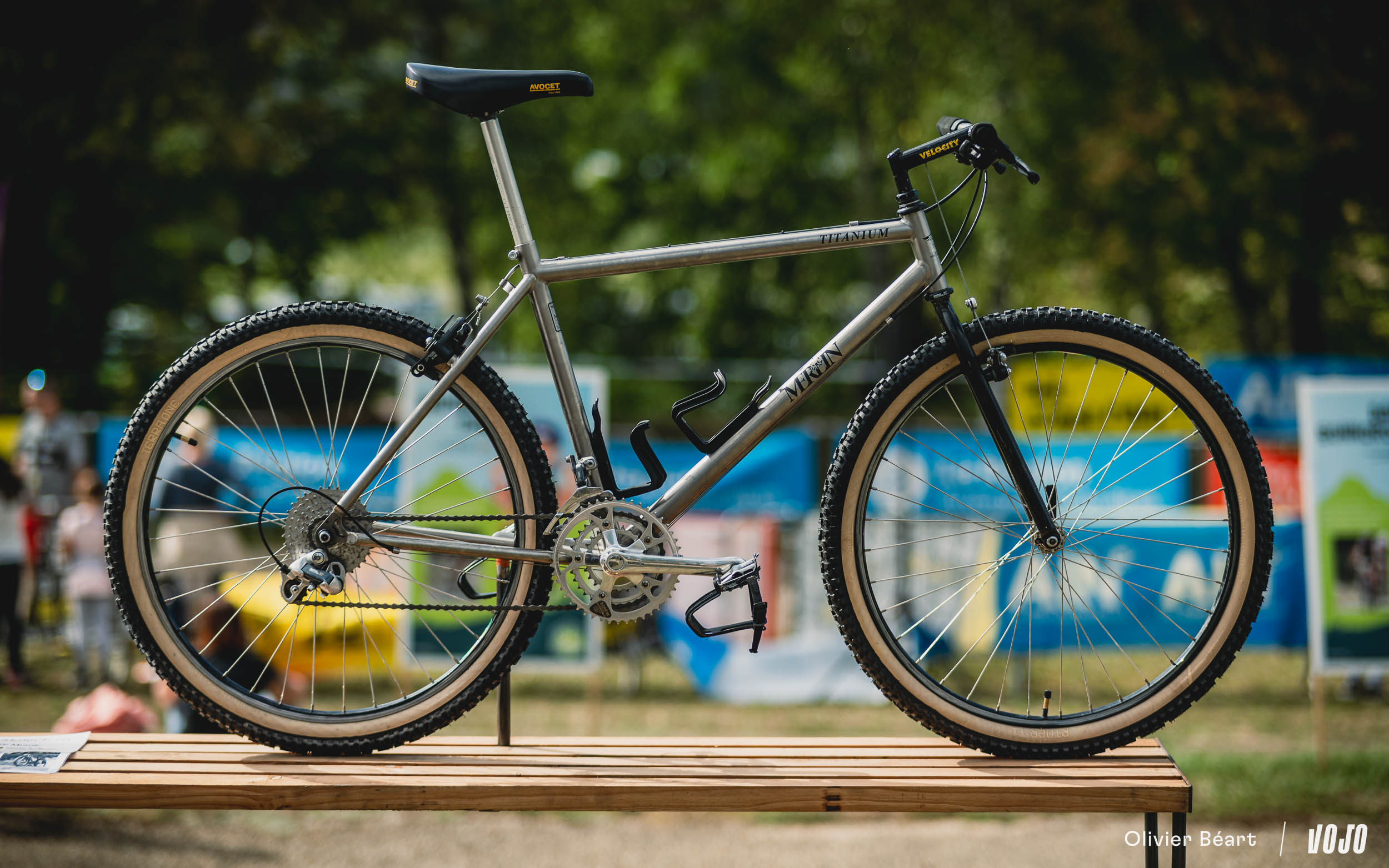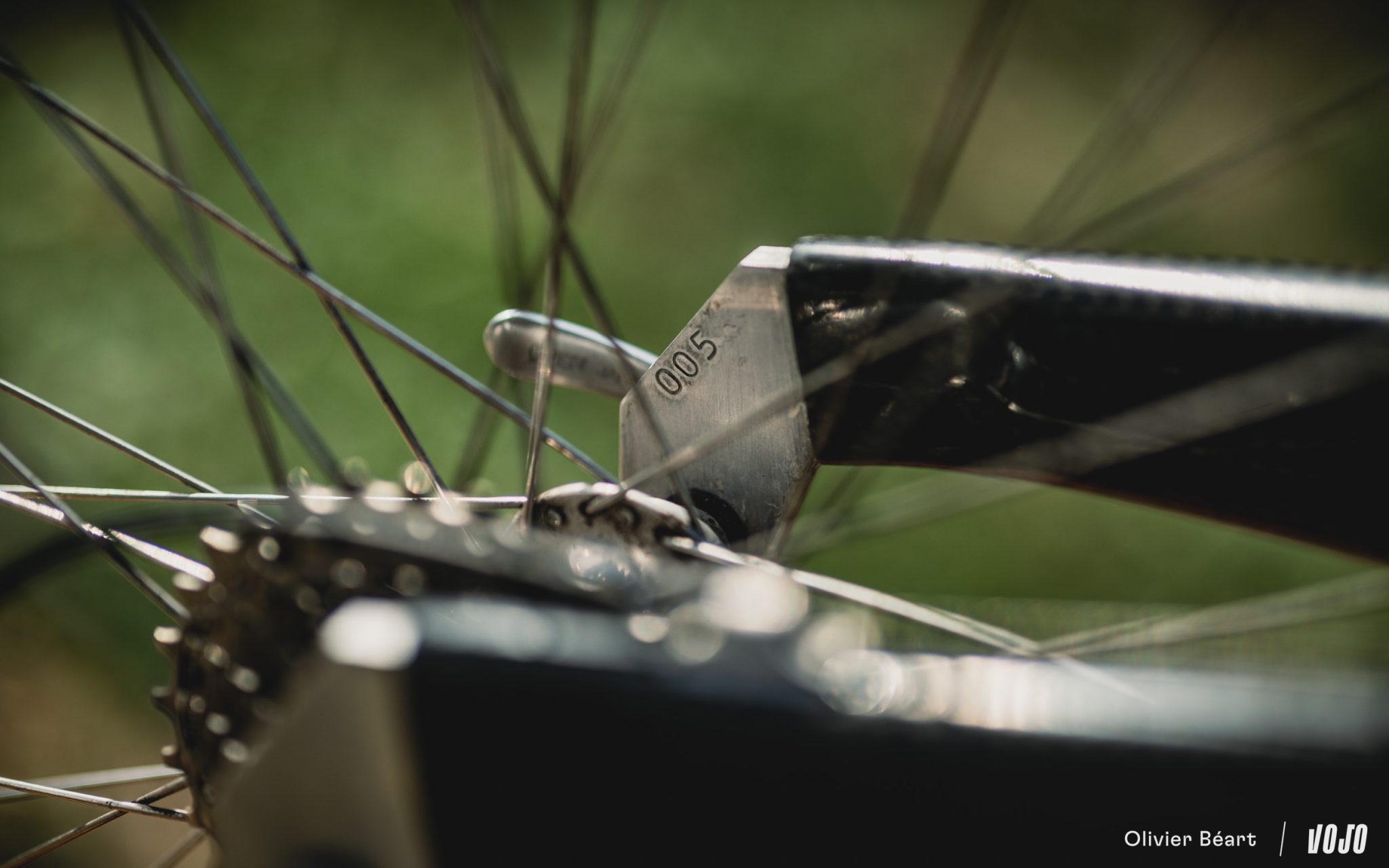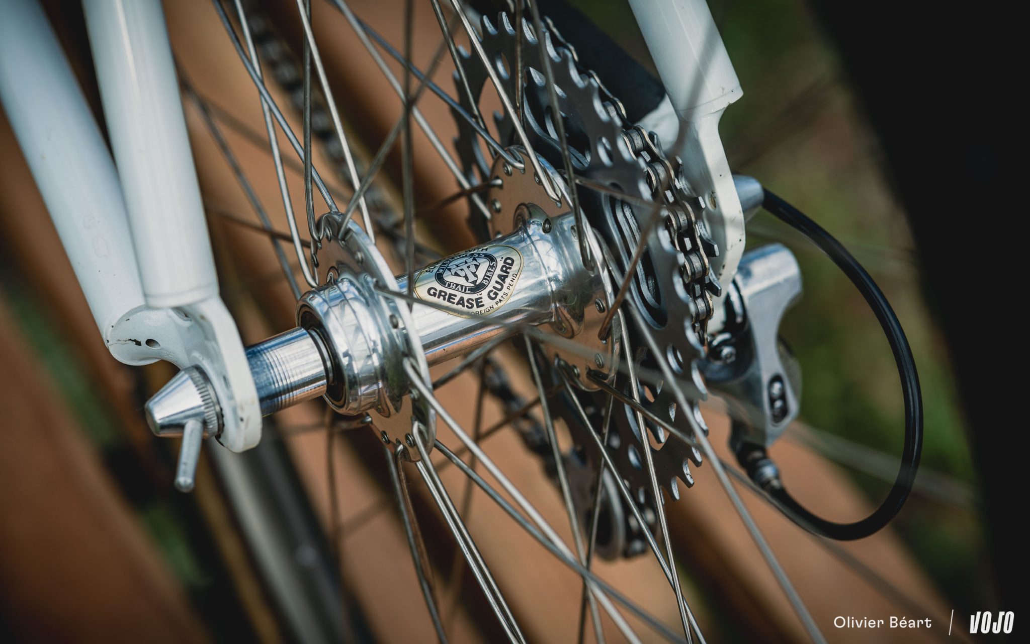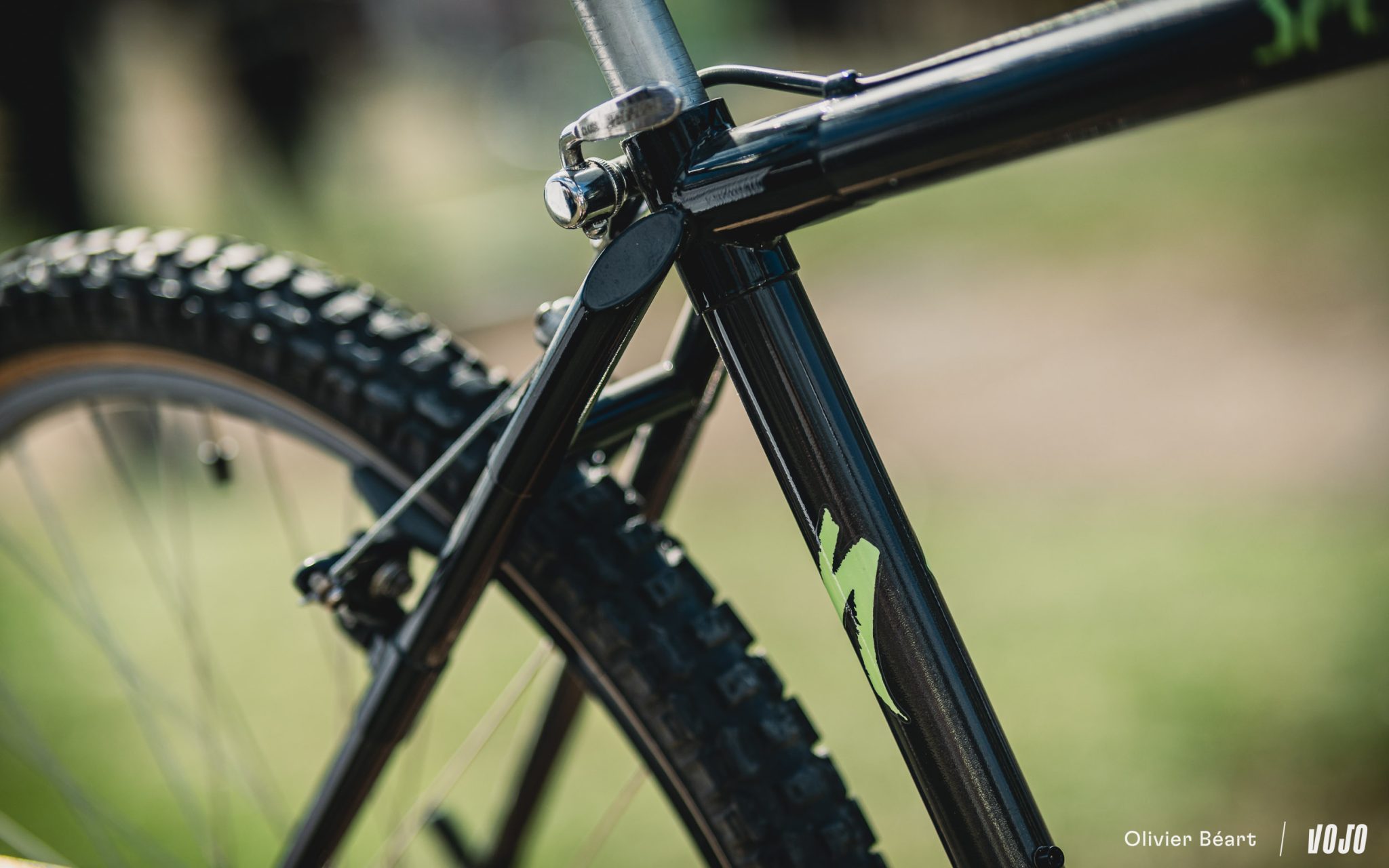 Le montage est aux petits oignons, avec le groupe Shimano XT M730 qui venait de sortir et des roues custom, montées par Michel Forestier lui-même sur base de moyeux Mavic Paris-Gao-Dakar et équipées de pneus Ritchey. Remarquez aussi le « Hite Rite » au niveau de la tige de selle. Inventé par Joe Breeze, ce petit accessoire permettait de monter et descendre sa tige de selle facilement dans les zones techniques. L’ancêtre de la tige de selle télescopique !