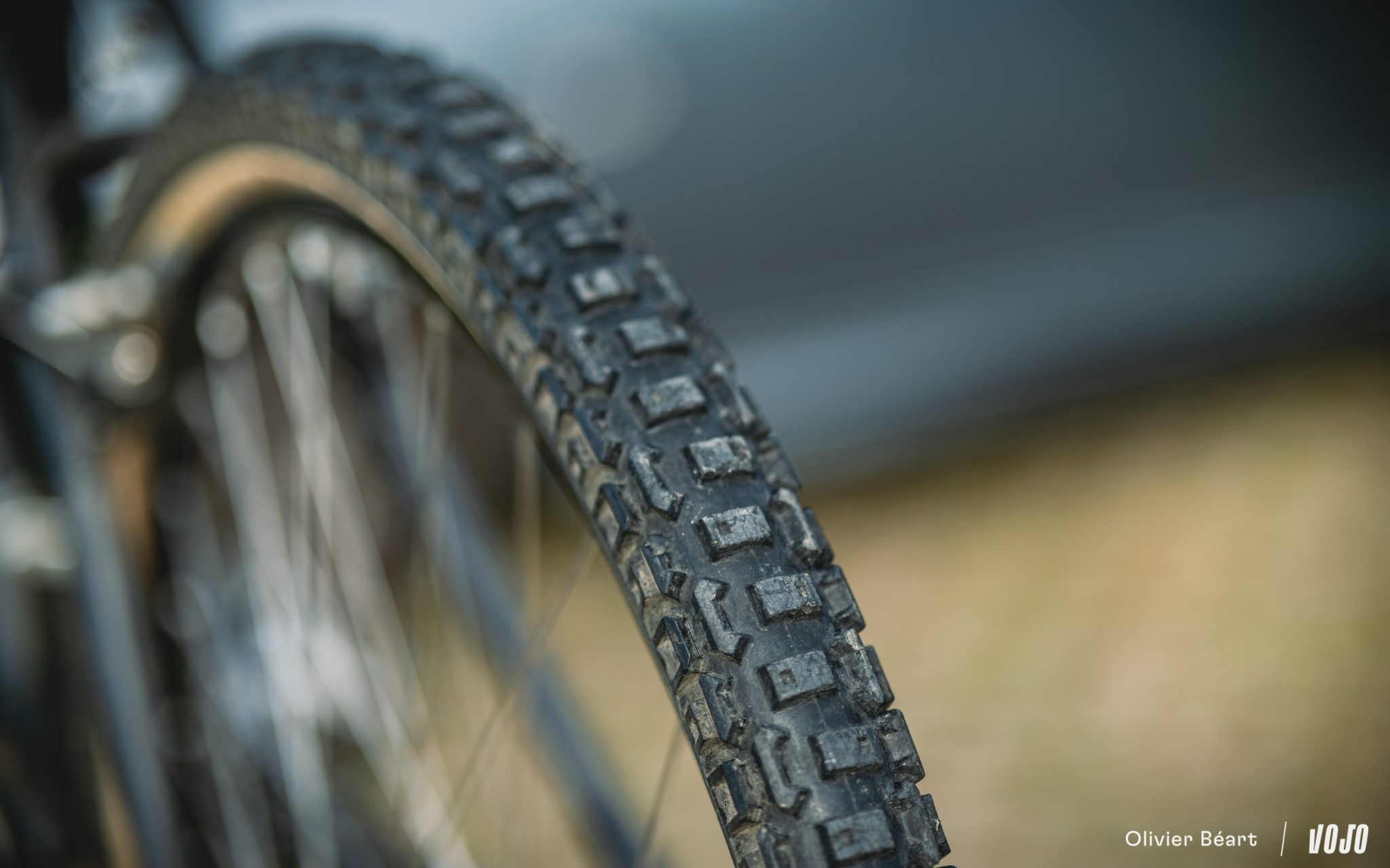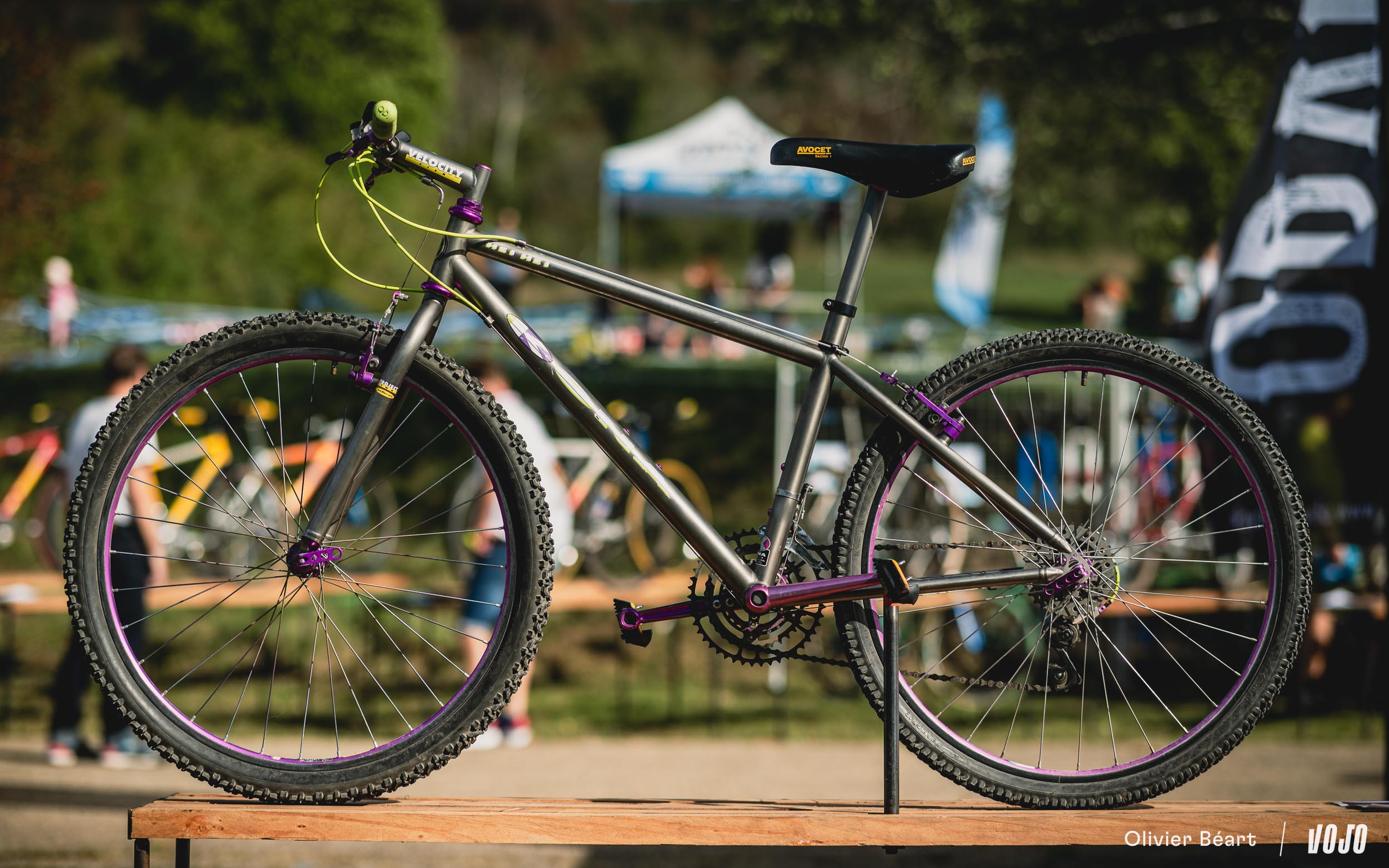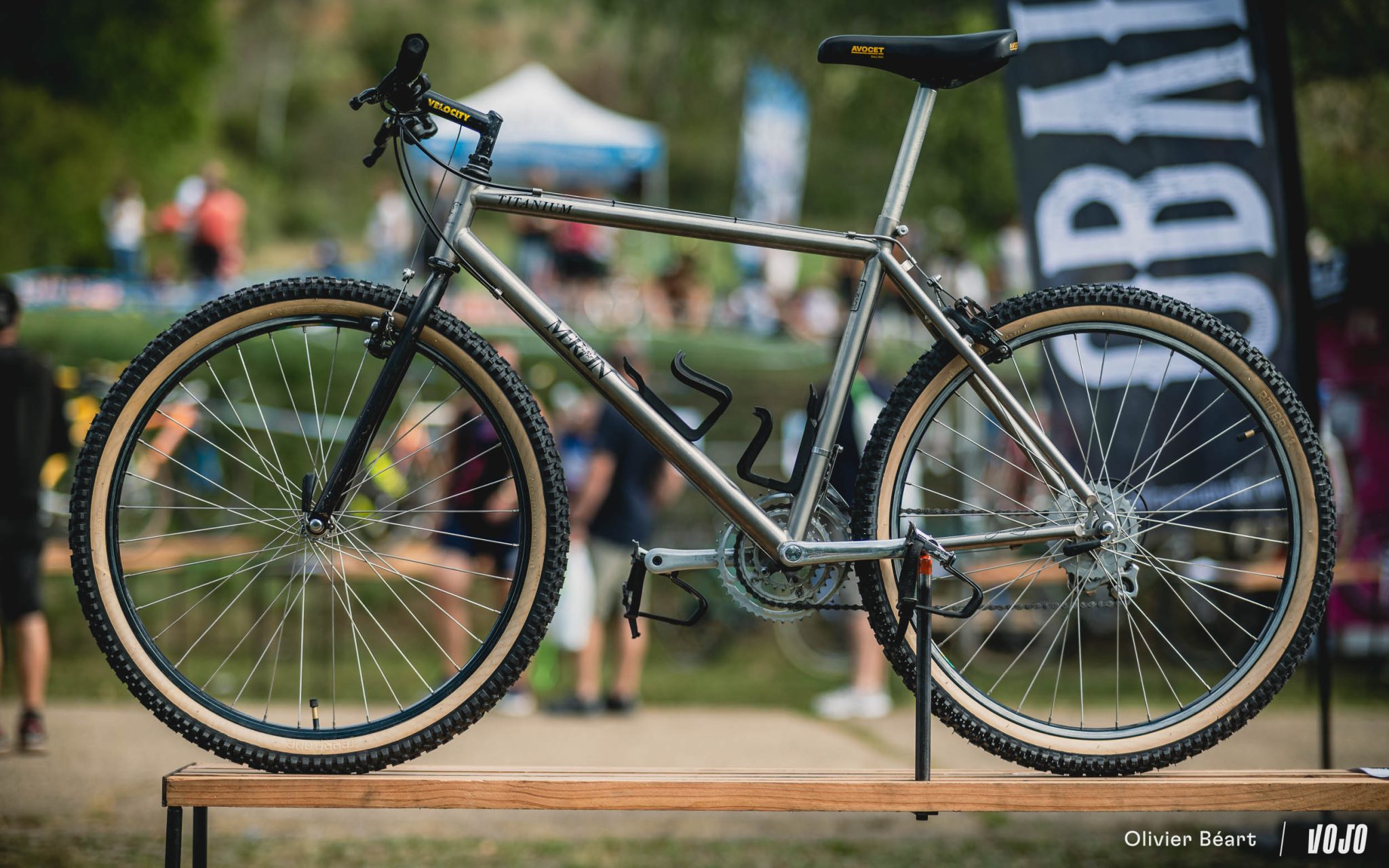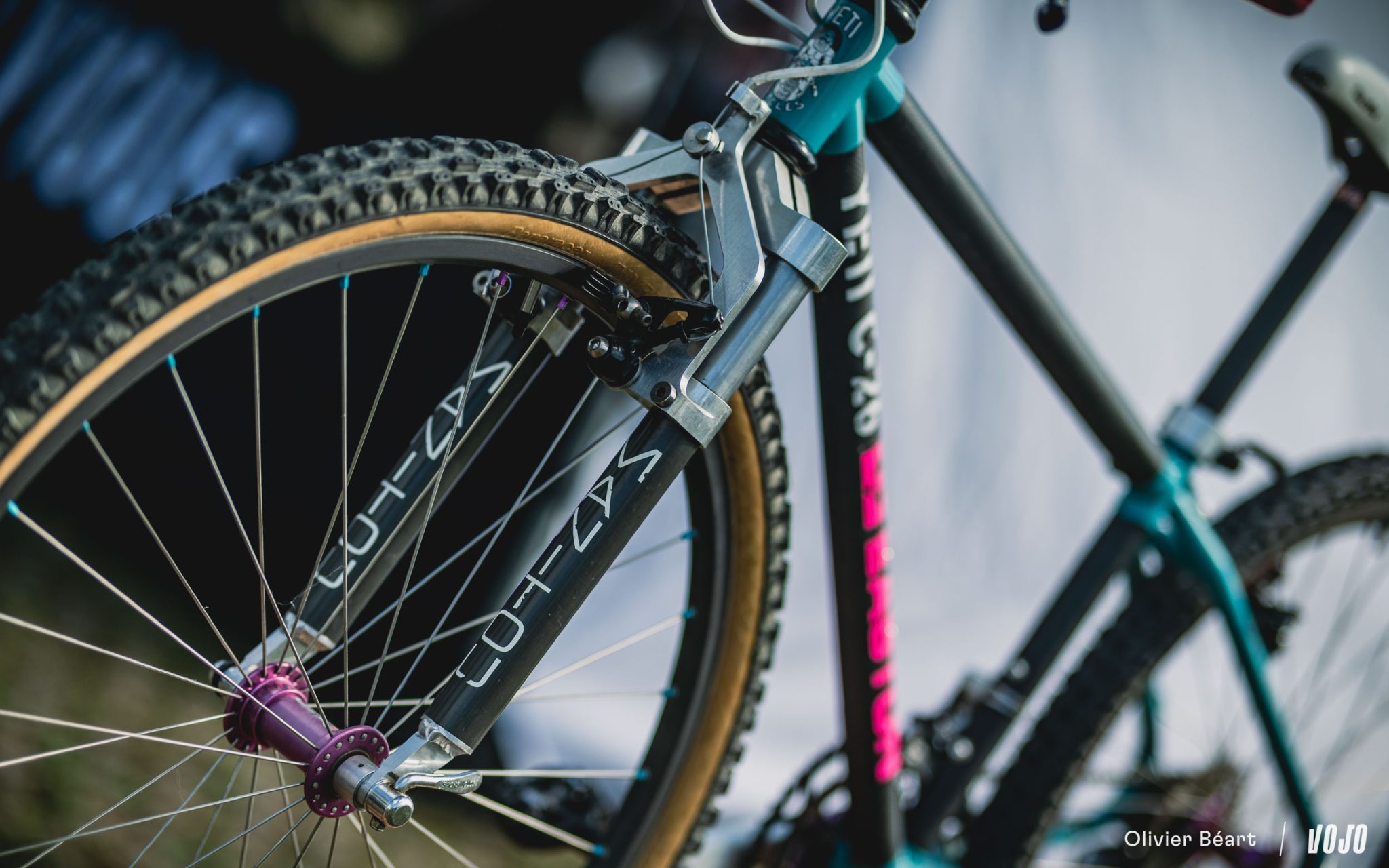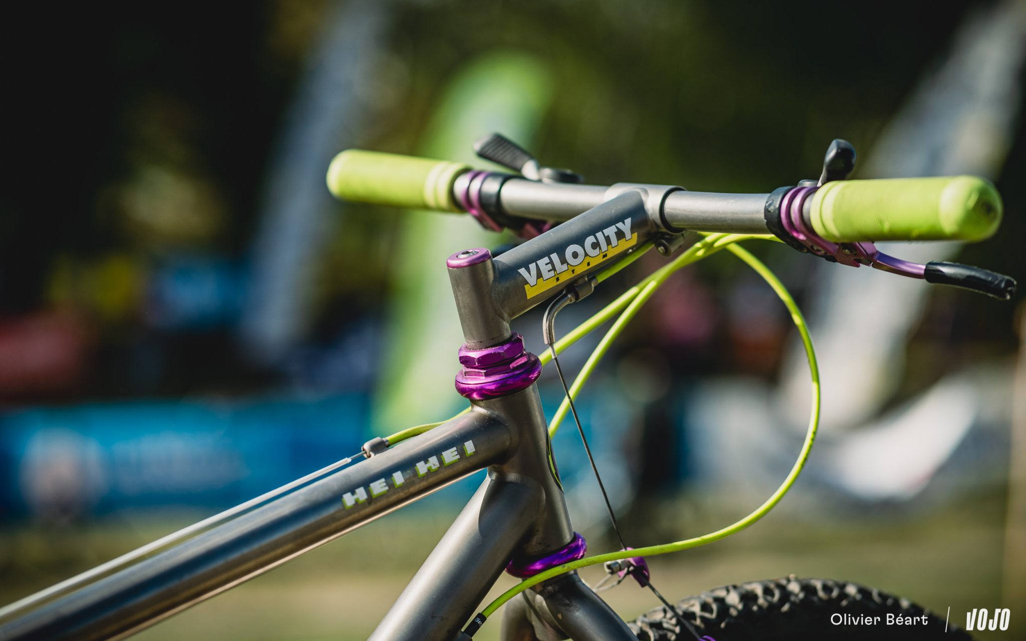 Ce Kona Hei Hei compte également toute la panoplie d’accessoires Velocity en titane, conçus par Joe Murray, dont la mythique fourche « Type 2 », extrêmement rare dans sa version titane. Même les pneus sont dessinés par Joe Murray !