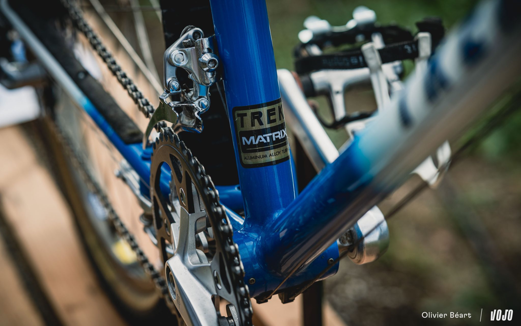 On commence avec un exemplaire exceptionnel : un Trek rarissime, datant de 1987. La célèbre marque américaine venait de développer une nouvelle technique d’assemblage des cadres… sans soudures. On est donc en présence d’un cadre fait de tubes en aluminium Easton 7178, présentés comme « impossibles à souder », assemblés par collage sur des raccords en aluminium moulés. Déjà rien que l’utilisation de l’alu était peu courante a cette époque où l’acier régnait en maître, et la communication officielle de l’époque mentionne que « ce type de construction élimine le stress de la soudure sur l’aluminium et permet d’utiliser des tube de section moyenne. L’idée est d’obtenir un vélo plus confortable que ceux constitués de tubes aluminium oversize (comme Klein et Cannondale en utilisaient, NDLR), tout en réduisant le poids d’environ 300g. »