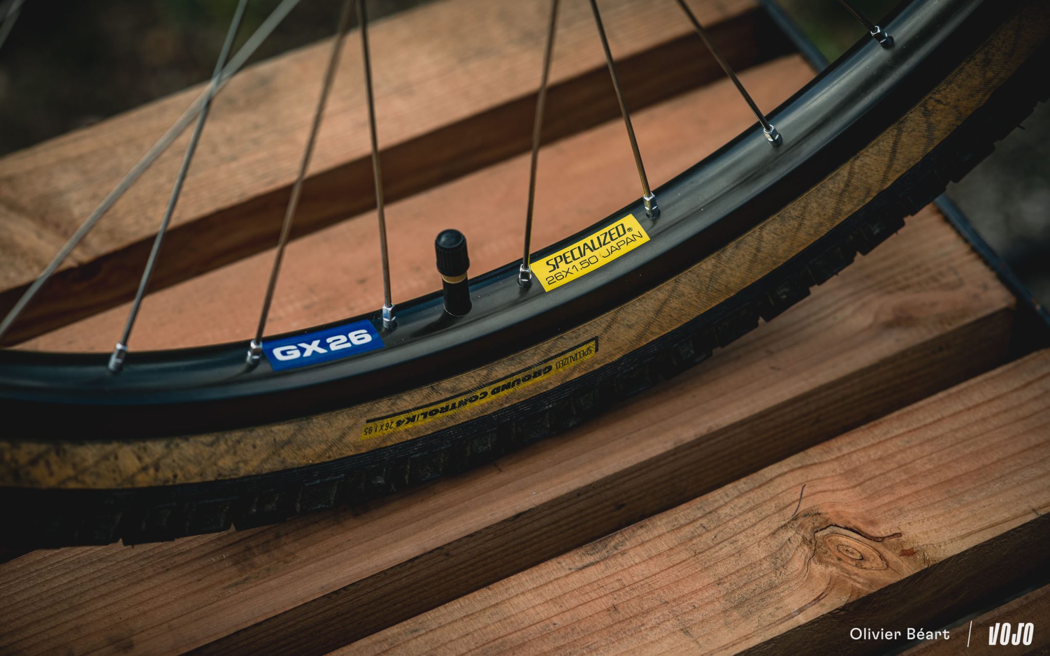 Le montage, réalisé par Pierre Bonnafous, membre éminent de GMTB, fait ici la part belle au Shimano XT M730 et aux composants Specialized. On remarque notamment les pneus Specialized Ground Control, premiers pneus à disposer d’un dessin spécifiquement imaginé pour le VTT et pas juste « copiés » façon pneus de motocross miniaturisés. Notez aussi le prolongateur Profile qui crée presque un « double guidon ». Nous aurons l’occasion de vous reparler bientôt du Specialized Epic et de son incroyable histoire !