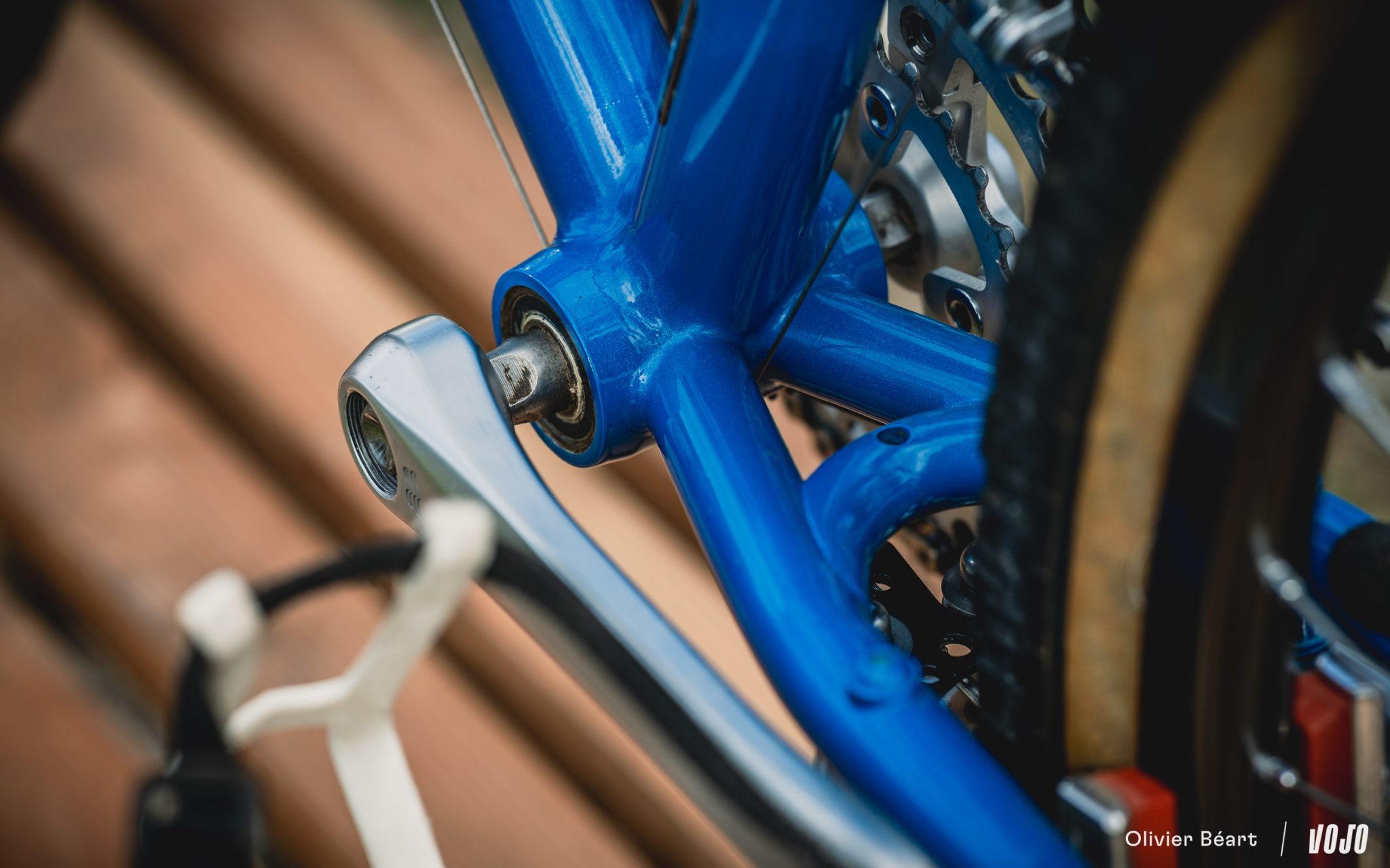 Il a la particularité d’être peint au niveau du triangle avant, fait en titane 6/4 au niveau de la douille, du boîtier et du tube diagonal pour plus de rigidité, alors que l’arrière reste en 3/2.5 pour l’effet suspension. C’est rare car le titane 6/4 n’est pas produit en tubes, mais en feuilles. Le tube diagonal, à la forme très particulière, est donc fait d’une feuille de titane pliée et soudée sur toute sa longueur !