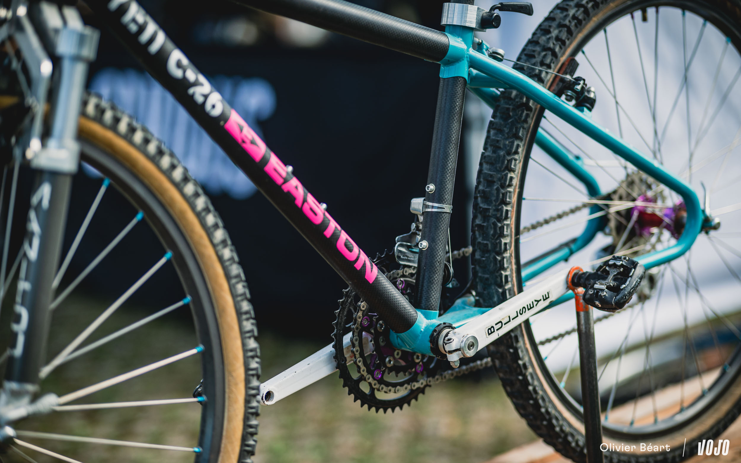 Encore plus rare et encore plus mythique, le Yeti C26 n’a jamais été commercialisé et les seuls exemplaires existants ont été construits pour le team. L’exemplaire que vous avez sous les yeux est une réplique, mais pas n’importe laquelle, puisque le cadre a été construit sur base d’un véritable cadre Yeti FRO et d’un petit stock de tubes Easton C9 en carbone retrouvés en 2005 dans un entrepôt Yeti. Une occasion que Pierre Bonnafous n’a pas laissé passer, d’autant que ces recréations (terme plus exact que « réplique ») ont été réalisées par Chris Herting lui-même, comme les vélos originaux. D’ailleurs, c’est à lui qu’on doit le nom de « C26 », qui fait référence à Chris et à son âge, 26 ans, au moment où il a assemblé les vélos originaux.