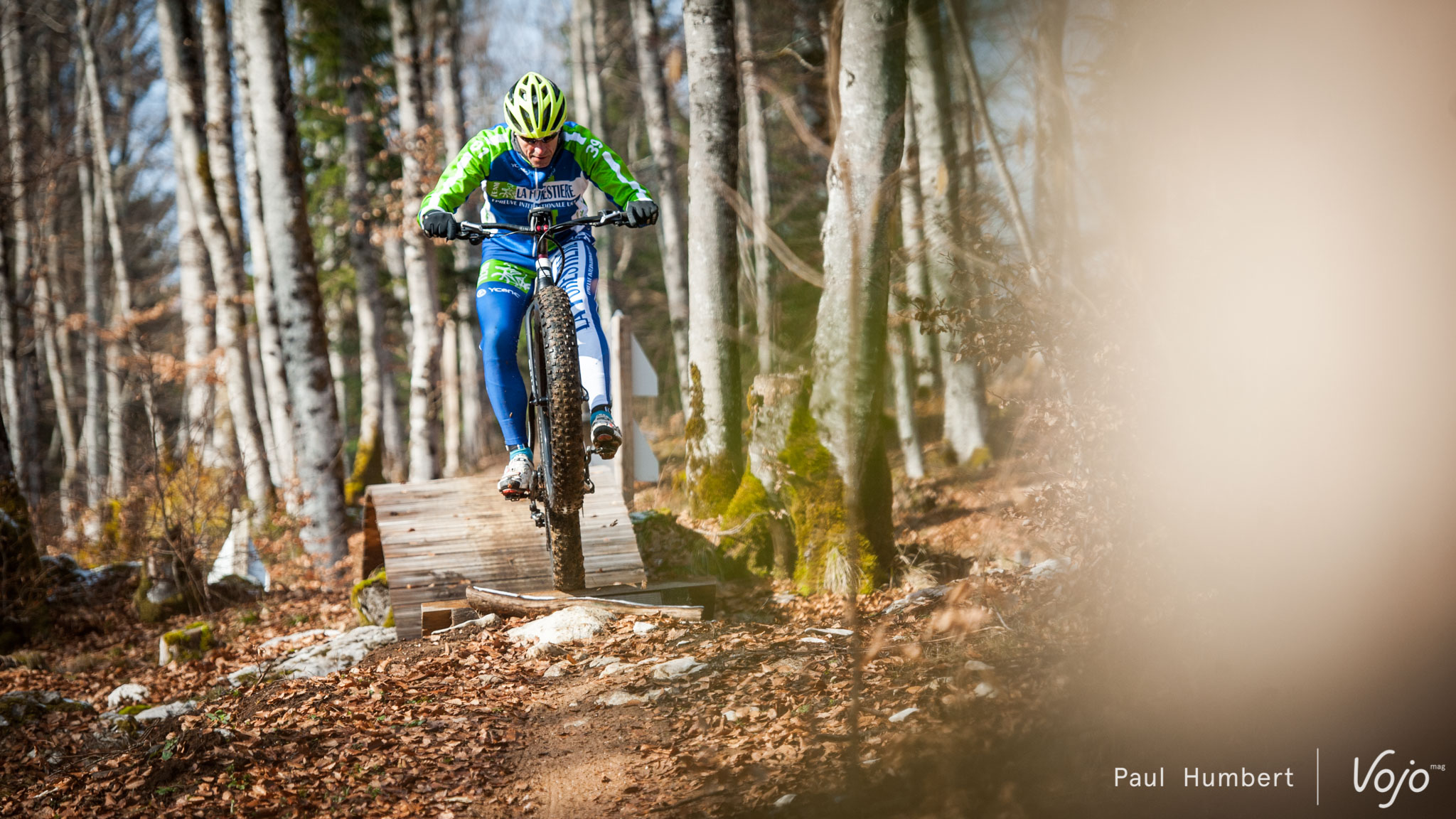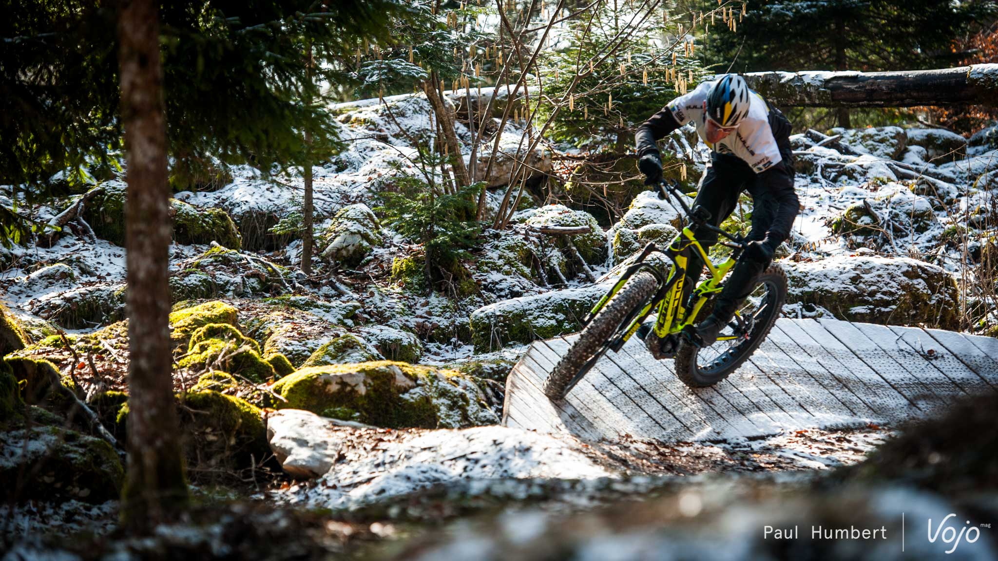 Arrivés dans le village, nous nous changeons, direction le printemps ! Nous quittons la neige et nos montures si pertinentes jusque là deviennent alors un peu étranges sur les feuilles mortes du bikepark de Longchaumois où la Forestière passera cette année.