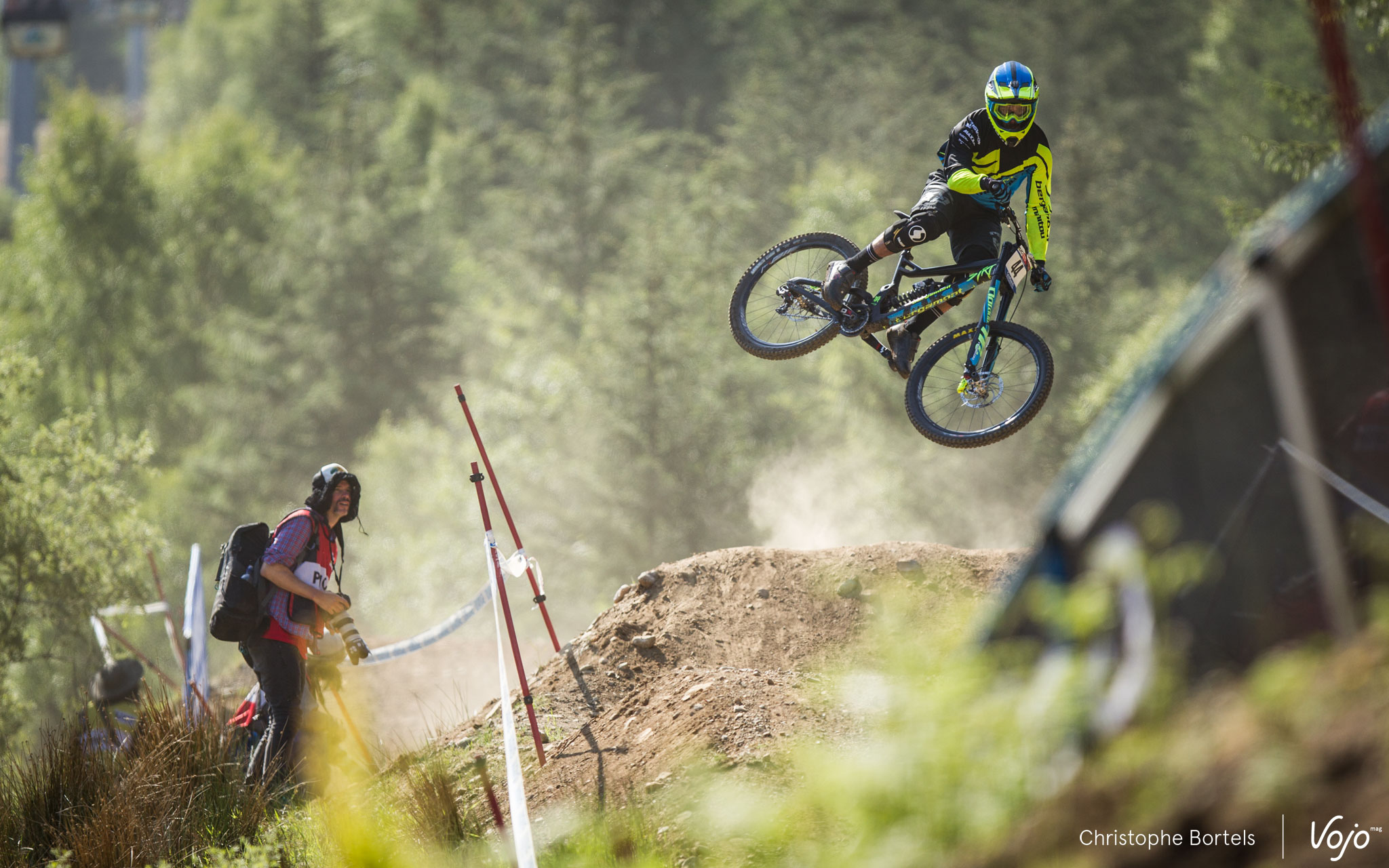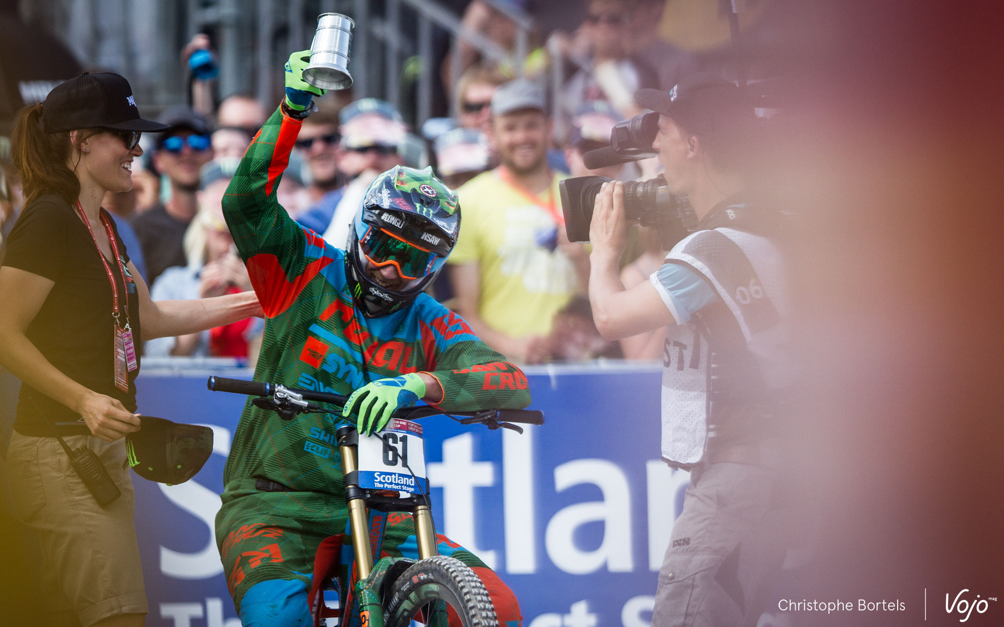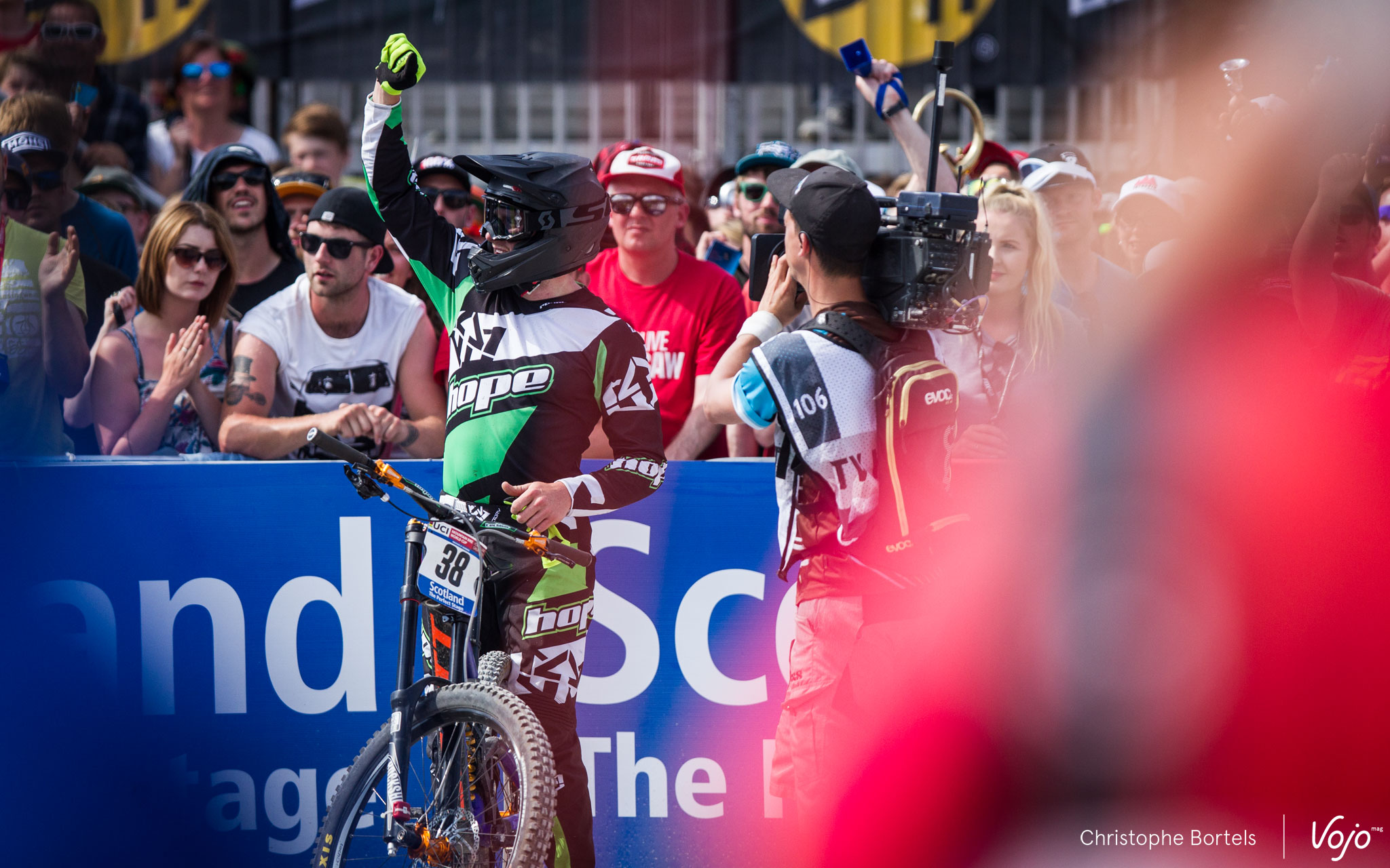 Steve Peat mettra un terme à sa carrière à la fin de cette saison, c’était donc la dernière occasion pour les fans de le voir sur ses terres. Véritable légende de la descente à presque 42 ans, dont plus de 20 (!) passées en coupe du monde, il a eu droit à plusieurs ovations pendant et après la finale. Nos tympans en vibrent encore… On en oublierait presque le meilleur : il termine 29e !
