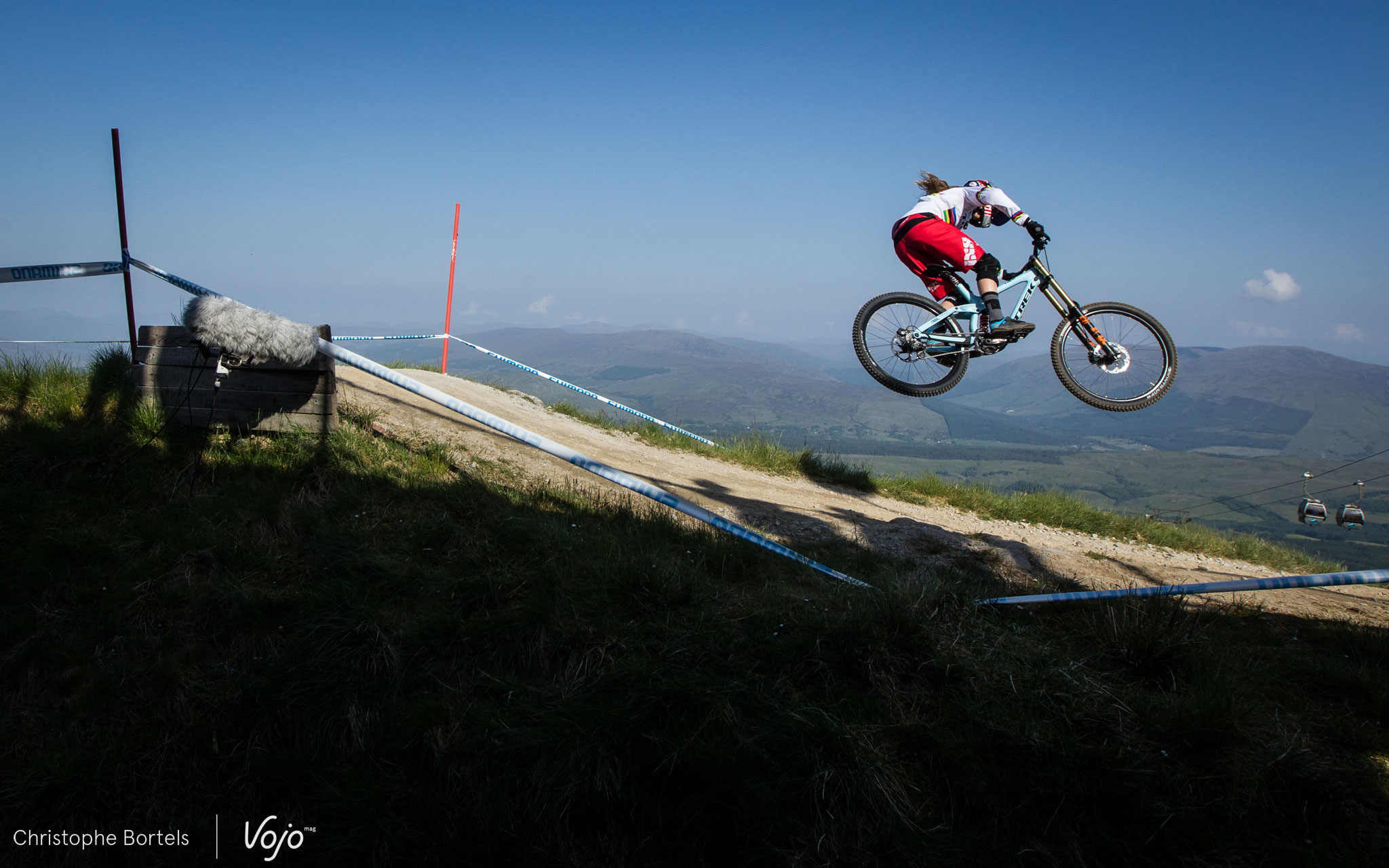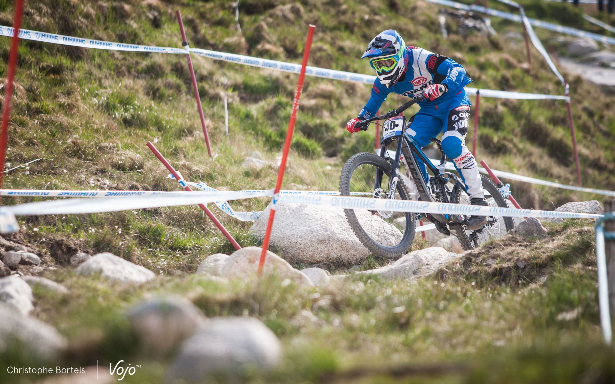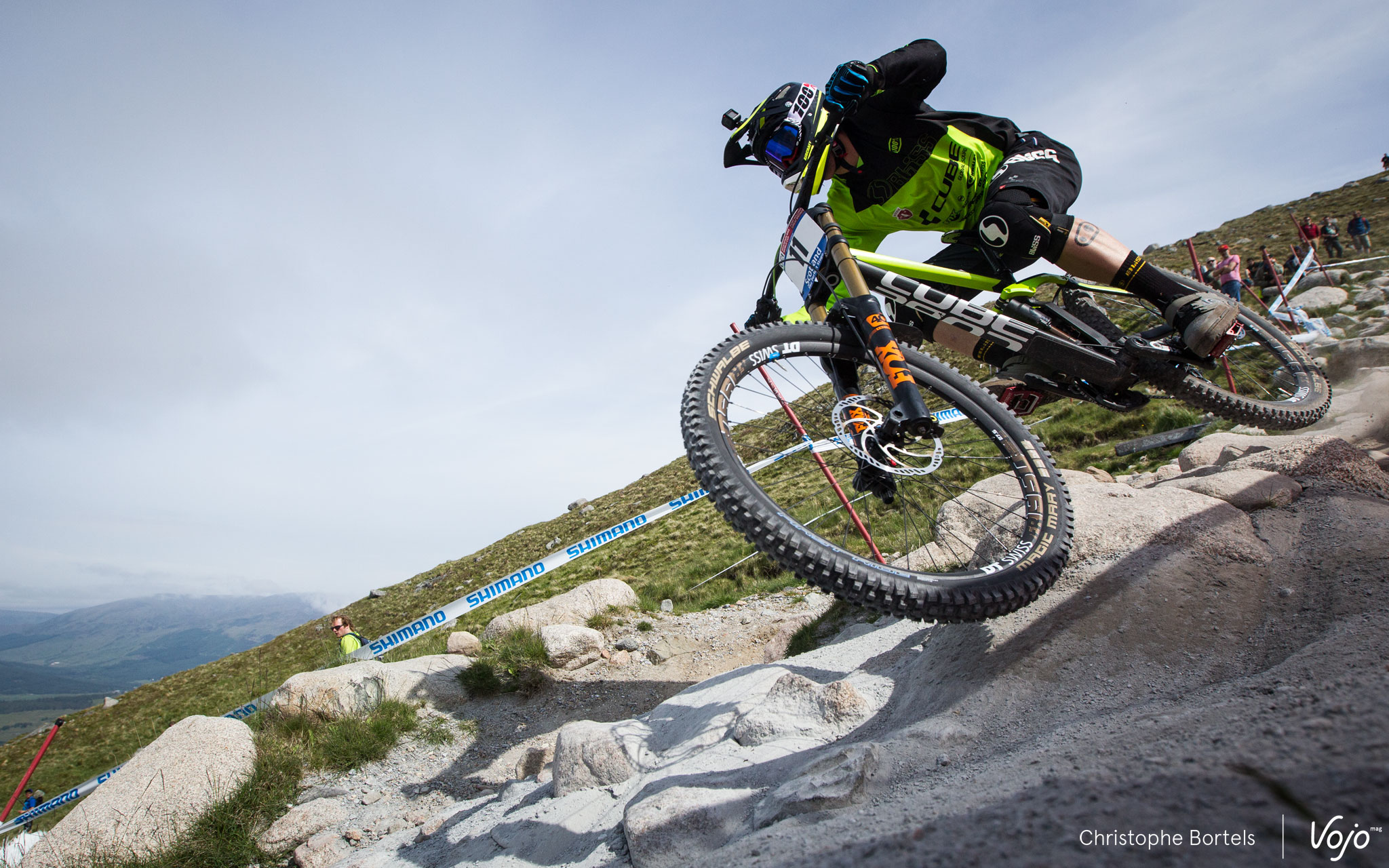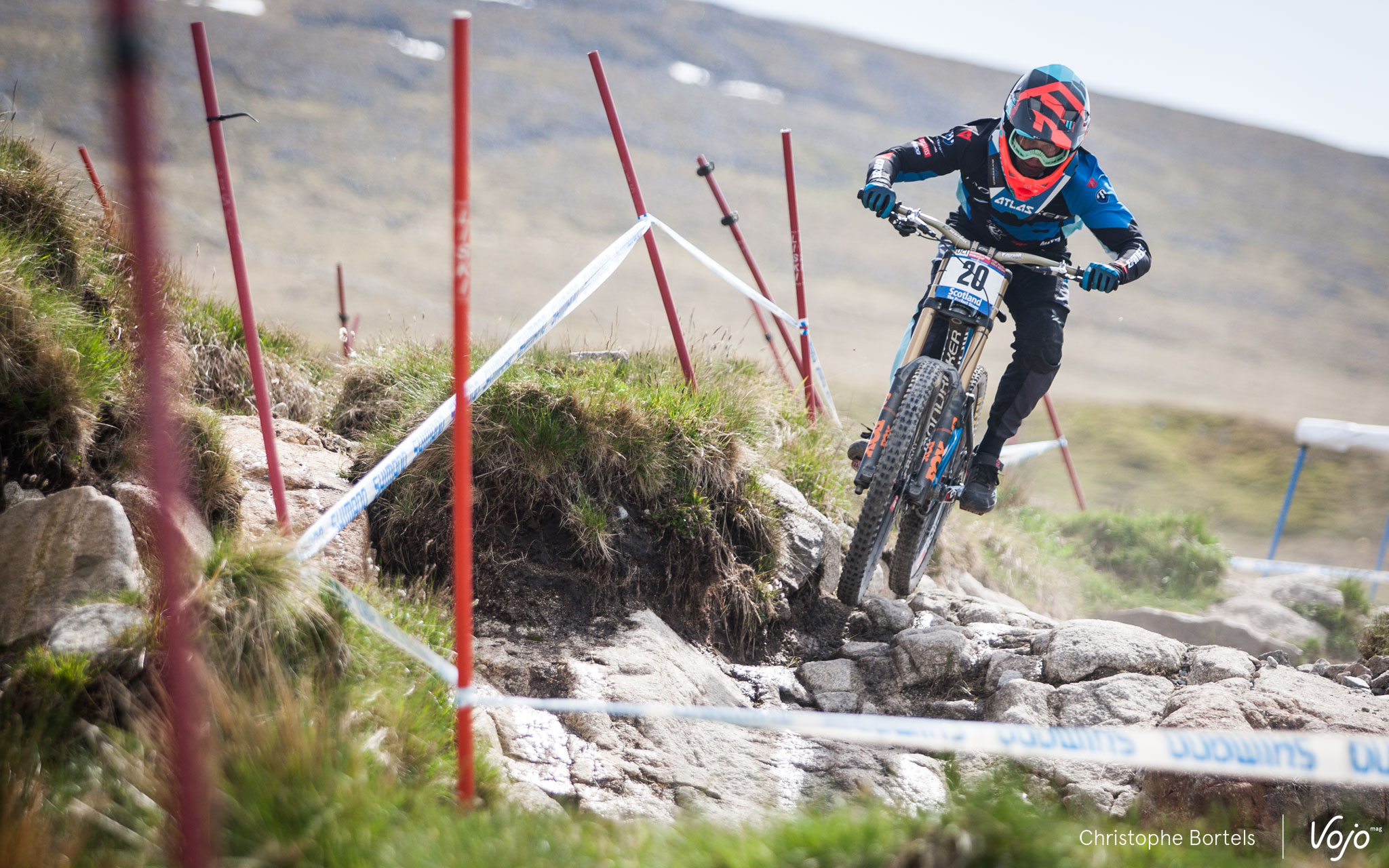 Une fraction de seconde avant le crash… Après deux victoires consécutives en juniors à Fort William ces dernières années, Martin Maes était – d’après les temps intermédiaires – en route pour un top 25 chez les élites. Une grosse chute et un poignet cassé en décideront autrement… Si vous avez loupé ses premières réactions après la course, elles sont à lire ICI.