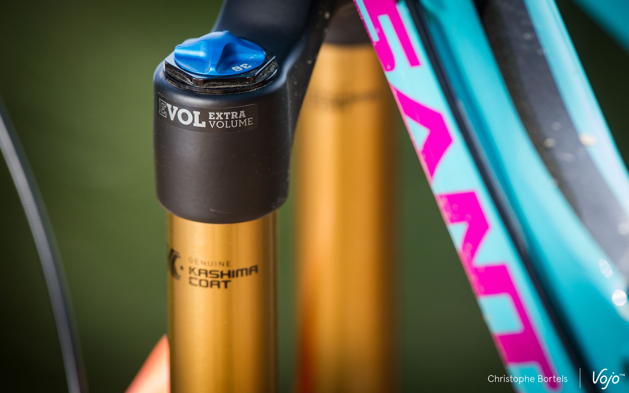 Mais avant de détailler la gamme et les options, parlons directement de la principale nouveauté : l’apparition de la technologie EVOL (Extra Volume) sur la 36. Jusqu’ici réservée aux amortisseurs pneumatiques de la marque, elle consiste en un plus grand volume d’air dans la chambre négative. Le but est de créer une courbe plus linéaire sur la première partie du débattement, permettant de gagner en sensibilité sur les petits chocs, tout en conservant ensuite du soutien en milieu de course et une bonne résistance au talonnage. Ces deux derniers aspects peuvent évidemment être affinés via l’ajout (ou le retrait) de tokens dans la chambre d’air. Fox annonce avoir également travaillé sur le « tuning » de ses cartouches FIT et revu la courbe de compression pour encore améliorer le comportement de la 36.