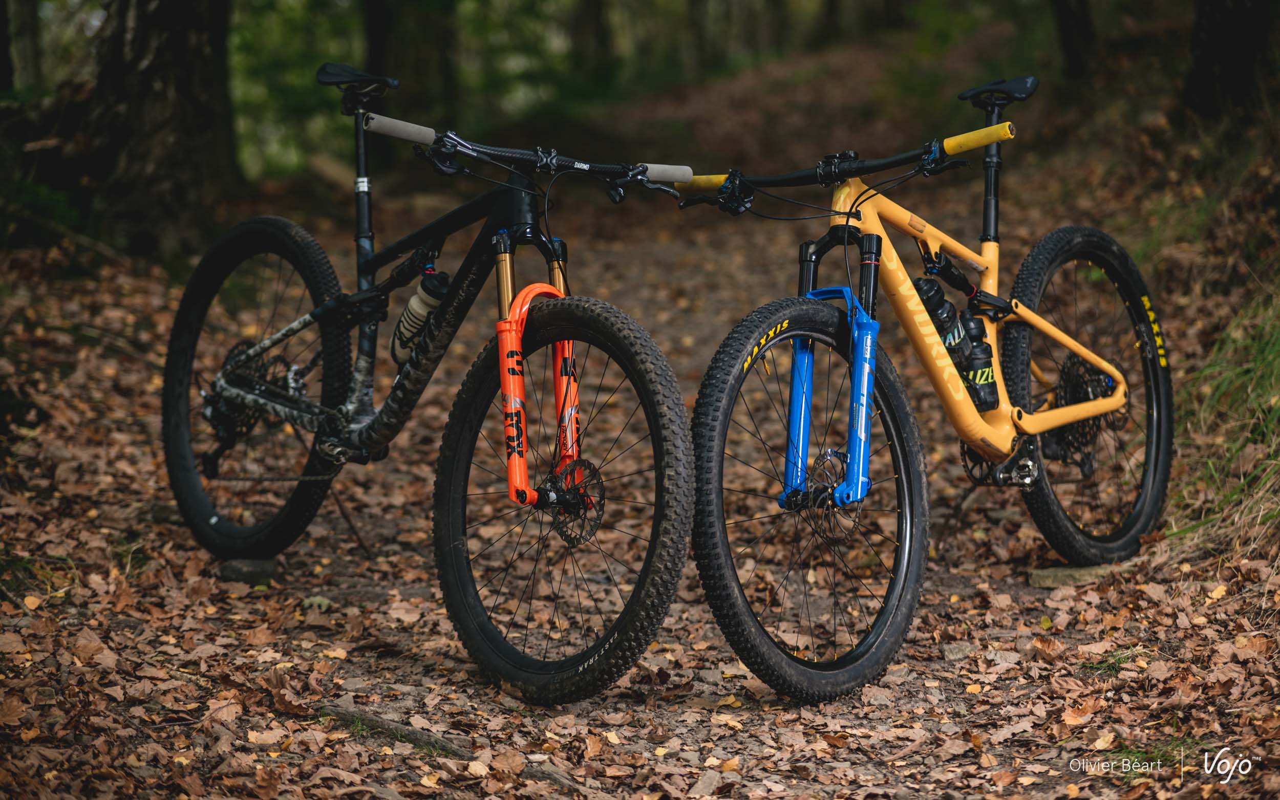 Afin de pouvoir comparer notre duo de fourches de la manière la plus équitable possible, les deux fourches haut de gamme ont été montées sur un duo de Specialized Epic Evo. En statique, le niveau de finition des deux fourches est excellent. Elles se distinguent chacune par une couleur distinctive bien flashy, mais pour ceux qui préfèrent la sobriété, elles sont aussi toutes les deux disponibles en noir. Les deux partagent aussi quelques recettes de conception, comme le bas des fourreaux évidé en profondeur, mais la Fox joue plus sur les rondeurs, quand la SID mise sur un design plus anguleux. Après avoir examiné leurs enveloppes et l’aspect, place aux réglages.