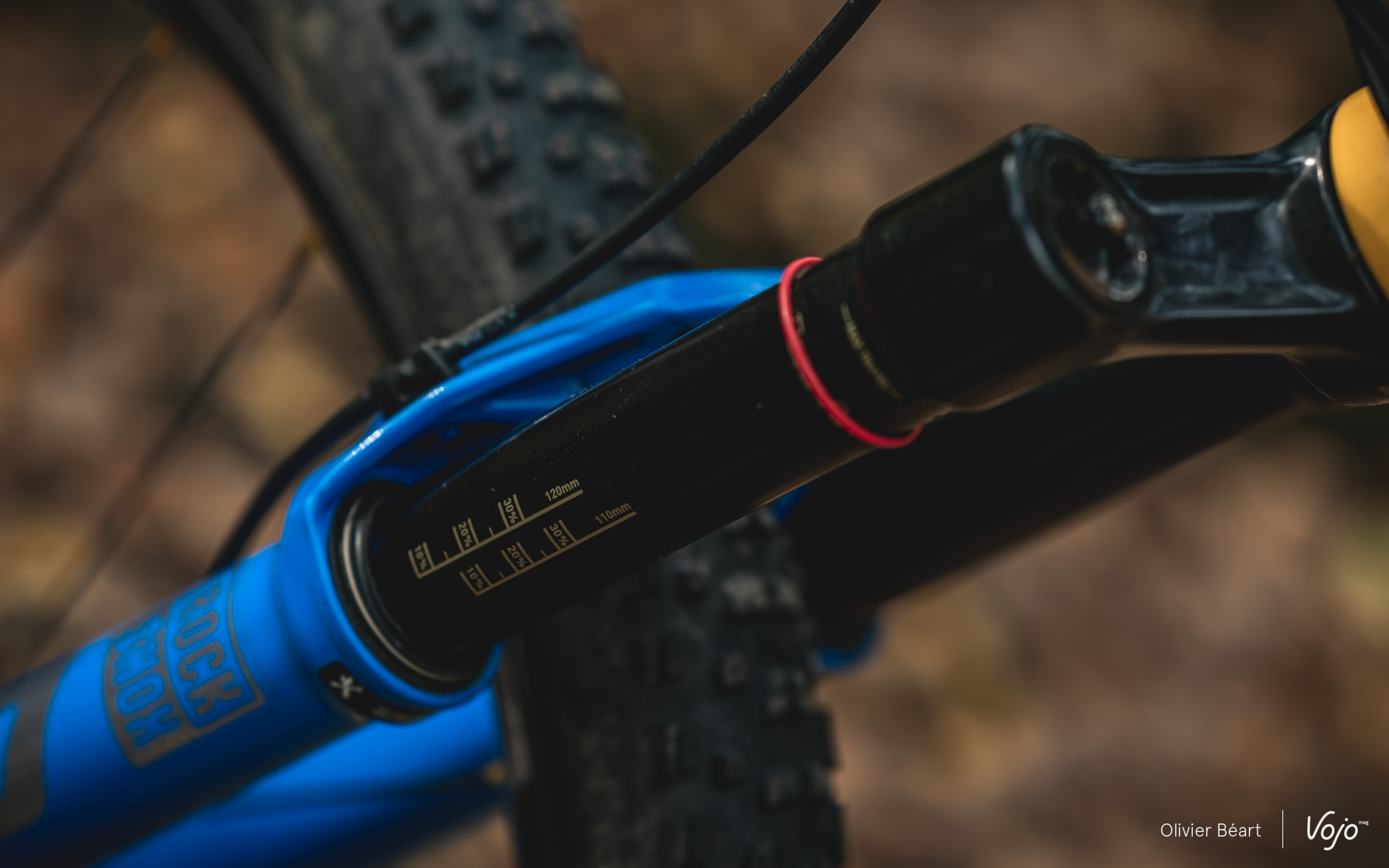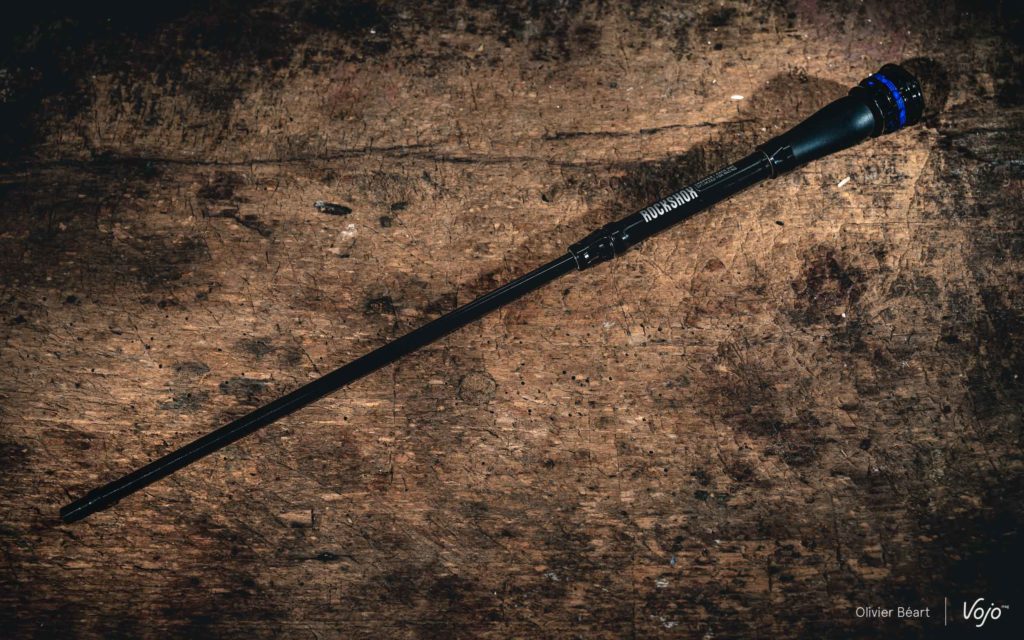 Contrairement à Fox qui dote les plongeurs de sa version haut de gamme d’un traitement particulier (à savoir Kashima), chez RockShox tout le monde est à la même enseigne ! Les plongeurs « Fast Black » de la marque se retrouvent sur l’ensemble de la gamme du constructeur de Colorado Springs. On peut remarquer une graduation (bien pratique) relative au réglage du sag.