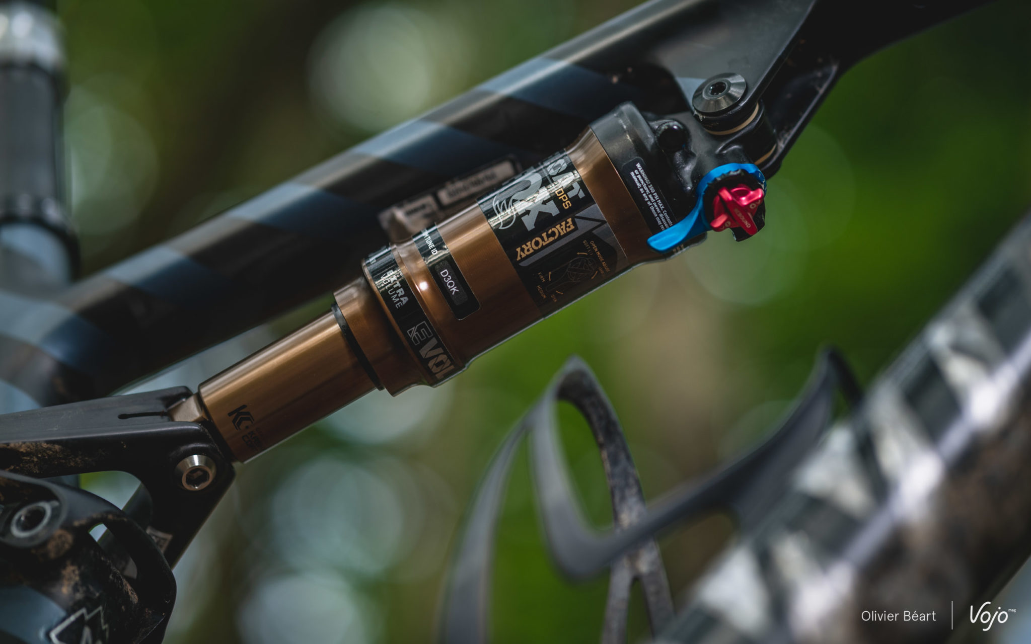 Côté ressort pneumatique, on retrouve toujours le système EVOL, utilisé sur une majorité de la gamme de chez Fox. Cette abréviation correspond simplement à « Extra VOLume » puisque la chambre négative a été agrandie par rapport aux modèles Float précédents. Le but de cet agrandissement était d’offrir une sensibilité améliorée sur les petits chocs. Il est aussi toujours possible de réduire le volume d’air de cette chambre positive au moyen de « tokens » afin de rendre la fin de course plus ferme et/ou d’accentuer la sensibilité sur les petits chocs. Pour 2022, Fox a décidé de revoir cette chambre négative afin d’améliorer le support à mi-course. Comme pour la chambre positive, son volume est adjustable au moyen de « tokens » – plutôt utile pour les pilotes roulant avec des pressions élevées dans la chambre positive.