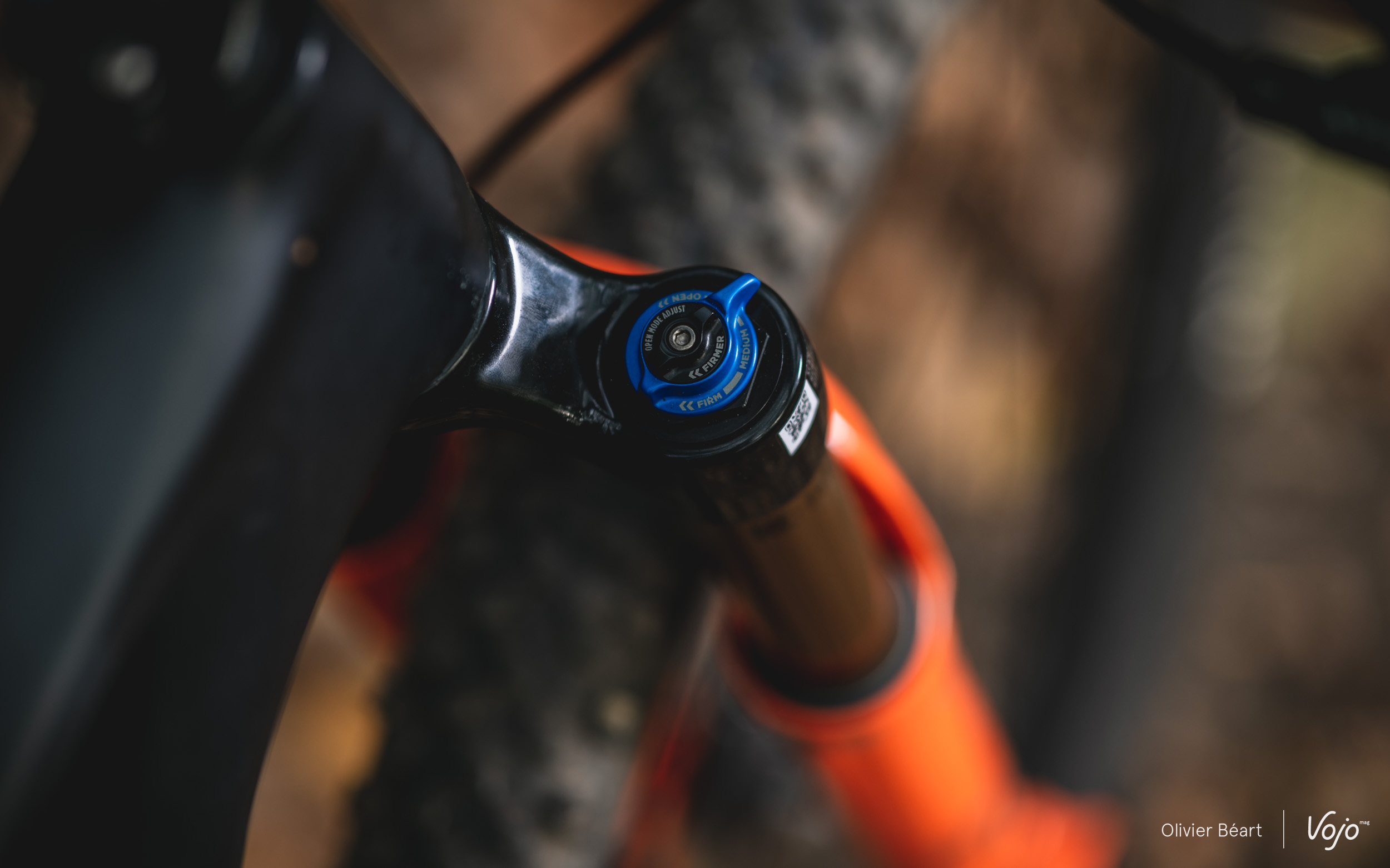 L’hydraulique de cette 34 SC haut de gamme est réglable sur 3 position : open, medium et firm. Ce réglage est matérialisé par une molette bleue sur le haut du té droit de la fourche. Il est complété par une molette noire, permettant de régler la compression basses vitesses. Une commande de blocage au guidon est également proposée à la vente en option. Dans ce cas, sauf exceptions chez certaines marques (Scott, Orbea par exemple), on revient à seulement deux positions.