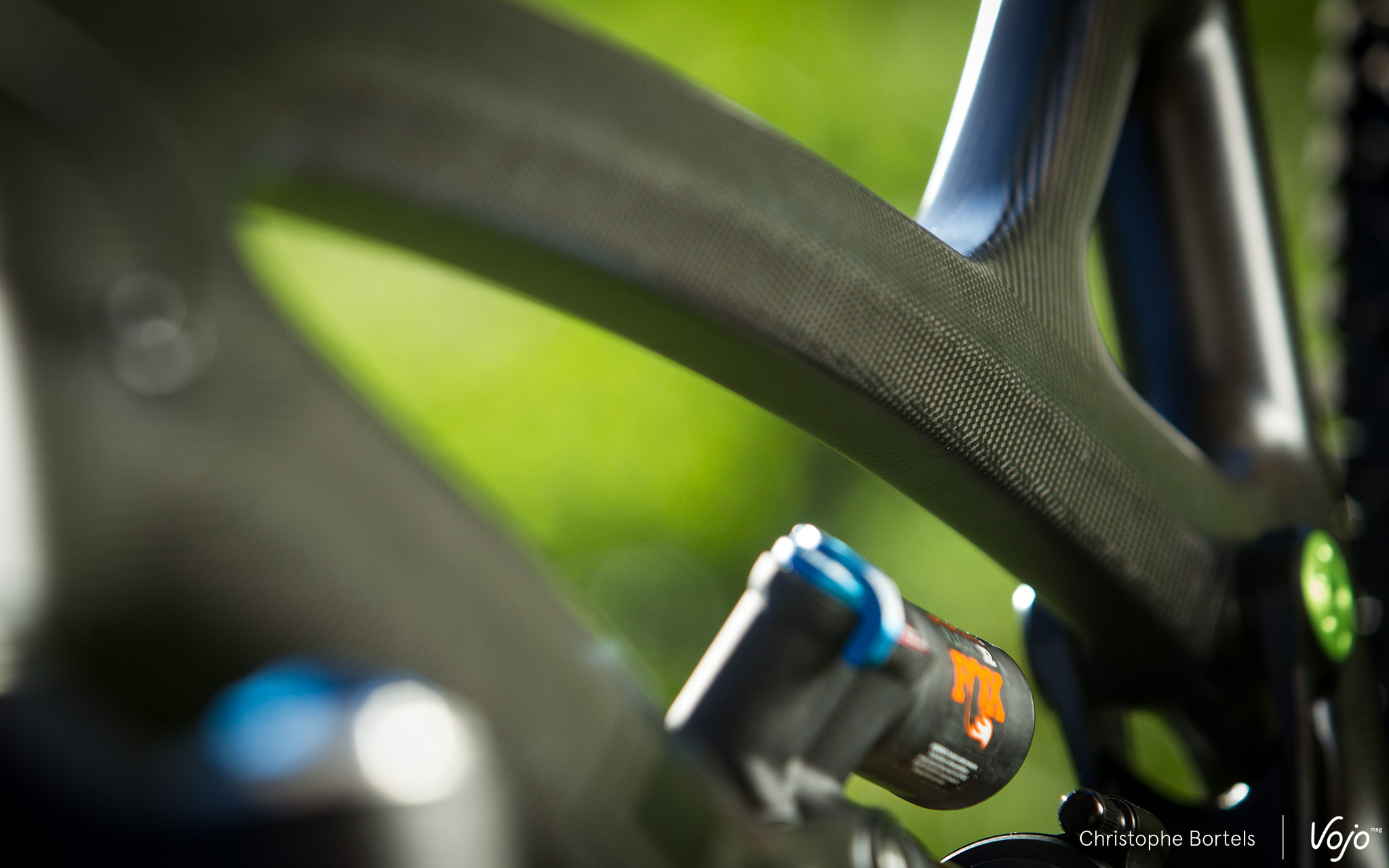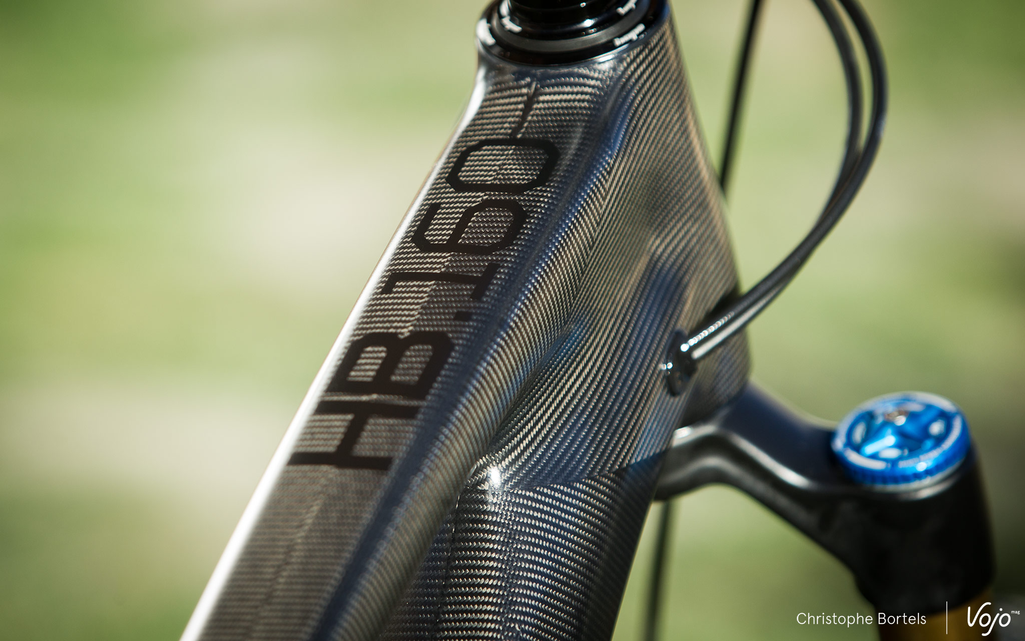 Le résultat de tout ce travail, c’est un superbe triangle avant monocoque, dont les fibres sont apparentes pour bien montrer qu’il ne s’agit pas de morceaux produits séparément puis assemblés ultérieurement avant d’être recouverts de peinture. Le souci du détail est poussé très loin puisque le sens des fibres a été récemment revu sur le dessus du top tube, là où la jonction entre les deux « moitiés » de cadre est visible, pour adopter une forme en chevron plus harmonieuse à l’oeil que ce qu’on peut voir sur la photo ci-dessus, sur notre vélo test de pré-production.