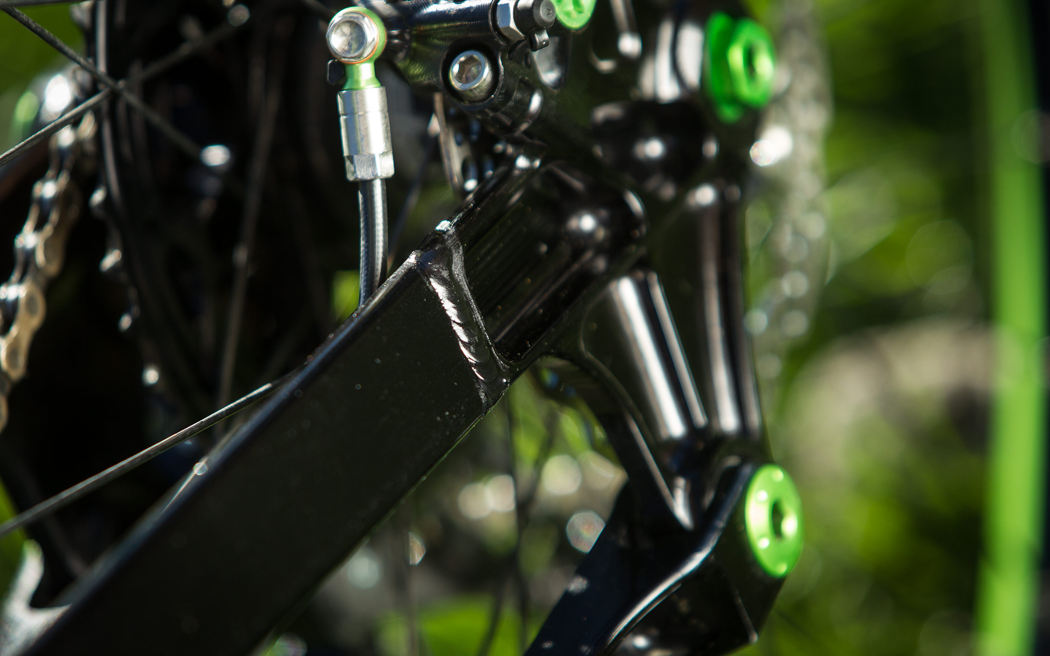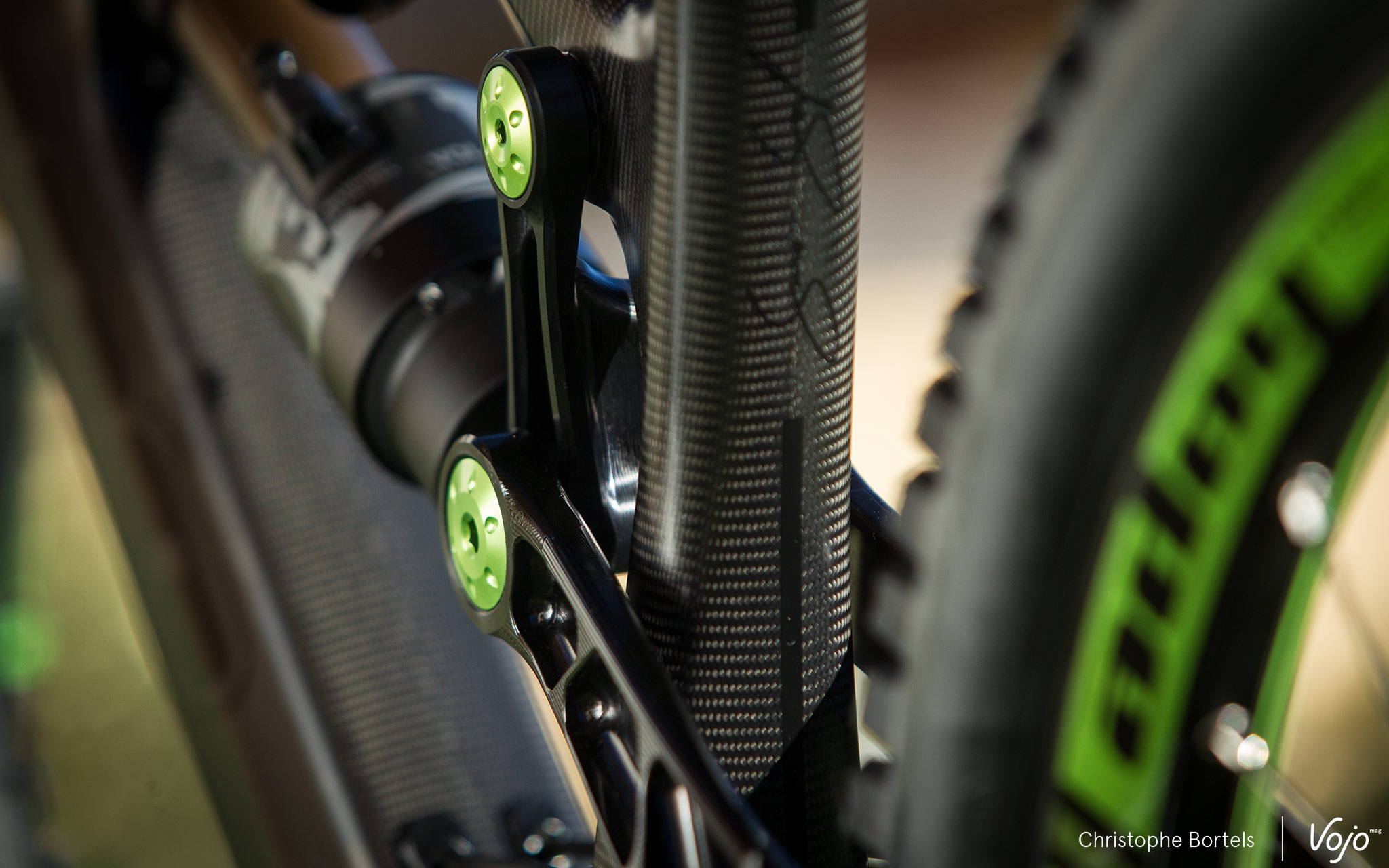 Mais si le triangle avant est en carbone, c’est l’alu qui a été choisi pour l’arrière, essentiellement pour des questions de résistance aux impacts. Les différentes pièces usinées CNC formant les haubans étaient dans un premier temps soudées entre elles, mais le processus de soudure faisait légèrement raccourcir les haubans et faussait l’alignement de l’ensemble, ce qui obligeait à tout redresser dans la foulée. Hope a donc revu sa copie et les éléments seront finalement emmanchés-collés sur le HB.160 de production. Un choix également plus « propre » esthétiquement.