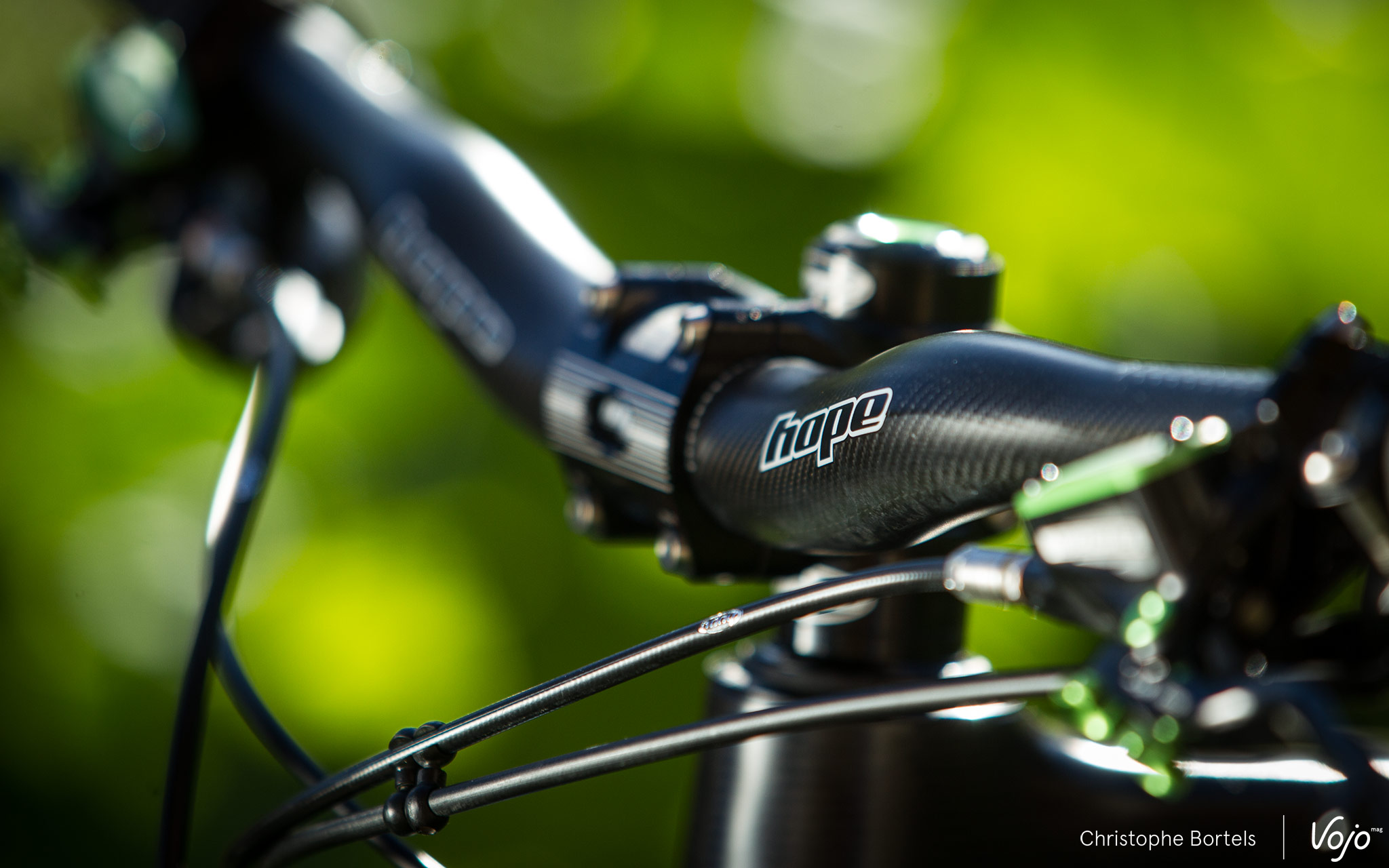 Un seul montage sera proposé, et on y retrouve bien entendu une grande majorité de composants Hope. Le cadre donc, mais aussi les freins Tech 3 E4 et les disques de la marque en 180/160mm, les jantes 35w, les moyeux Pro 4, le pédalier Hope avec un plateau de 30 dents et son boîtier de pédalier, la cassette 11v en 10-44, le jeu de direction, les grips, les pédales plates F20, la potence Hope AM, sans oublier le très attendu cintre Hope carbone (780mm / 20mm de rise) enfin commercialisé.