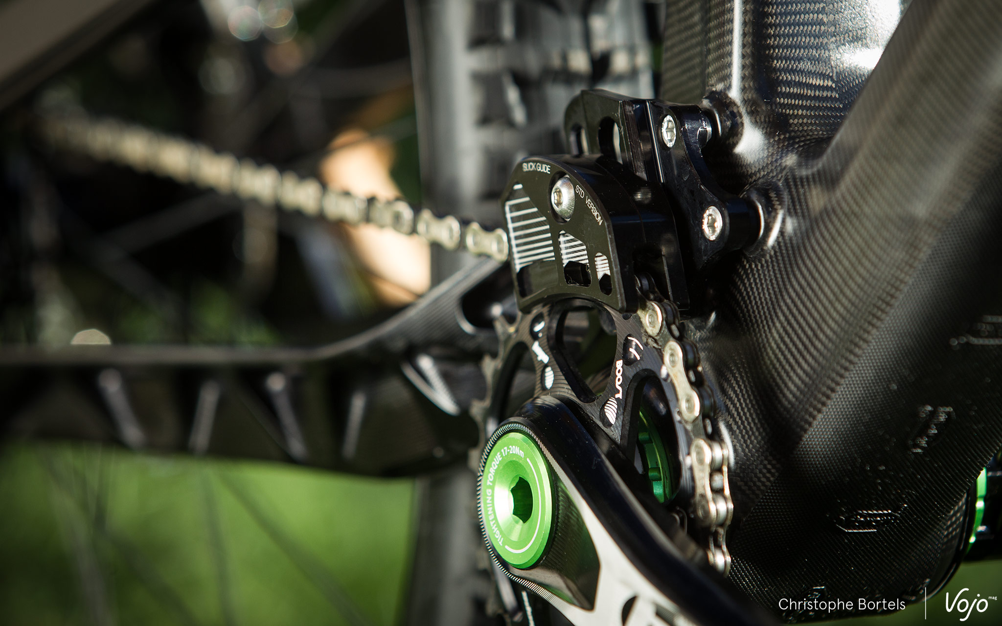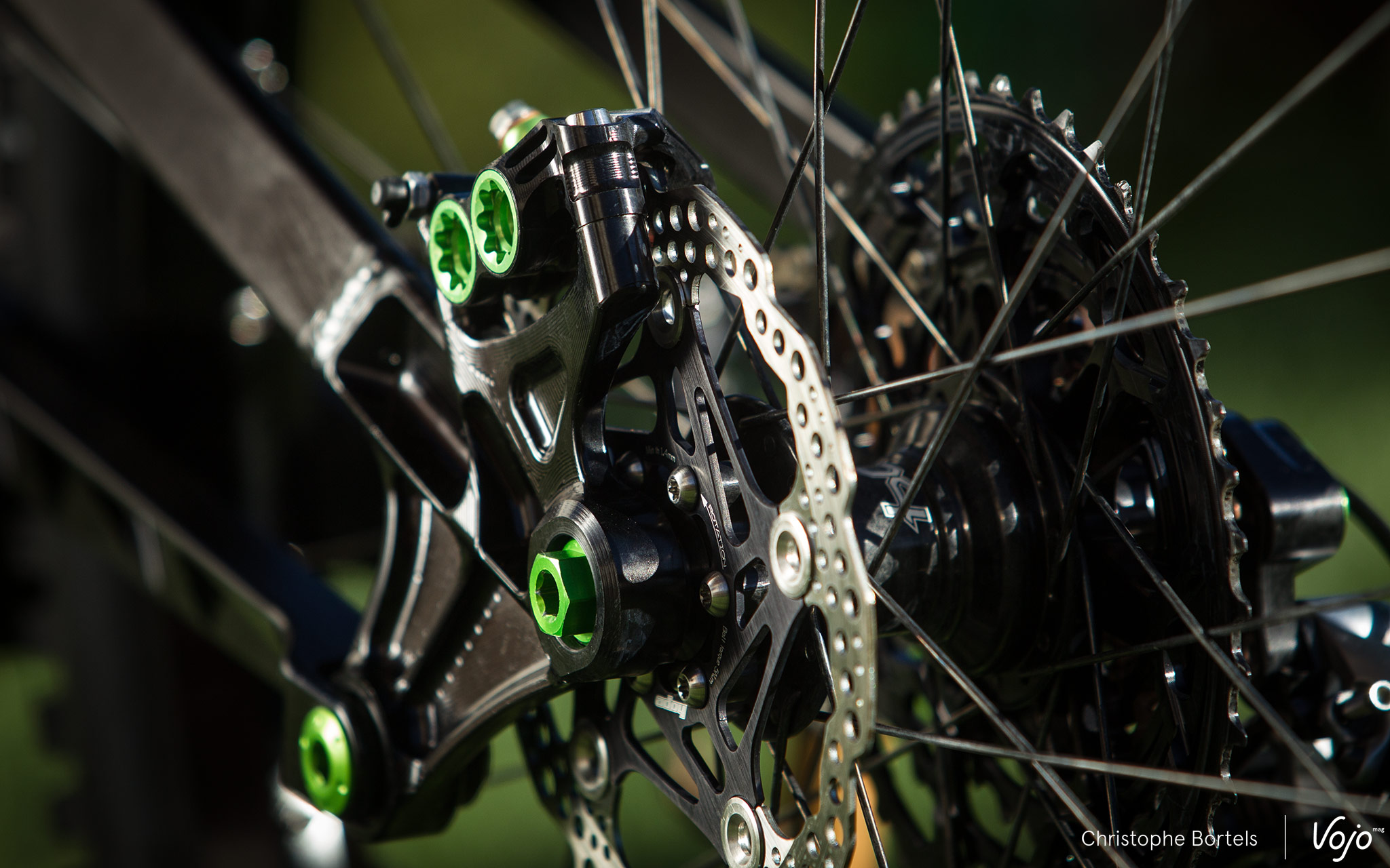 C’est définitivement à l’arrière qu’on retrouve les choix techniques les plus intéressants, notamment au niveau du moyeu et de l’axe arrière. Hope a tout d’abord déplacé la base droite vers l’extérieur pour faire de la place autour du boîtier de pédalier, décalant et améliorant la ligne de chaîne du même coup (c’était avant le Boost, précise Hope), puis a ramené le disque et l’étrier de frein au plus près des rayons. Résultat : un entraxe de 130mm, couplé à un axe de… 17mm pour améliorer la rigidité. Encore un nouveau standard ? Loin de là, n’oublions pas qu’il s’agit ici d’un vélo qui se veut comme un concept mécanique, fruit d’une entreprise qui maîtrise la production du cadre ET des composants. Hope peut donc s’affranchir des standards, et ne doit pas composer avec les pièces disponibles sur le marché. Le crédo de ce projet, on le rappelle : pas de compromis !