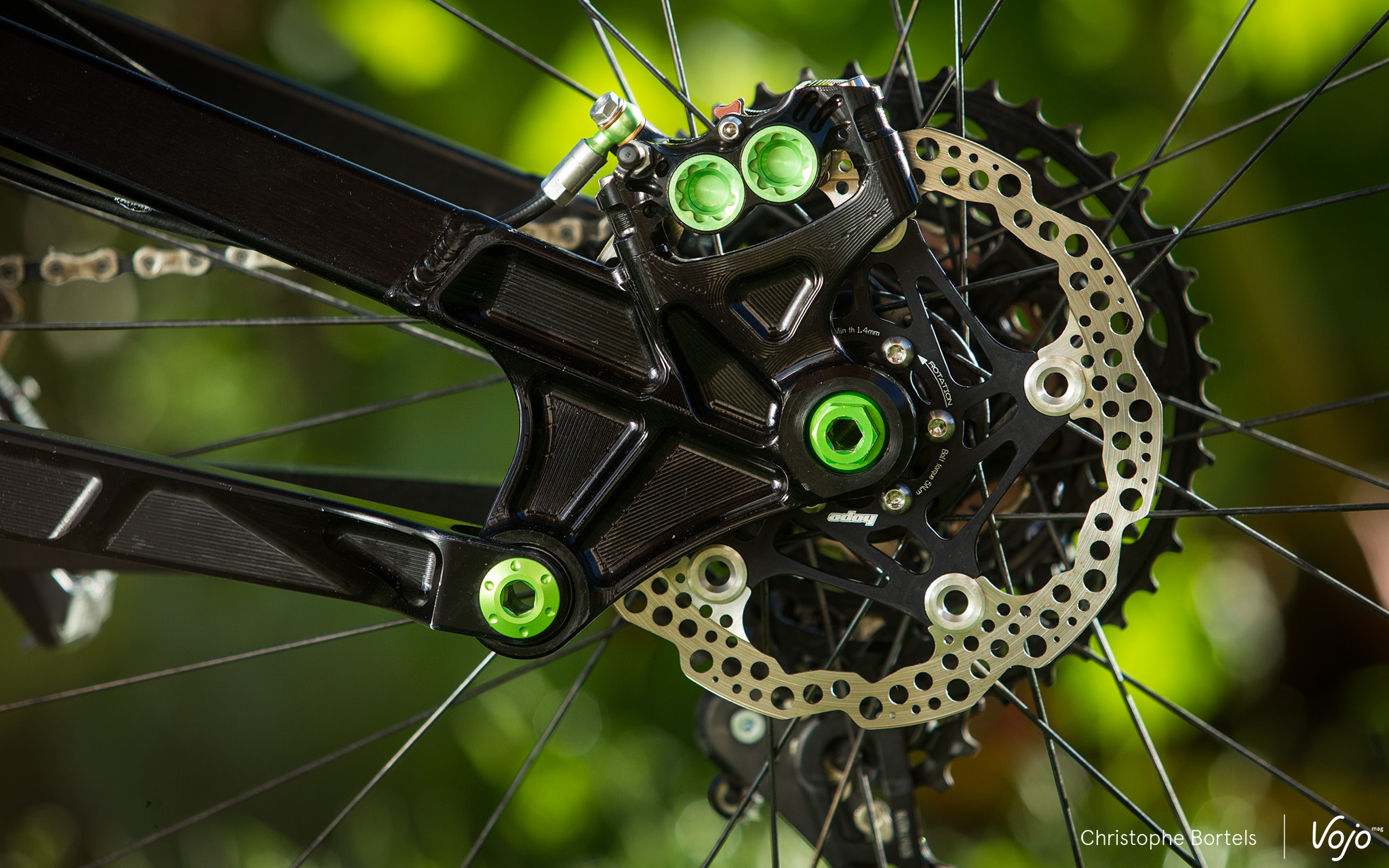 Hope produit des freins d’une très grande précision, mais celle-ci peut être compromise par l’usage d’adaptateurs mal… adaptés, ou de réglages mal effectués. C’est pourquoi les ingénieurs ont fait le choix d’une fixation postmount sans aucun réglage latéral possible. Autrement dit, vous posez l’étrier de frein radial (spécifique !) sur la patte du cadre, vous vissez et le frein est directement parfaitement aligné sur le disque. L’intégration est magnifique à l’oeil, l’étrier et la patte ne semblant faire qu’un ! Et pour ceux qui souhaiteraient passer à une taille de disque plus grande (160mm d’origine), il suffit d’ajouter des spacers pour relever l’étrier et le mettre à hauteur du disque.